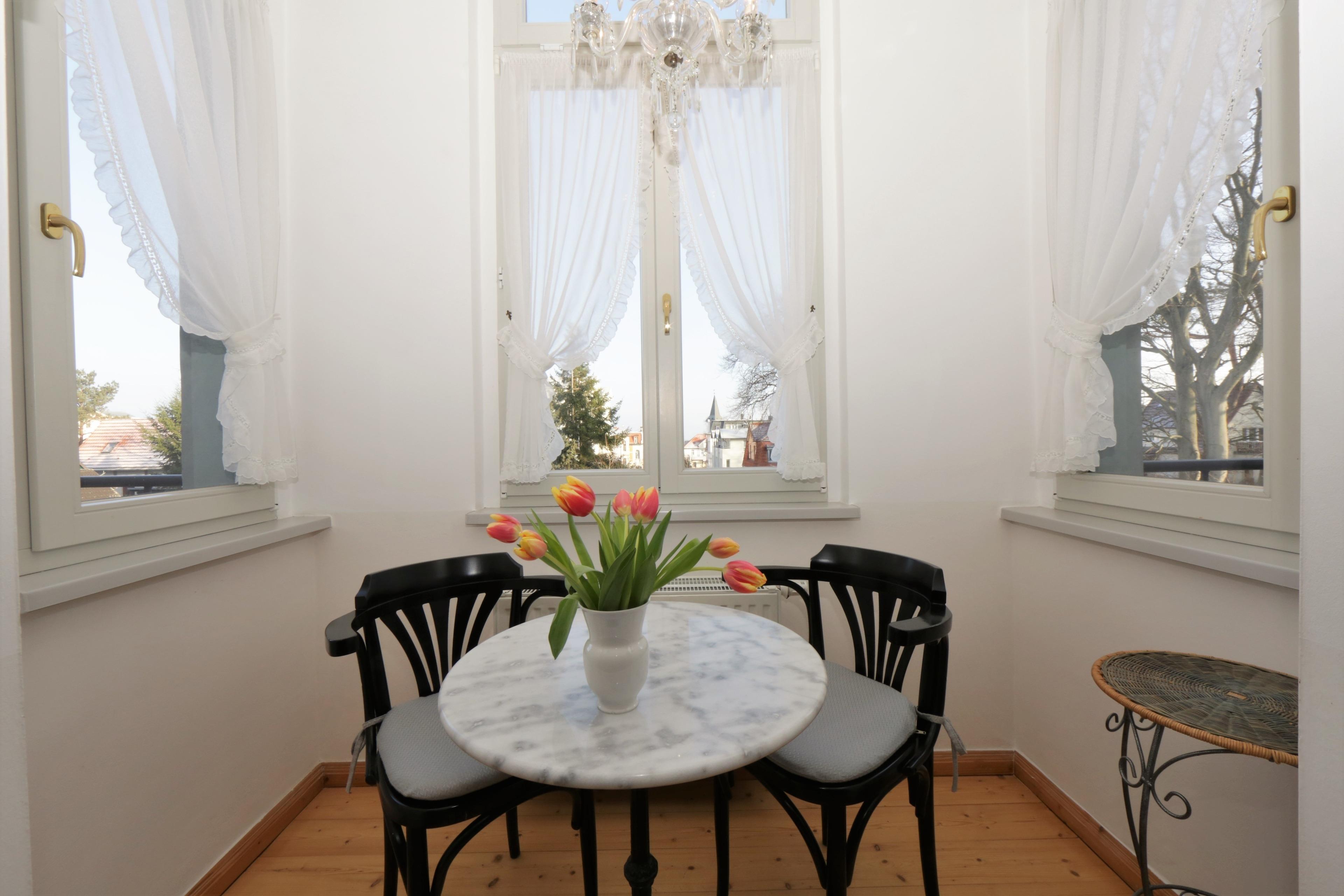 Diese moderne und gemütlich eingerichtete 55 qm große Zwei-Zimmer Wohnung liegt im 1. Obergeschoss und bietet 4 Personen viel Platz für einen entspannten Urlaub. Das helle Wohnzimmer bietet den Gästen ein Ledersofa mit Schlaffunktion (Matratze 140 x 200) und einen Essplatz sowie einen großen Flat TV. Vom Wohnraum begehbar ist der Balkon in Richtung Meer. Hier schweift der Blick die verkehrsruhige Bismarckstraße hinunter bis zur Promenade und die Ostsee. Die halboffene Küche mit Ceranfeld, Spülmaschine, Kühlschrank und Mikrowelle bietet einen kleinen Essplatz im Erker mit dem gleichen schönem Blick in Richtung Ostsee. Das Schlafzimmer mit einem Boxspringbett mit getrennten Matratzen (180 x 200) und reichlich Schrankraum kann mit einem zweiten Balkon ebenfalls mit Meerblick aufwarten. Darüber hinaus steht den Gästen ein Duschbad mit Waschbecken/WC zur Verfügung.