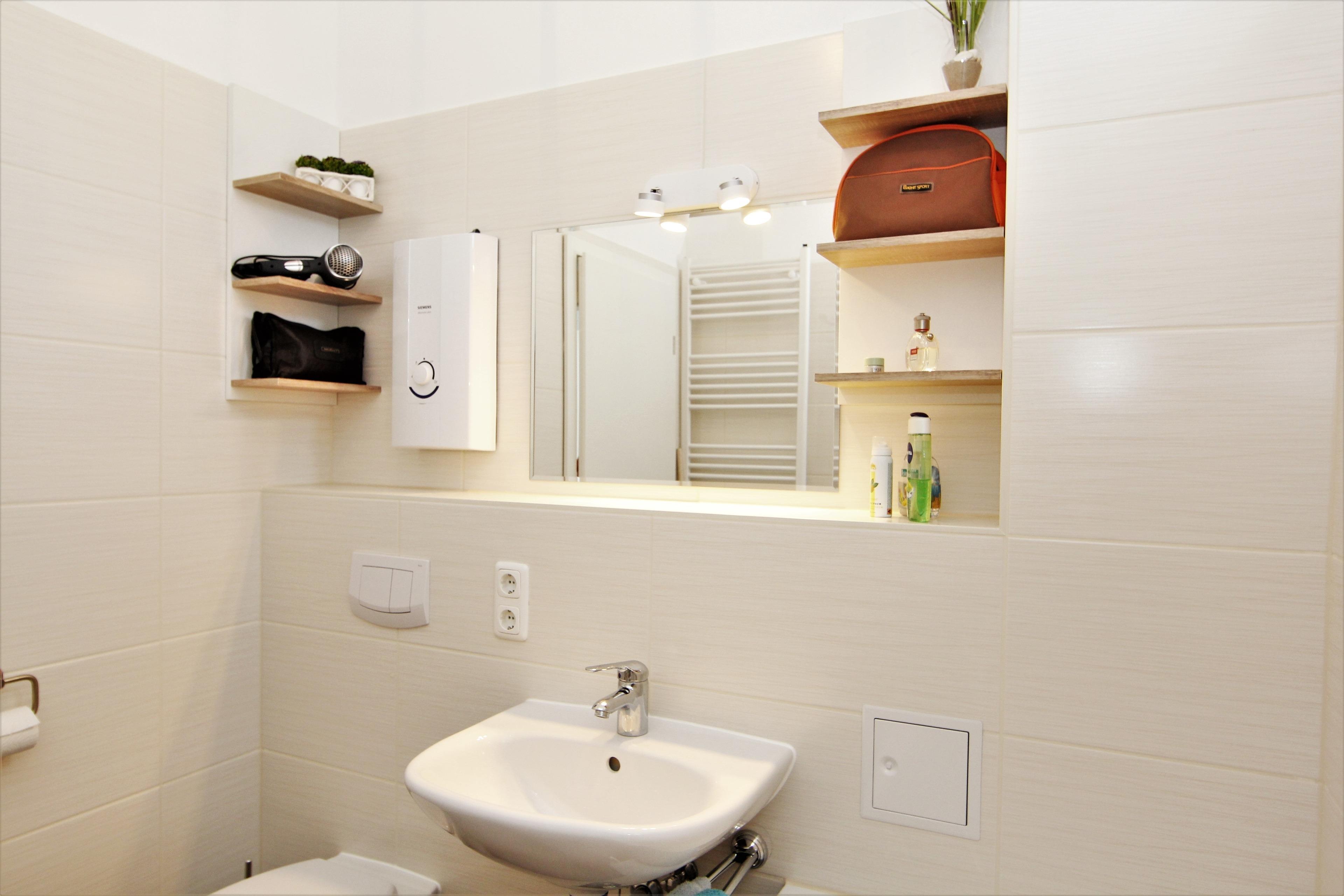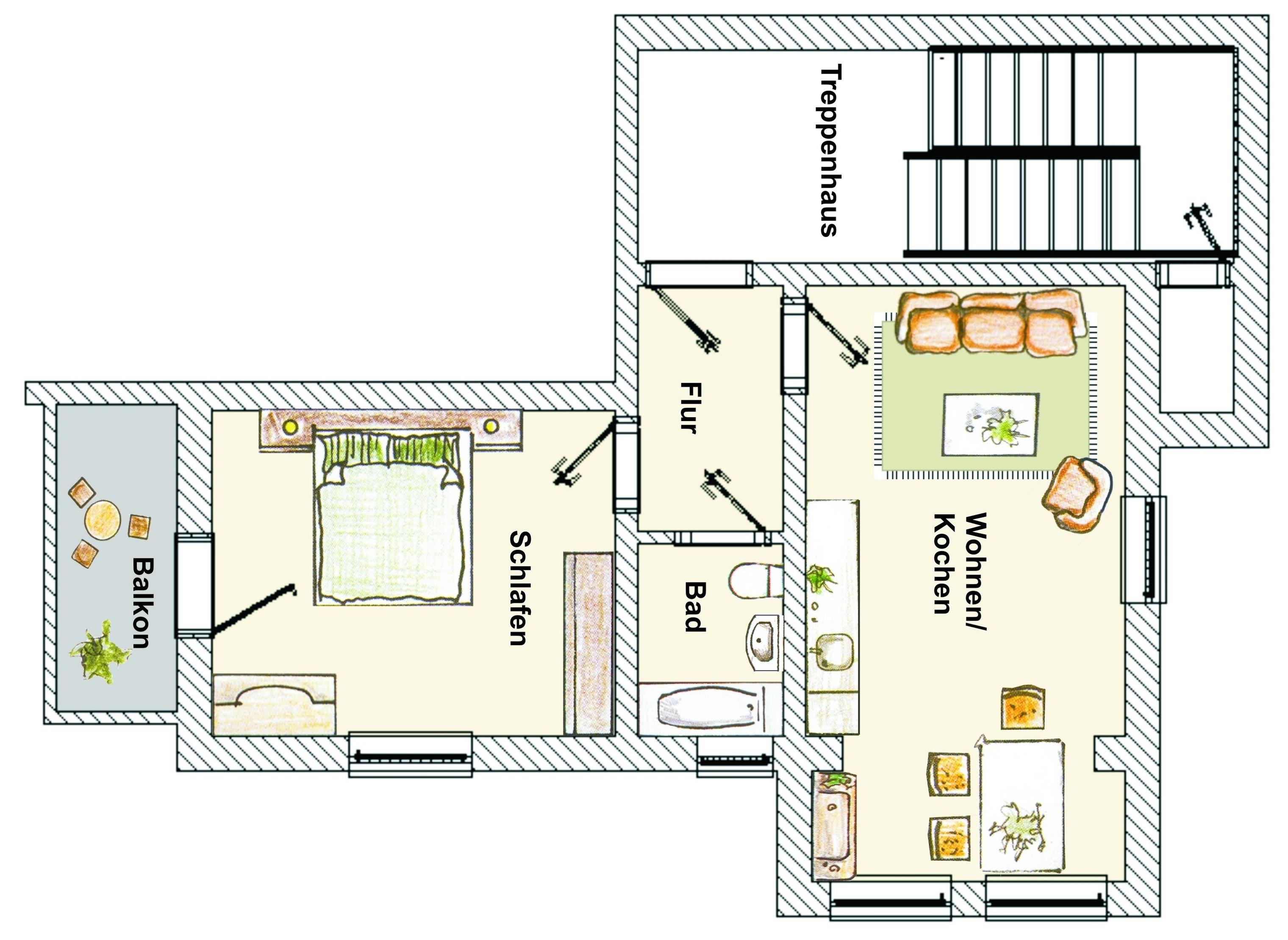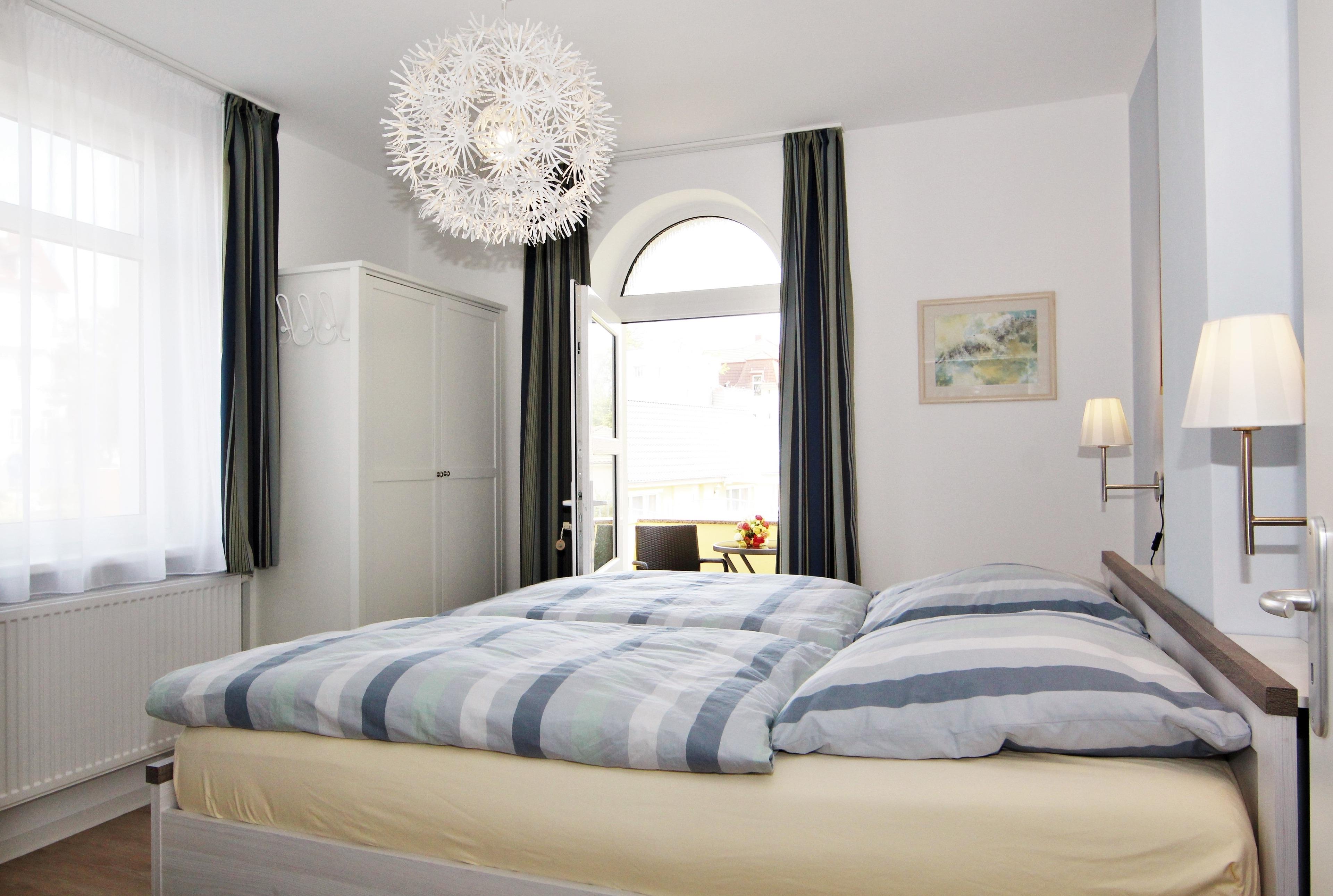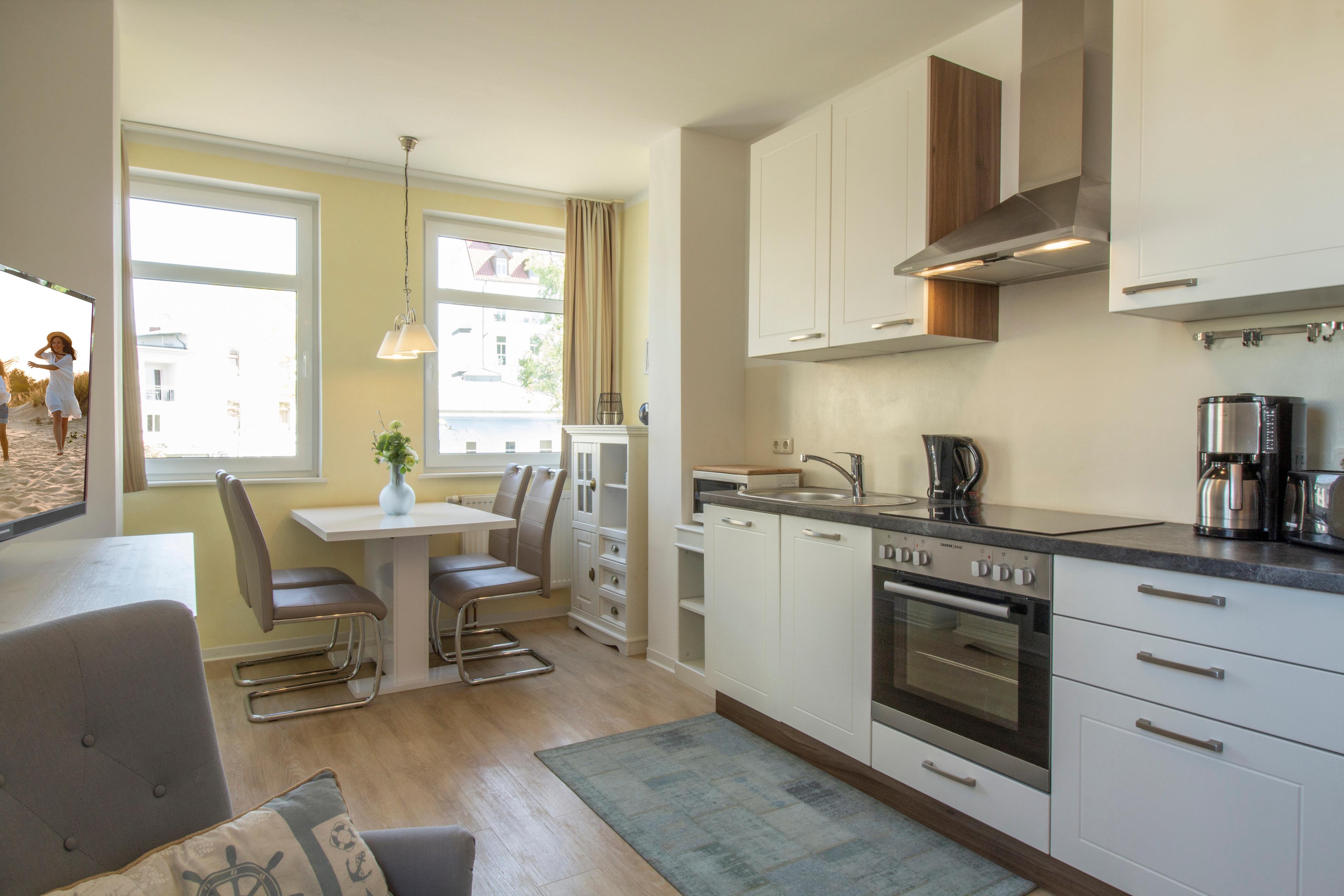 Dieses gepflegte 45 qm große 2-Zimmer-Appartement liegt im Hochparterre und eignet sich für 2-4 Personen. Ausgerichtet zur Ostsee in Richtung Promenade können Sie auf selbige bereits einen Blick erhaschen. Die Wohnung ist hell in modernem Landhausstil eingerichtet. So finden Sie ein Wohnzimmer mit gemütlichem Sofa mit Schlaffunktion (Liegefläche 140 x 195) sowie den einladenden Essbereich direkt vor deckenhohen Fenstern. Die im Wohnbereich integrierte Küchenzeile ist mit Geschirrspüler, Cerankochfeld, Backofen etc. ausgestattet. Das helle Schlafzimmer verfügt über ein Doppelbett mit getrennten Matratzen (90x200) in Komforthöhe und genügend Schrankraum. Für ein jüngeres Kind steht hier wahlweise ein Schlafsessel zum Ausklappen zur Verfügung. Aus dem Schlafzimmer haben Sie Zugang zu einem windgeschützten Balkon in süd-östlicher Ausrichtung, der die Gäste schon mit Morgensonne verwöhnt und zum gemütlichen Verweilen einlädt. Das moderne Bad mit kleinem Fenster bietet eine Badewanne mit Duschabtrennung und Waschtisch/WC. Ein kleiner Abstellraum im Treppenhaus gehört zur Wohnung. Ein Pkw-Stellplatz befindet sich auf dem Grundstück und ist der Wohnung zugeordnet. Einen Fahrradständer gibt es am Haus.