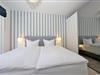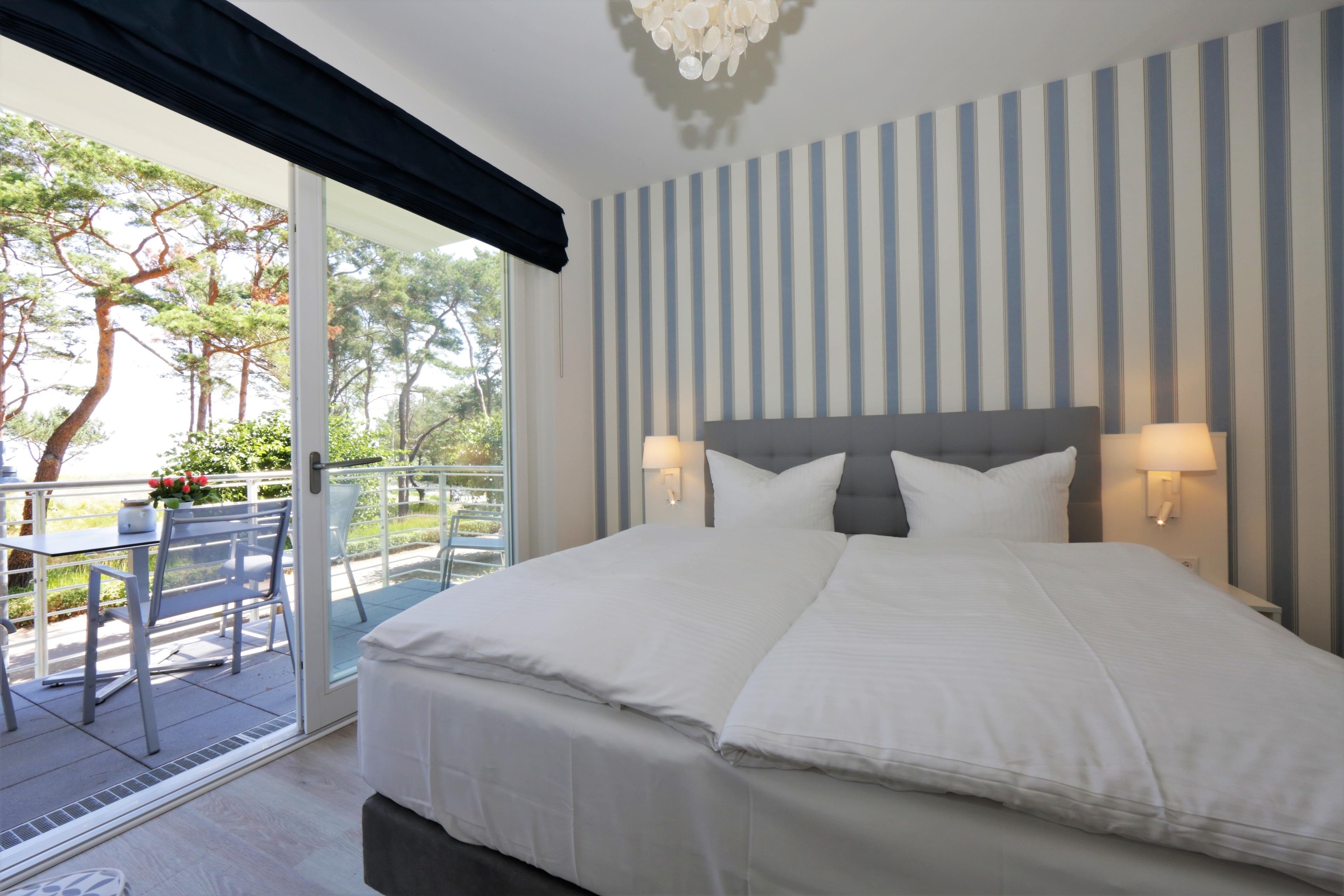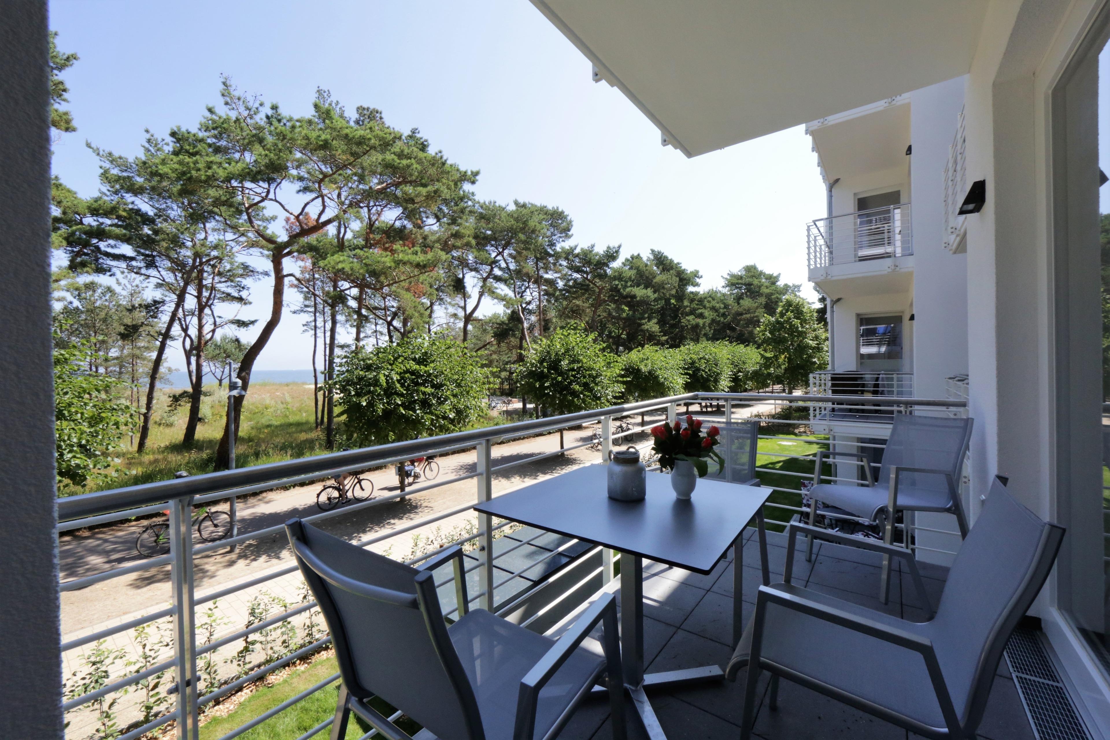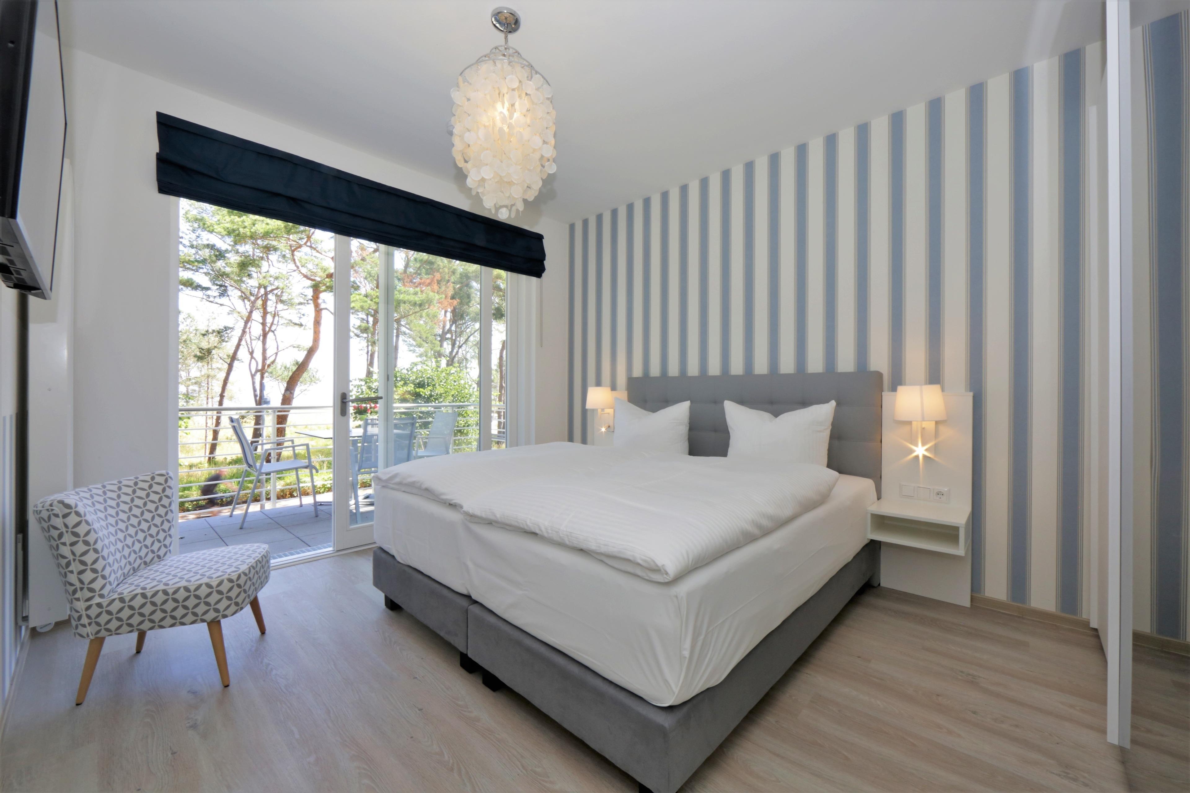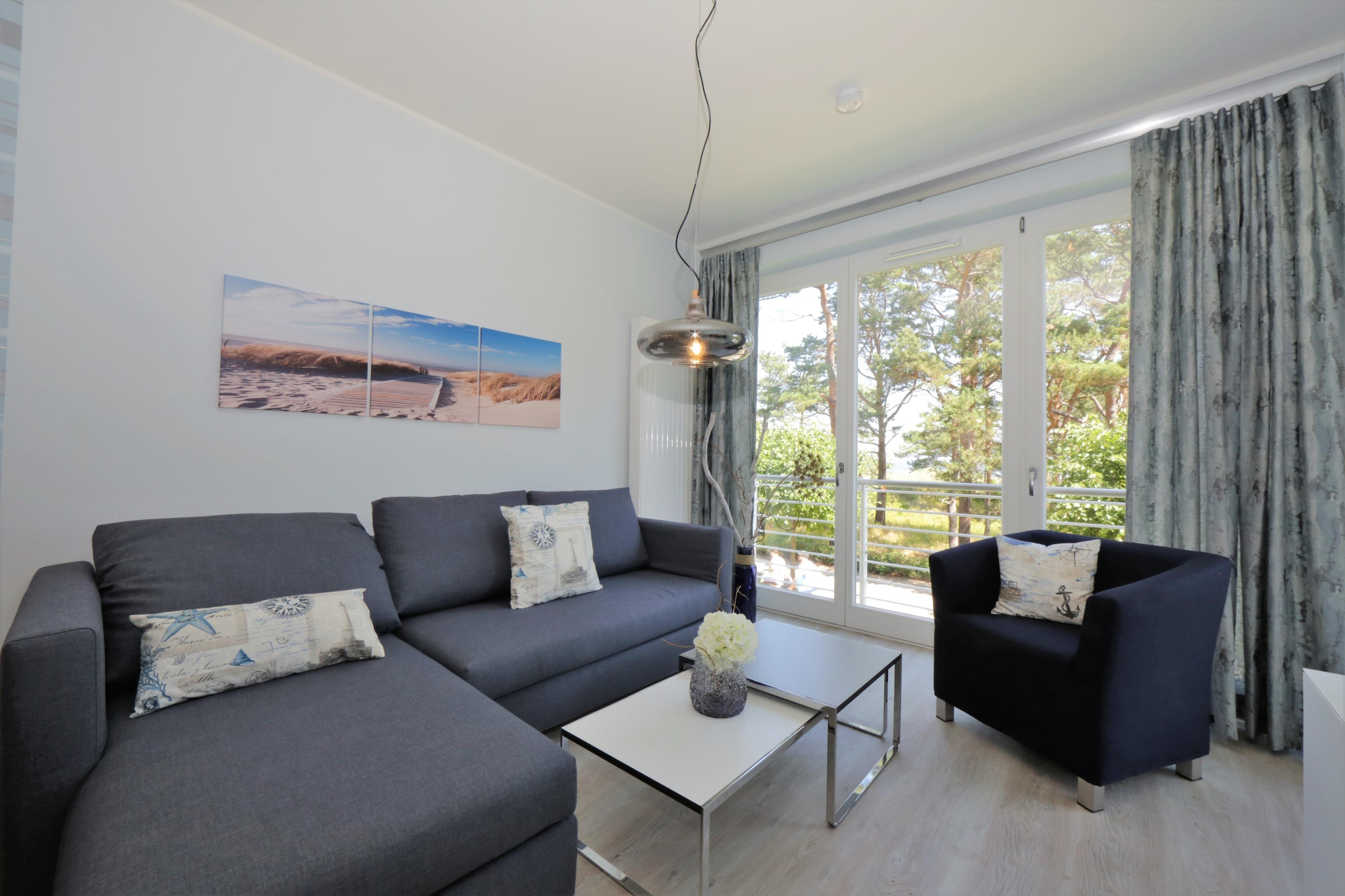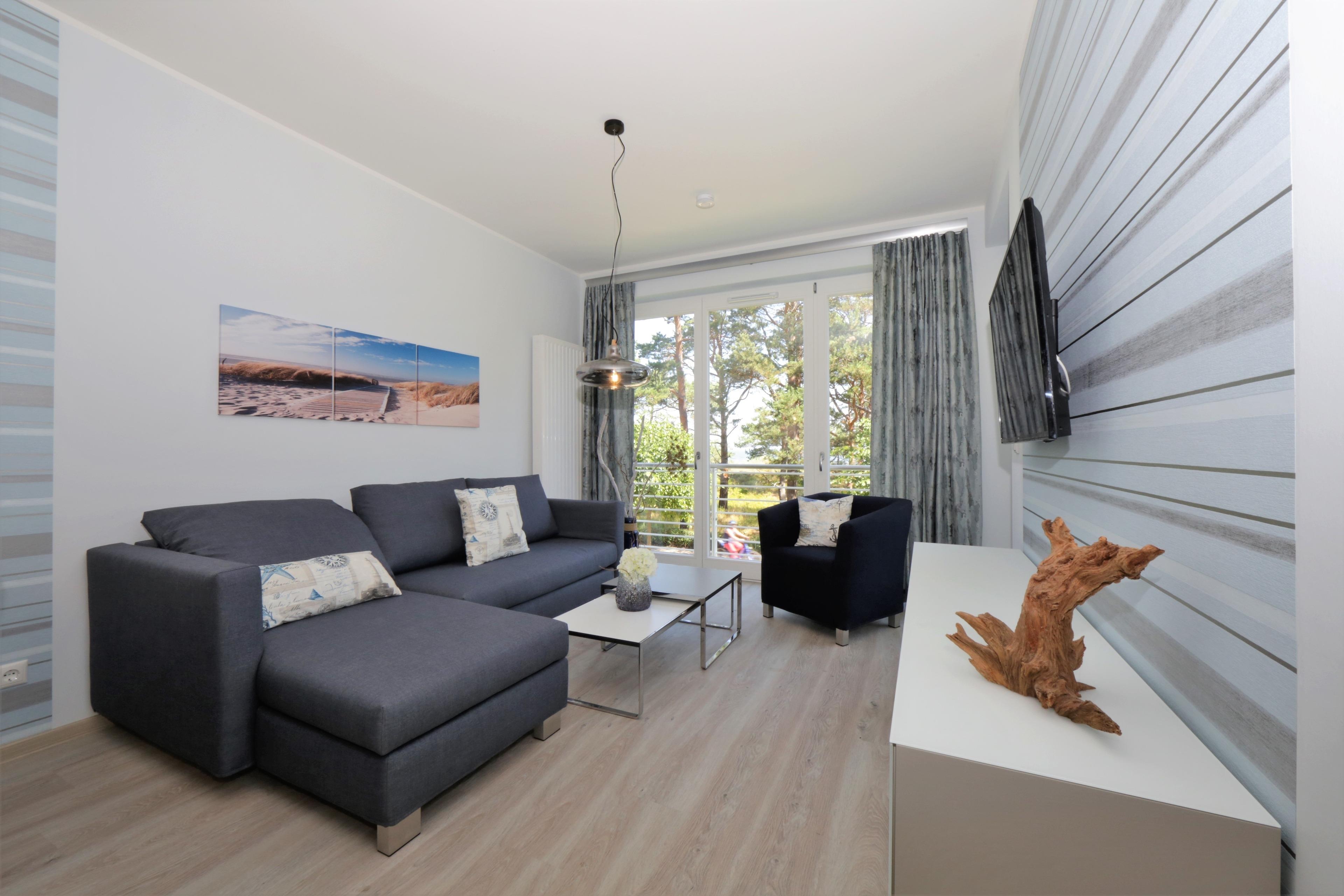 Diese moderne und mit viel Liebe zum Detail eingerichtete Ferienwohnung ist 52 qm groß und liegt im 1. Obergeschoss. Sie bietet 2-3 Personen Platz für einen erholsamen Ostseeaufenthalt direkt am Meer. Den herrlichen Seeblick können Sie in dieser Wohnung von fast überall genießen. Der charmant eingerichtete Wohnraum verfügt über eine gemütliche Sitzgruppe mit Sofa (Liegefläche 135 x 210) und Flat TV. Der Essplatz und die Küchenzeile incl. Geschirrspüler, Ceranfeld, Backofen, Mikrowelle, Kühlschrank etc. sind offen im hinteren Bereich des Wohnraums integriert. Vom überdachten Balkon können Sie das Meer nicht nur sehen sondern auch riechen. Das Schlafzimmer, ebenfalls mit Seeblick ist mit einem komfortablen Boxspringbett mit getrennten Matratzen (90 x 200), ausreichend Schrankraum und einem zusätzlichen Flat TV eingerichtet. Das großzügige, moderne Bad ist mit einer ebenerdigen Dusche und Waschtisch/WC ausgestattet. Zusätzlich steht den Gästen im Bad eine Infrarotkabine zur Verfügung.