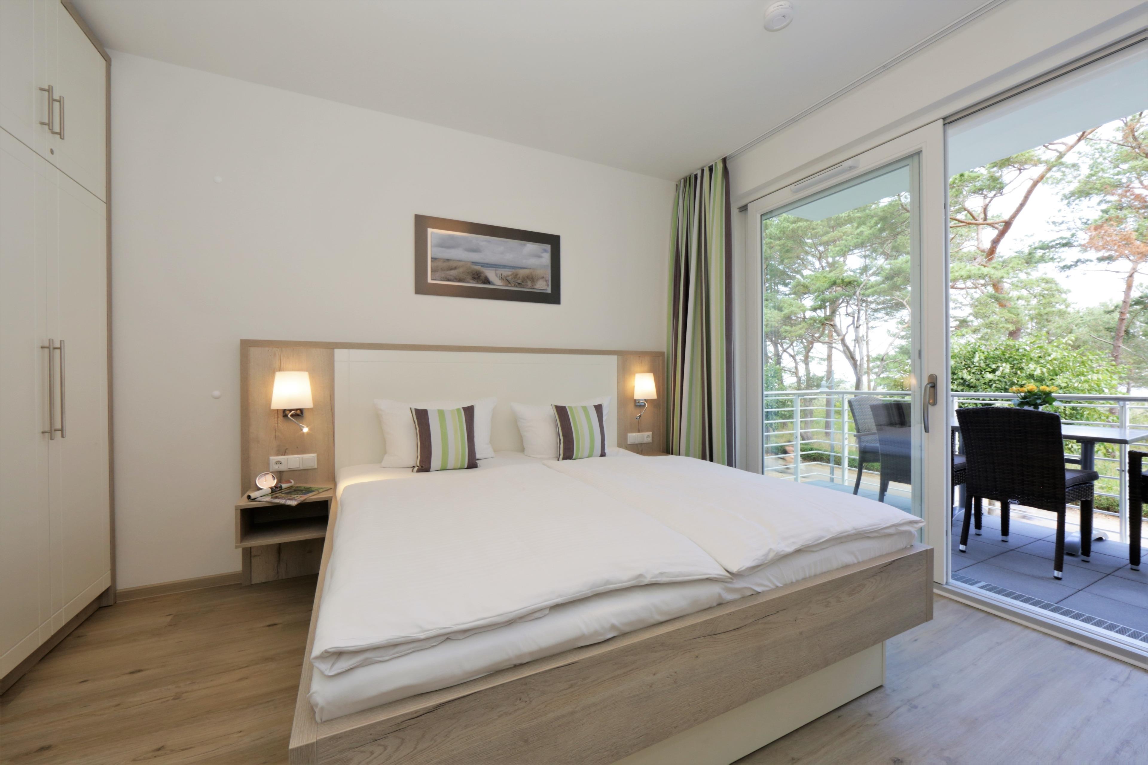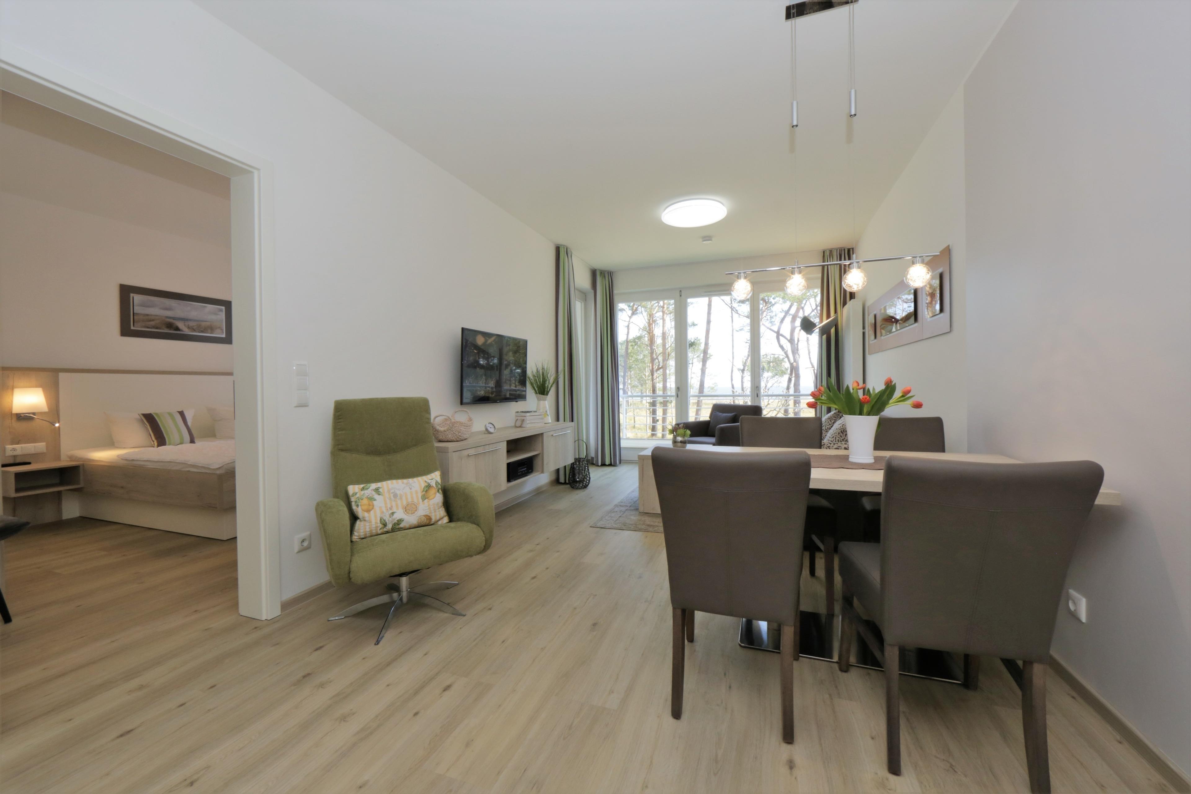 Die moderne, liebevoll eingerichtete 2-Zimmer Ferienwohnung mit 52 m² Wohnfläche befindet sich im 1. Obergeschoss der Strandresidenz. Die überdachte Terrasse zur Promenade mit traumhaftem Seeblick lockt die Gäste schon zum Frühstück ins Freie. Die Wohnung ist individuell und komfortabel ausgestattet und bietet 2-4 Personen Platz für einen erholsamen Urlaub am Meer. Der offene Wohnraum bietet Ihnen eine gemütliche Sitzecke mit einem bequemen Sofa (Liegefläche 160 x 200), einen Sessel und Flat TV. Die Küchenzeile incl. Backofen, Ceranfeld, Kühlschrank, Geschirrspüler, Mikrowelle etc. sowie der Essplatz sind offen im Wohnraum integriert. Das geräumige Schlafzimmer ist mit einem Doppelbett mit getrennten Matratzen (90 x 200) und einem großen Kleiderschrank eingerichtet. Aus beiden Zimmern genießen Sie den Seeblick aus erster Hand. Der Balkon lässt sich sowohl vom Wohn- als auch vom Schlafzimmer betreten. Das großzügige, moderne Bad ist mit einer ebenerdigen Dusche und Waschtisch/WC ausgestattet.