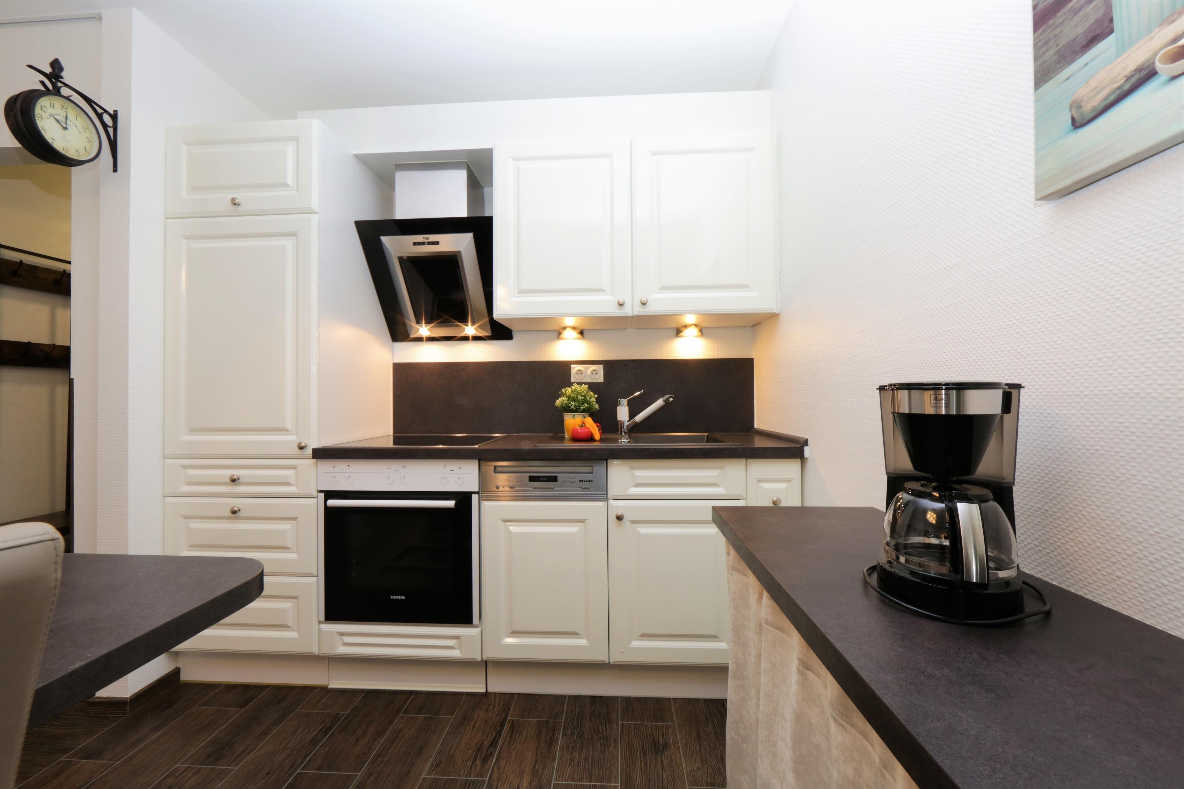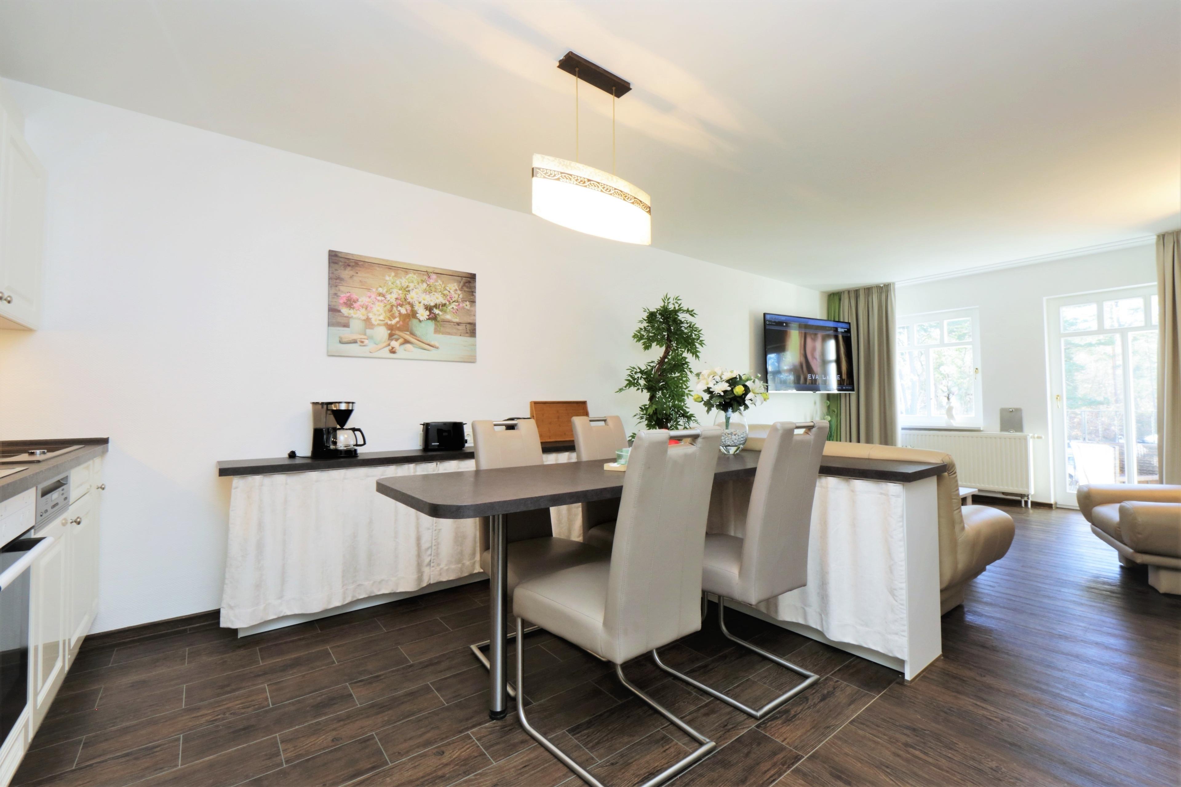 Diese gepflegte und liebevoll eingerichtete 59 qm große 2-Zimmer-Wohnung befindet sich in Toplage direkt am Strand. Das Appartement befindet sich im 1.Obergeschoss mit einem kleinen zum Süden ausgerichteten Balkon, der sowohl vom Wohn- als auch vom Schlafraum betreten werden kann. Der Wohnbereich ist mit einer gemütlichen Retro-Couch-Garnitur ausgestattet, welche in feinster Handarbeit von einem Sattler neu mit Leder bezogen wurde. Des Weiteren stehen dem Gast ein Couchtisch, ein großer 65 Zoll Grundig Smart-TV und eine BOSE-Anlage (Radio/CD) mit fantastischem Sound zur Verfügung. Die moderne Küchenzeile ist ausgestattet mit Cerankochfeld, Backofen, Kühlschrank inkl. Gefrierfach, Toaster, Kaffeemaschine etc. Ein besonderer Blickfang ist die in die Küche integrierte, großzügige Esslounge mit großem Tisch, besonders designten und bequemen Polsterstühlen und ausreichendem Platz, der zum gemütlichen Beisammensitzen einlädt. Bei der Einrichtung des Schlafzimmers wurde der Schlafqualität besondere Aufmerksamkeit gewidmet. Es steht den Gästen ein sehr gemütliches Zirbelholz-Doppelbett mit Kingsize-Boxspringmatratze (180x200x24) zur Verfügung. Zirbelholz hat die besondere Eigenschaft, sich positiv auf die Gesundheit auszuwirken (Herz + Kreislauf, Unwohlsein, Schlafstörungen etc.) und sorgt so, in Kombination mit der hochwertigen Matratze, für einen besonders erholsamen Schlaf. Im Schlafbereich befinden sich darüber hinaus ein begehbarer Kleiderschrank, ein großer Standlüfter und ein weiterer Smart TV. Das gut ausgestattete Bad bietet den Gästen Badewanne, Echtglasdusche, Waschtisch, sowie ein erhöhtes WC (besonders angenehm bei Rückenbeschwerden).