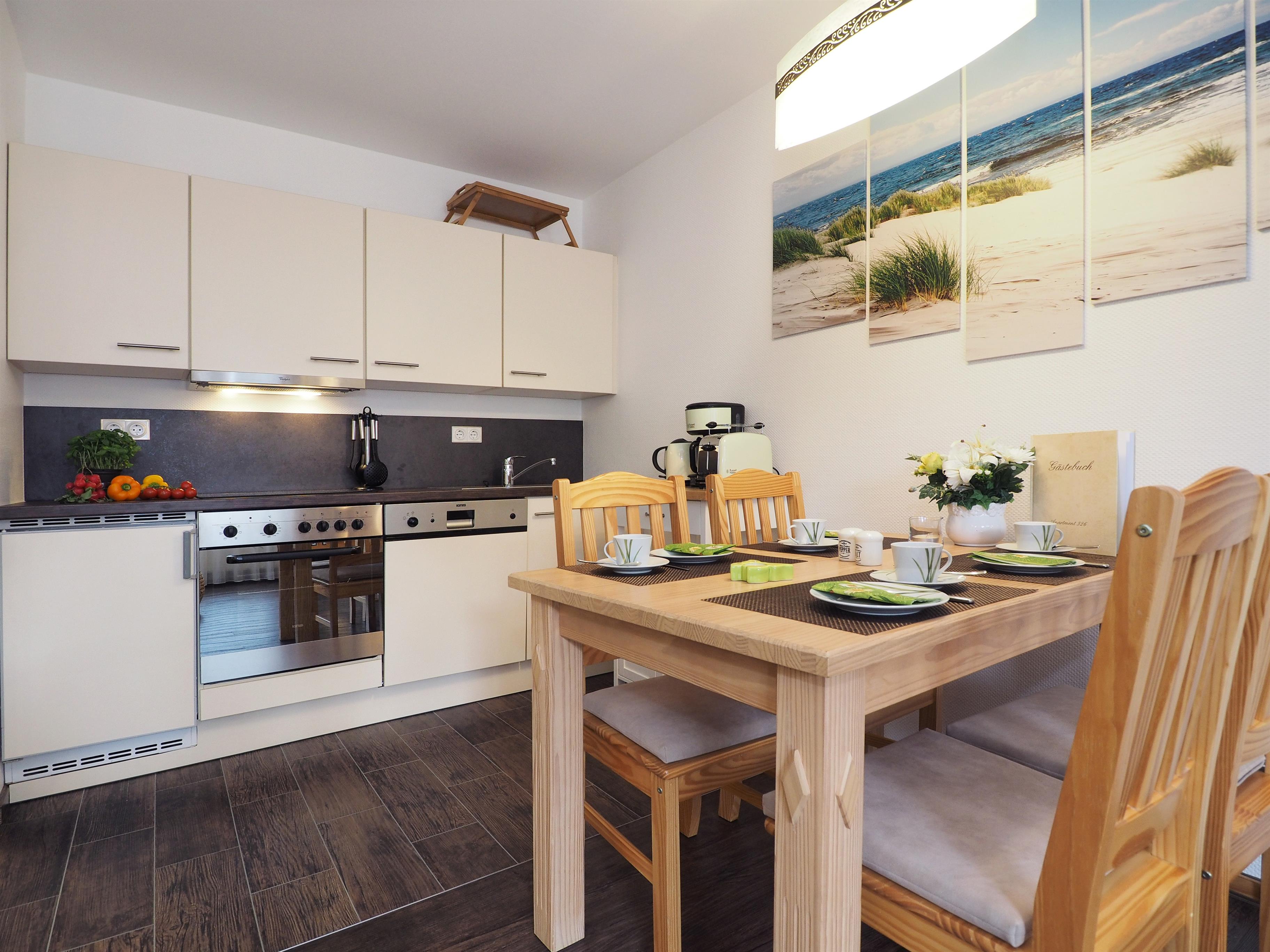 Der Wohnbereich empfängt Sie mit einer einladenden Couch, die mit einer Schlaffunktion (1,60x2,00m) für zusätzlichen Komfort ausgestattet ist. Ein bequemer Sessel, ein geschmackvoller Couchtisch und ein TV/Radio vervollständigen das behagliche Ambiente. Die moderne Küchenzeile, ausgestattet mit Cerankochfeld, Backofen, Geschirrspüler, Kühlschrank, Toaster und Kaffeemaschine, ist harmonisch in den Wohnbereich integriert. Ein einladender Essplatz rundet das Angebot ab.