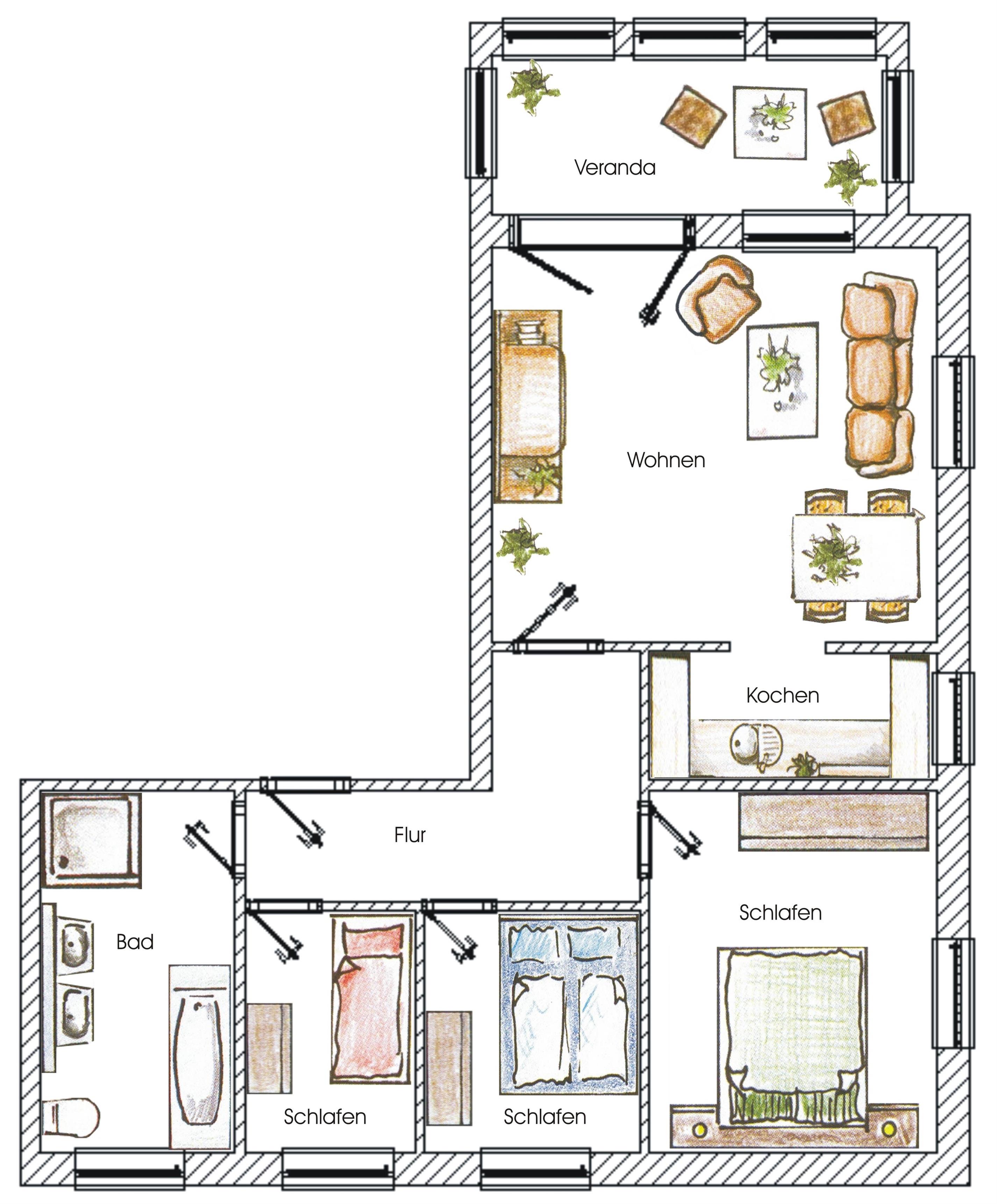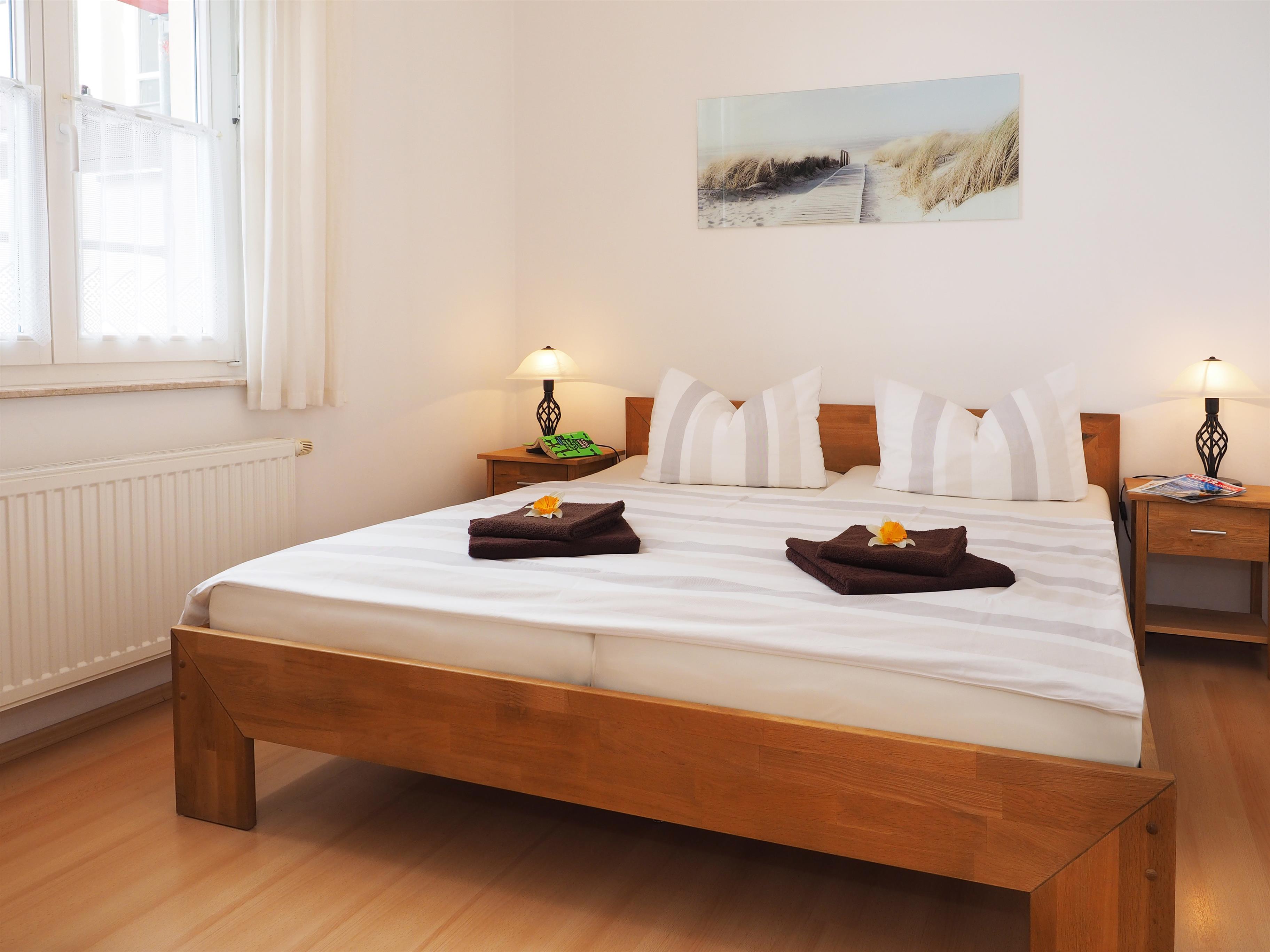 Diese Ferienwohnung für 2-5 Personen befindet sich im 1. Obergeschoss und bietet mit ihren 67 qm reichlich Platz für erholsame Ferientage. Der gemütliche Wohnraum mit viel natürlichem Licht ist mit einer Sitzgruppe und Flat TV eingerichtet. Zum Lesen und Träumen lädt der Platz in der angrenzenden, geschlossenen Loggia (Fenster lassen sich öffnen) ein, von dem aus Sie das bunte Treiben auf der Promenade beobachten sowie einen Blick über die Ostsee genießen können. Die ebenfalls an den Wohnbereich angrenzende Vollküche ist mit Cerankochfeld, Geschirrspüler, Kühlschrank, Mikrowelle etc. ausgestattet. Ein großer Essplatz lädt zu gemeinsamen Mahlzeiten ein. Zwei Schlafräume sind jeweils mit einem Doppelbett (180 bzw. 140 x 200) das dritte Schlafzimmer ist mit einem Einzelbett eingerichtet. Das große Bad ist sowohl mit Dusche als auch mit Badewanne und Doppelwaschbecken/WC ausgestattet. Der Pkw-Stellplatz befindet sich auf dem Grundstück. Für Fahrräder befindet sich lediglich ein Fahrradständer am Haus.