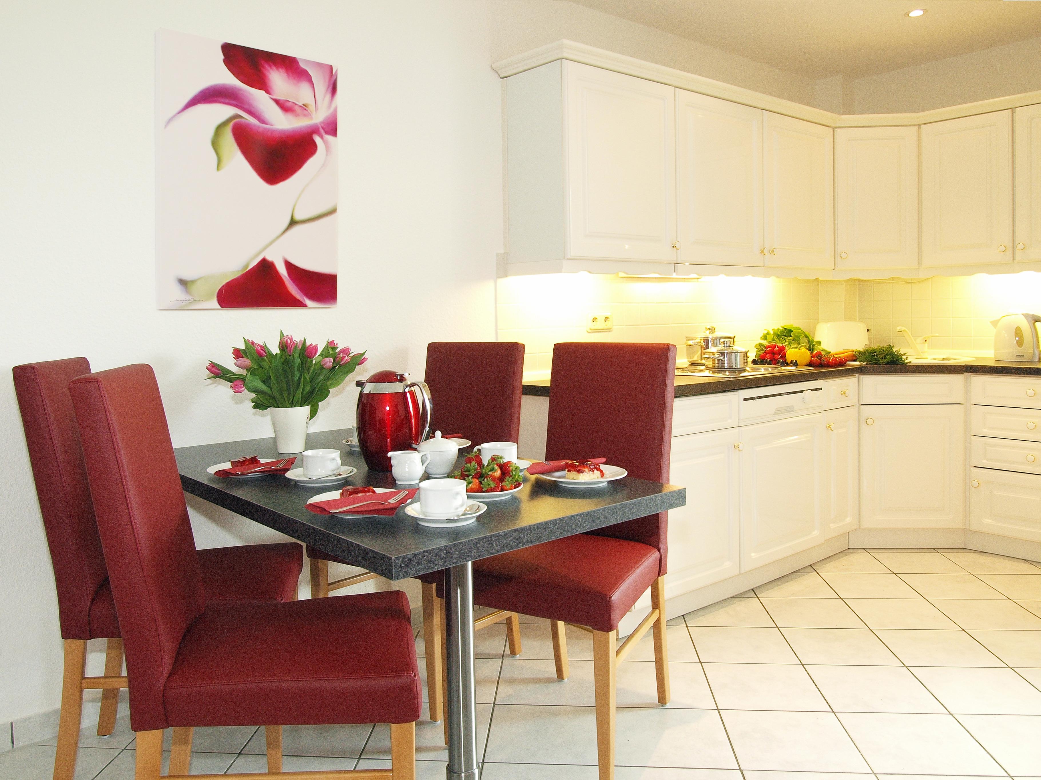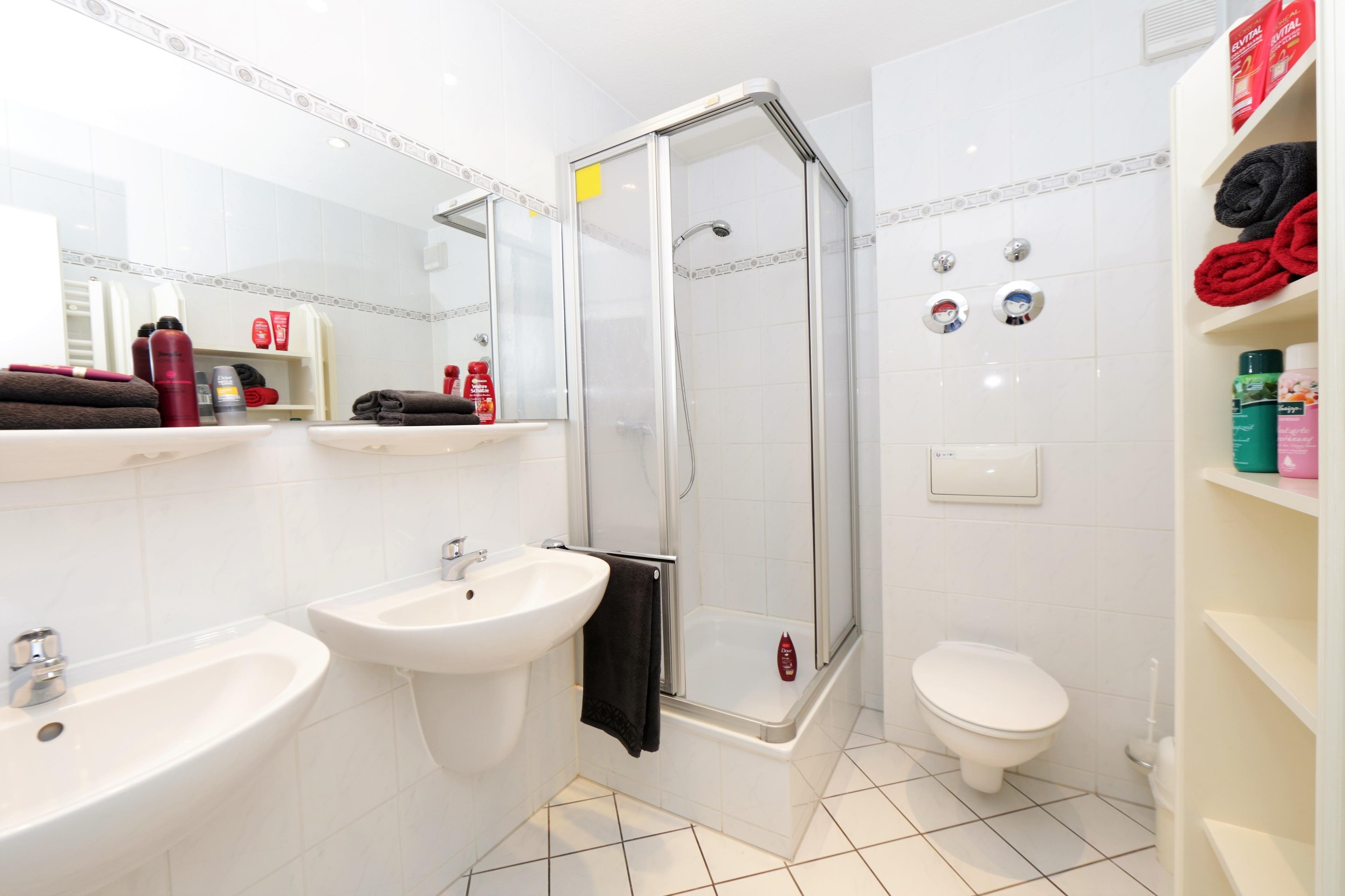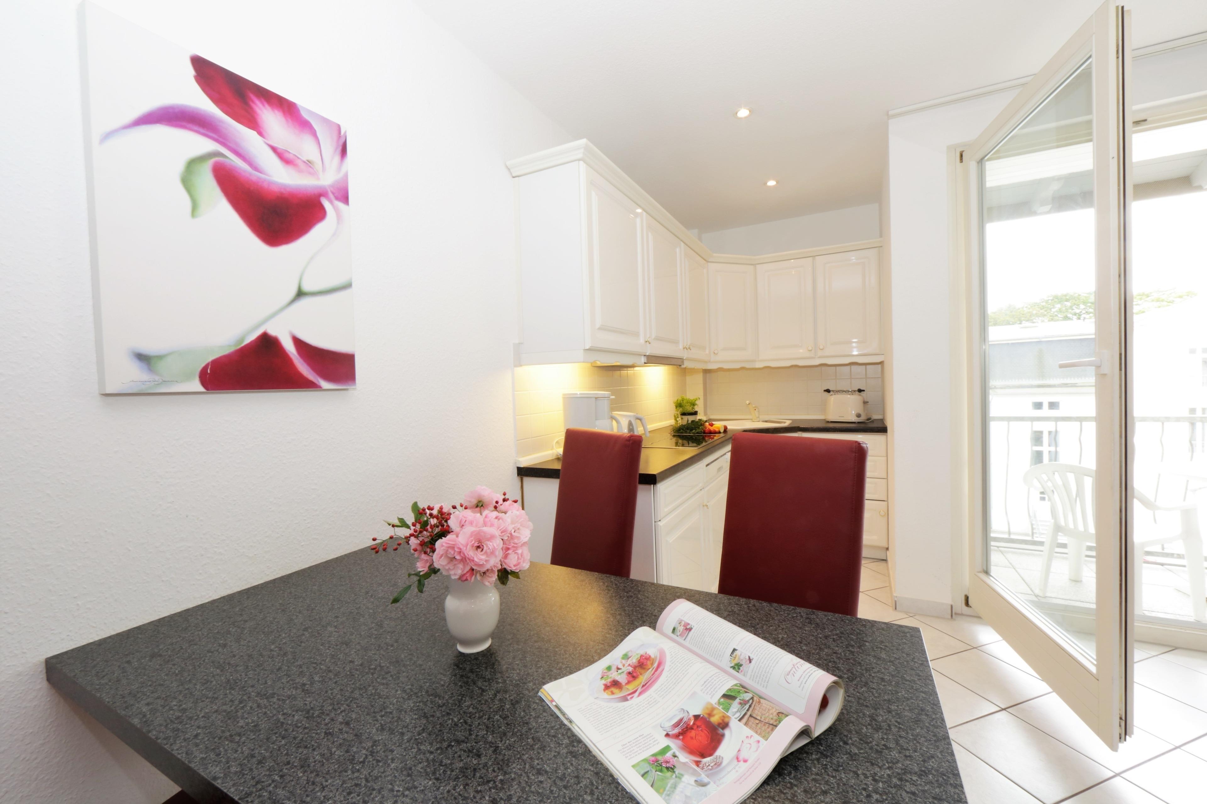 Dieses 41 qm große 2-Zimmer-Appartement für 2-4 Personen im 3. Obergeschoss können Sie über den Fahrstuhl erreichen. Im Wohnraum finden Sie eine gemütliche Couch mit Schlaffunktion (Liegefläche 1,40x1,90) und Sessel sowie Flat-TV. Die offene Vollküche ist mit Cerankochfeld, Geschirrspüler, Kühlschrank etc. ausgestattet. An dem zur Küche gehörigen kleinen Essplatz finden bis zu 4 Personen Platz. Das Schlafzimmer ist mit einem Doppelbett mit getrennten Matratzen (90 x 200) und einem großen Kleiderschrank ausgestattet. Im Bad stehen Ihnen Dusche und Waschbecken/WC zur Verfügung. Der möblierte Südbalkon, der vom Wohnraum begehbar ist, lockt die Gäste schon zum Frühstück nach draußen. Ein PKW-Stellplatz befindet sich in der zum Haus gehörigen Tiefgarage und ist der Wohnung zugeordnet. Ein Fahrradständer steht den Gästen im Kellergeschoss ebenso zur Verfügung wie Waschmaschine und Trockner gegen Gebühr.