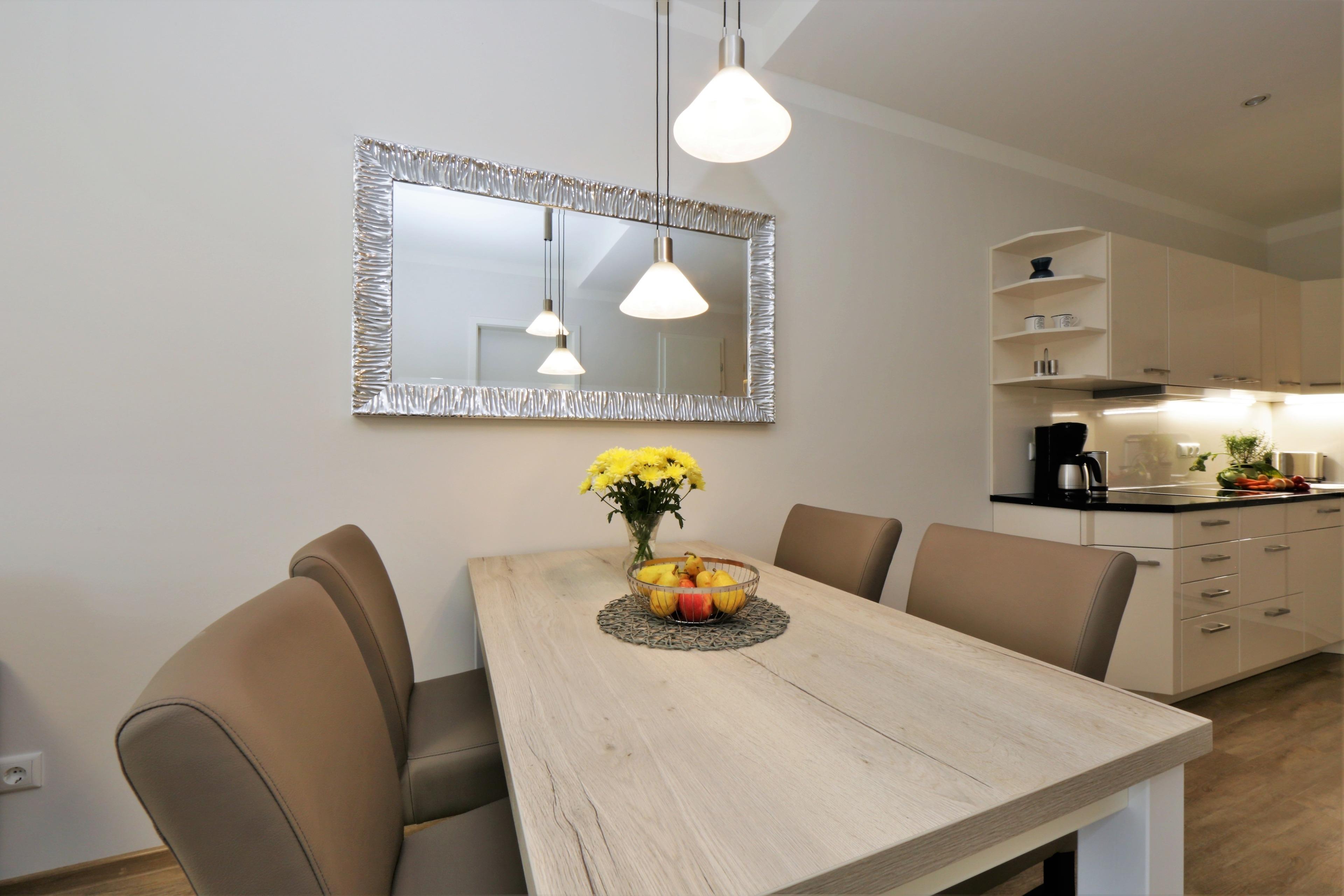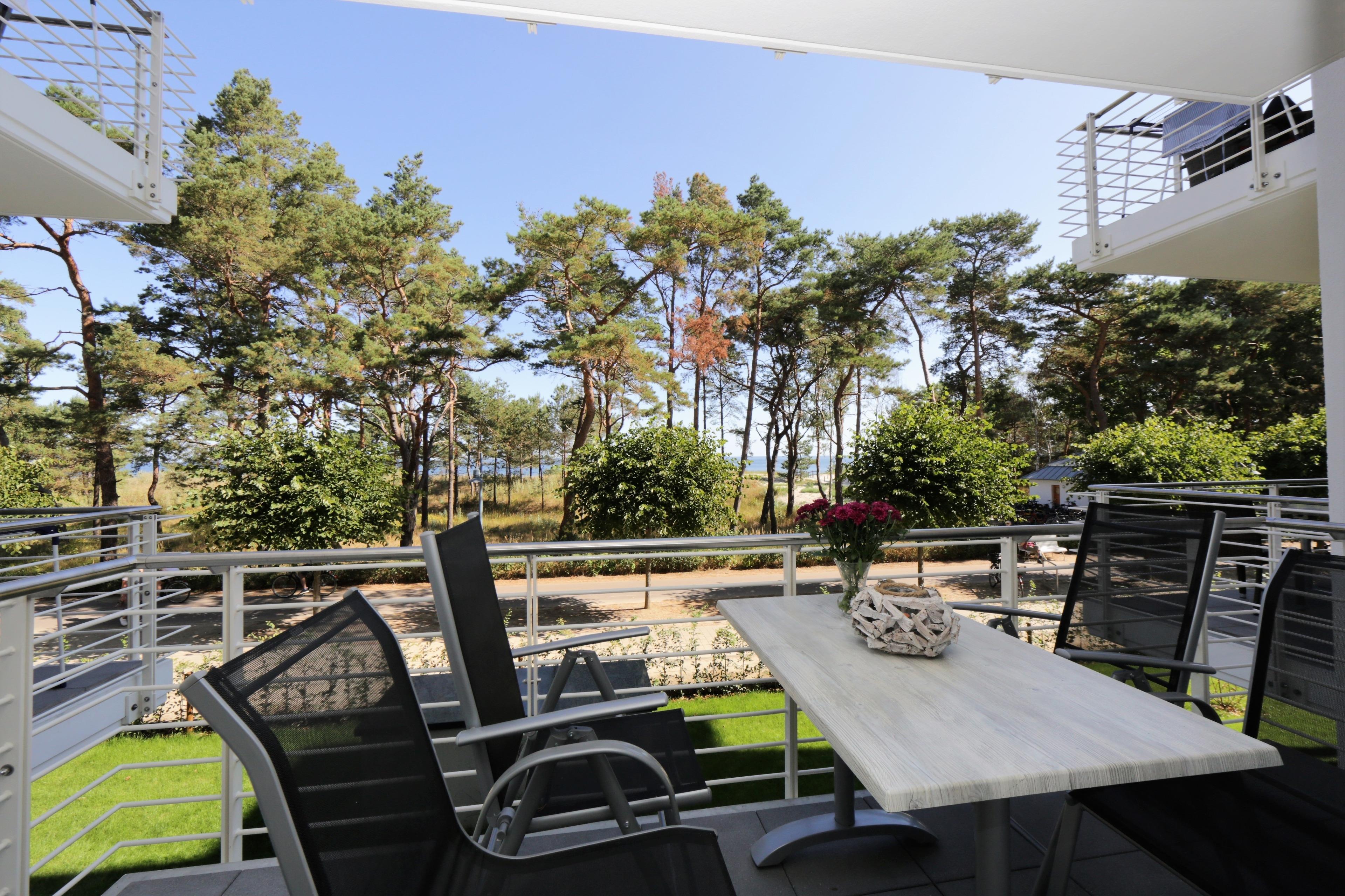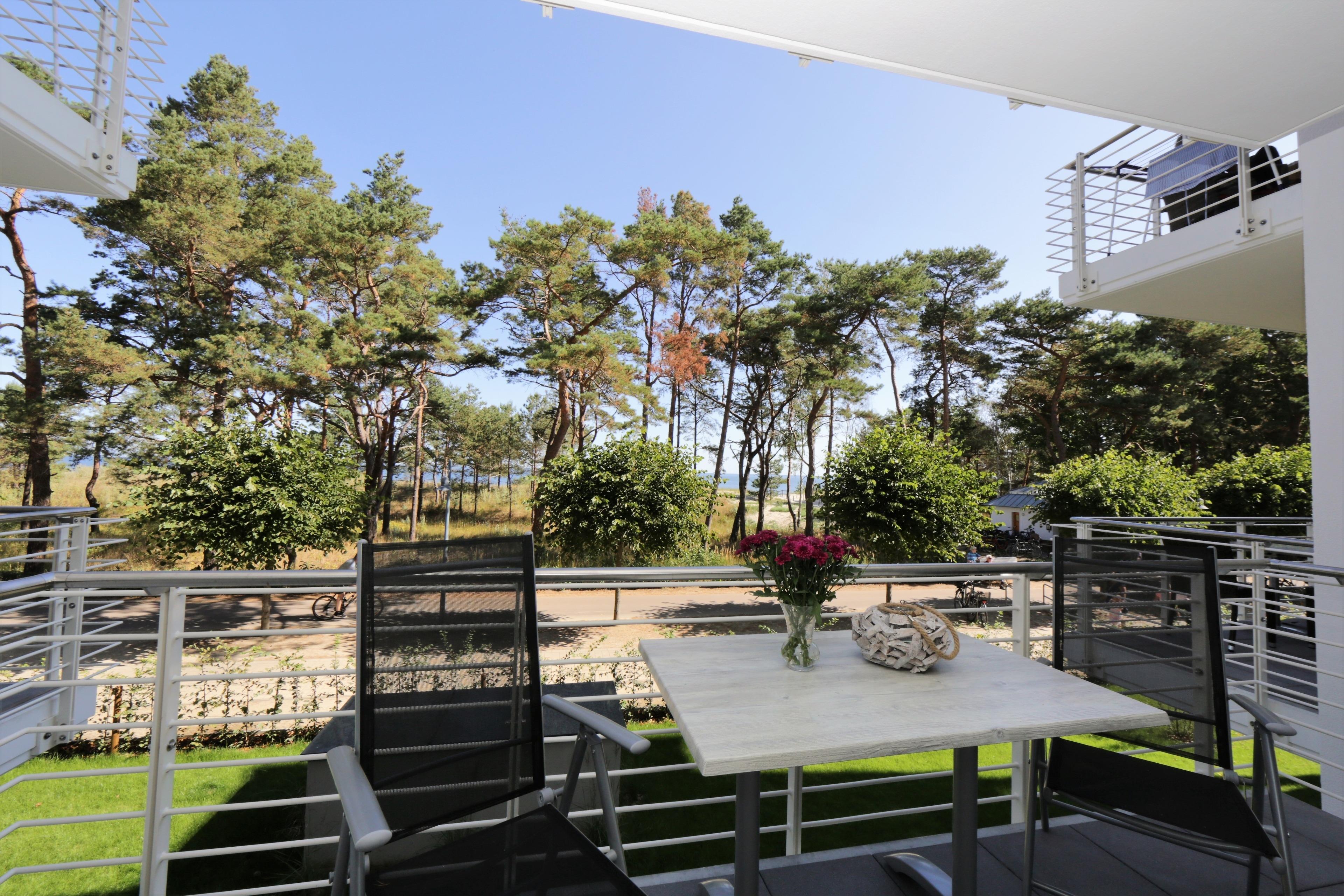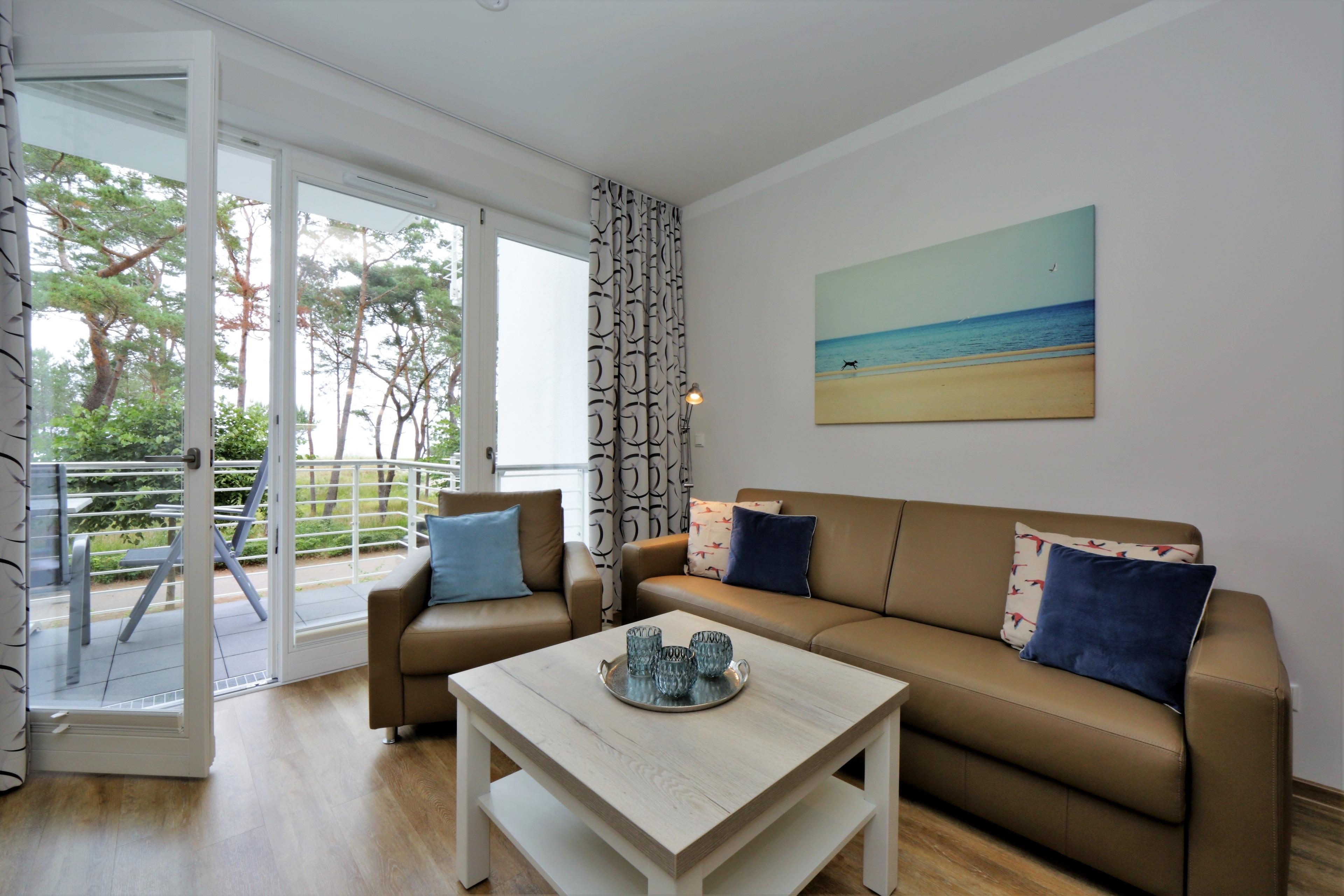 Die moderne hochwertige 2-Zimmer Ferienwohnung mit 58 m² Wohnfläche befindet sich im 1. Obergeschoss der Strandresidenz. Der überdachte Balkon zur Promenade mit traumhaftem Seeblick lockt die Gäste schon zum Frühstück ins Freie. Die Wohnung ist individuell, komfortabel und mit viel Liebe zum Detail eingerichtet. Sie bietet 2-4 Personen Platz für einen erholsamen Urlaub am Meer. Der offene Wohnraum bietet Ihnen eine gemütliche Sitzecke mit einem bequemen Ledersofa mit Schlaffunktion (Matratze 160 x 200), einen Sessel und Flat TV. Die Küchenzeile incl. Backofen, Induktionsfeld, Kühlschrank, Geschirrspüler, Mikrowelle etc. sowie der Essplatz sind offen im Wohnraum integriert. Das geräumige Schlafzimmer ist mit einem Doppelbett mit getrennten Matratzen (90 x 200), einem großen Kleiderschrank und zusätzlichem Flat TV eingerichtet. Um den Sonnenaufgang zu beobachten, müssen Sie nicht unbedingt das kuschelige Bett verlassen. Aus beiden Zimmern genießen Sie den Seeblick aus erster Hand. Der Balkon lässt sich sowohl vom Wohn- als auch vom Schlafzimmer betreten. Das großzügige, moderne Bad ist mit einer ebenerdigen Dusche und Waschtisch/WC ausgestattet.