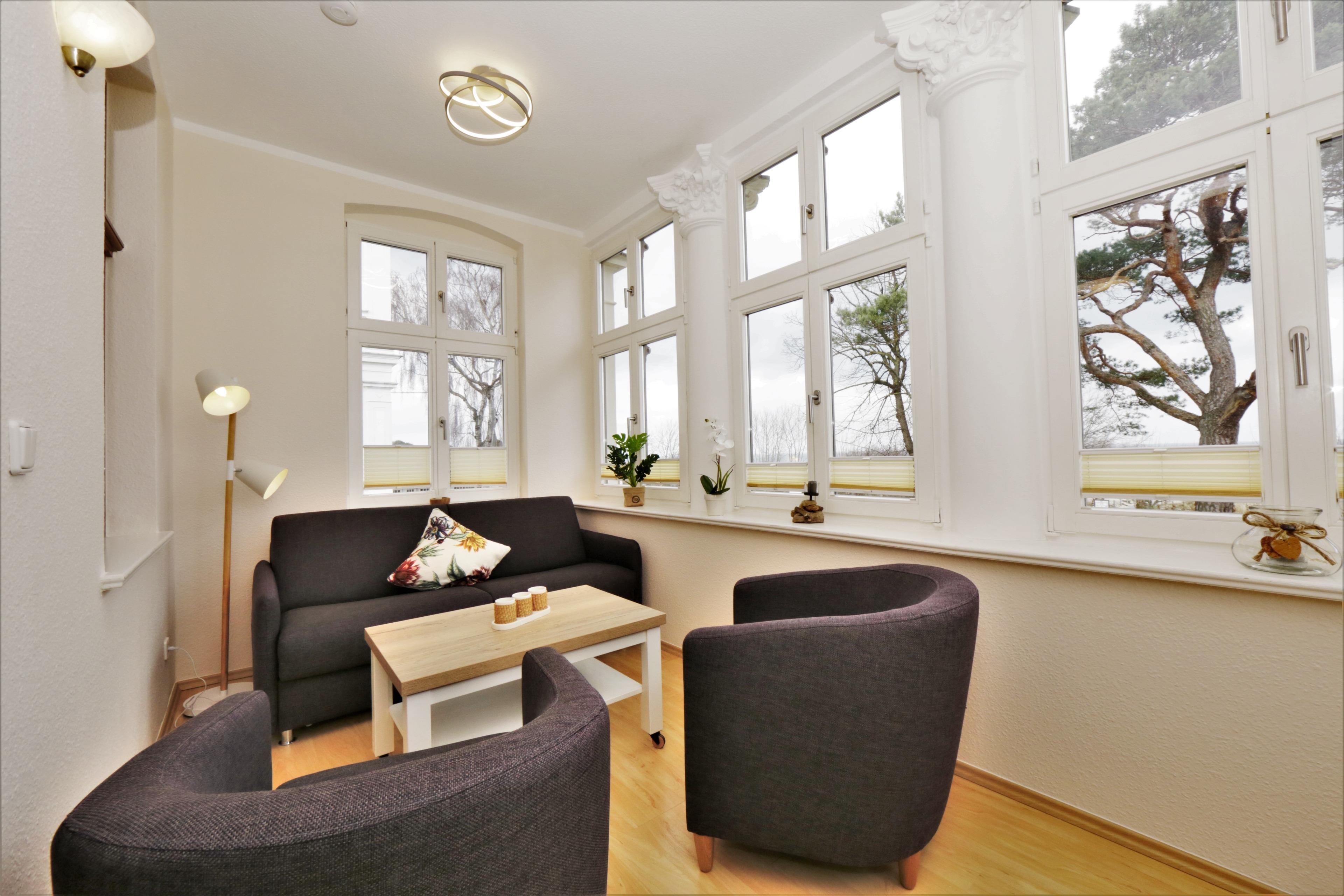 Direkt an der Promenade im Ostseebad Ahlbeck befindet sich in ruhiger Strandlage die Villa Luna, wo Heringsdorf und Ahlbeck ineinander fließen - zentral, aber nicht in den belebten Zentren, inmitten der beiden berühmten Seebrücken, am schönsten Strandabschnitt der Insel. Das mondäne Heringsdorf erschließt sich fußläufig ebenso mühelos wie das authentische Ahlbeck. Die Villa Luna, um 1900 gebaut und ca. 100 Jahre später aufwendig saniert, steht unter Denkmalschutz und fällt dem Spaziergänger und Betrachter wegen ihrer mit zahlreichen Stuckelementen reich verzierten Fassade auf.