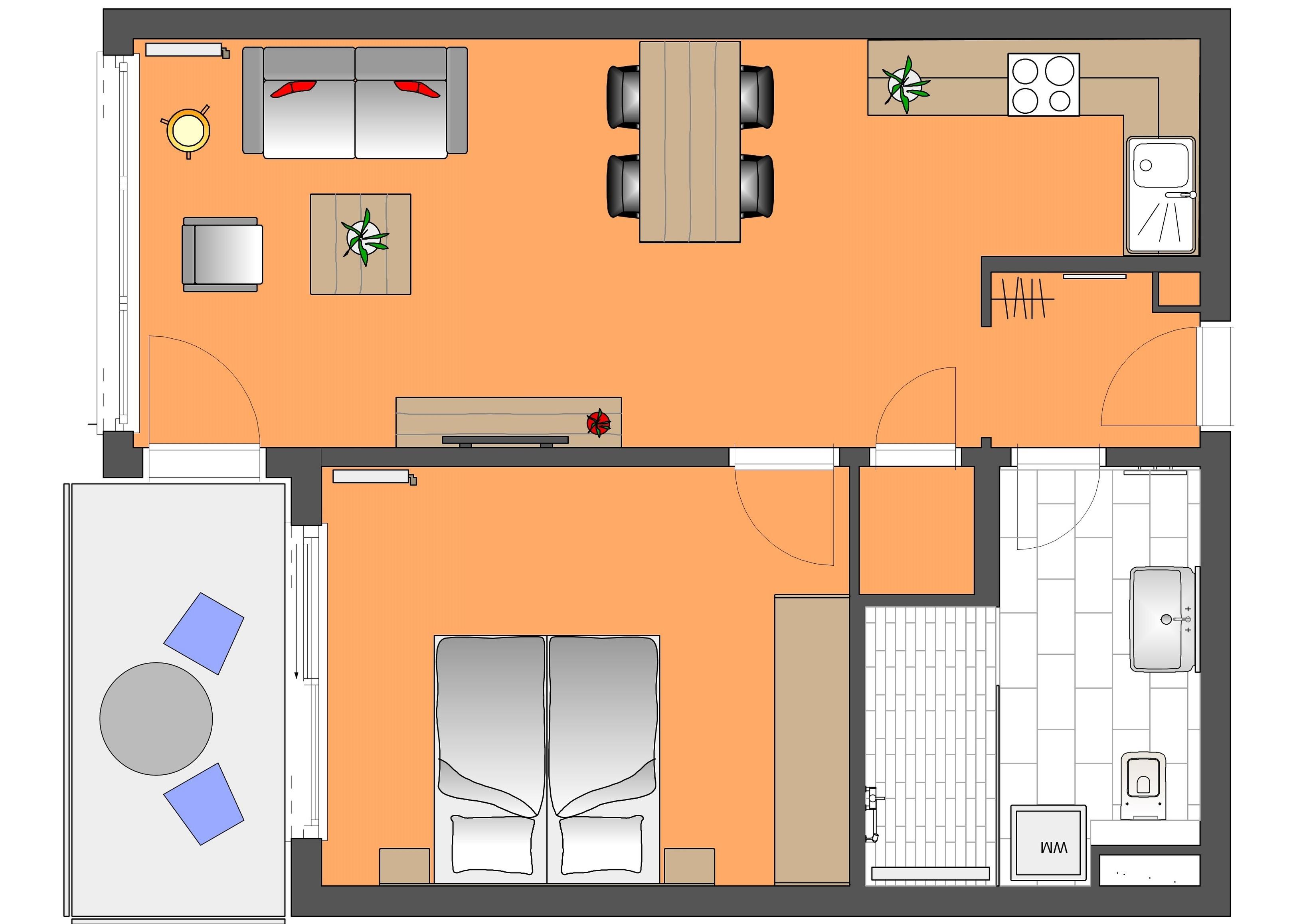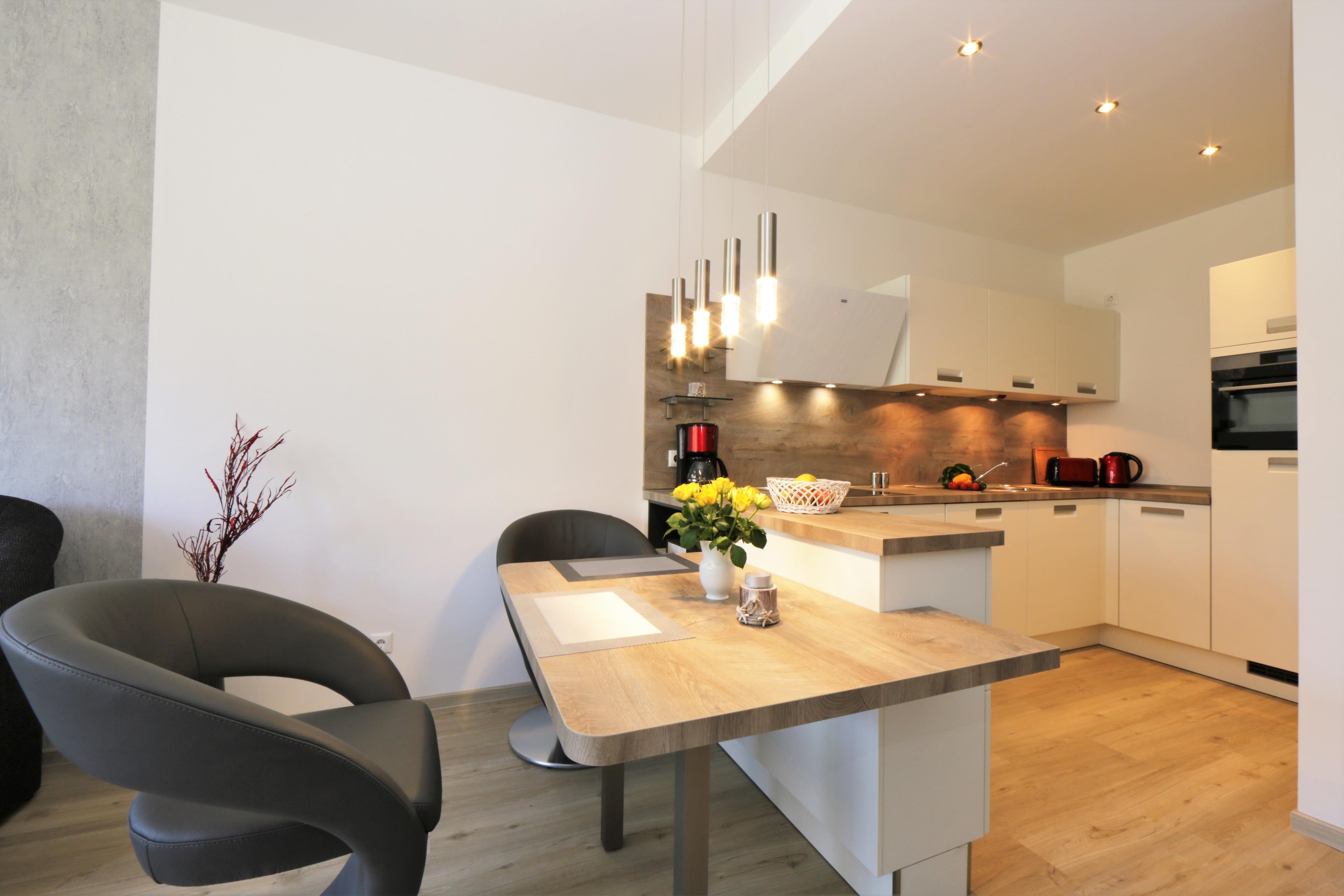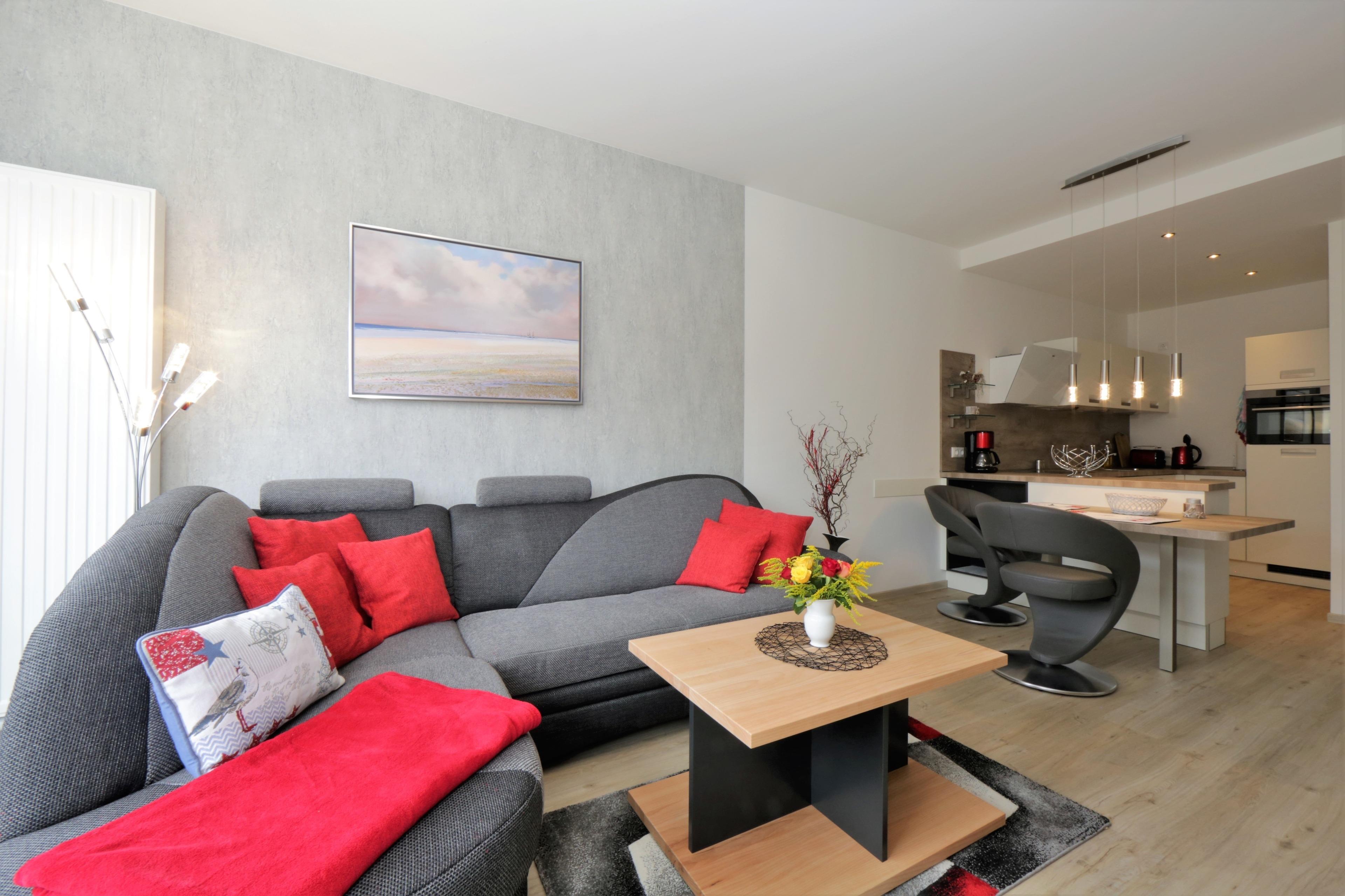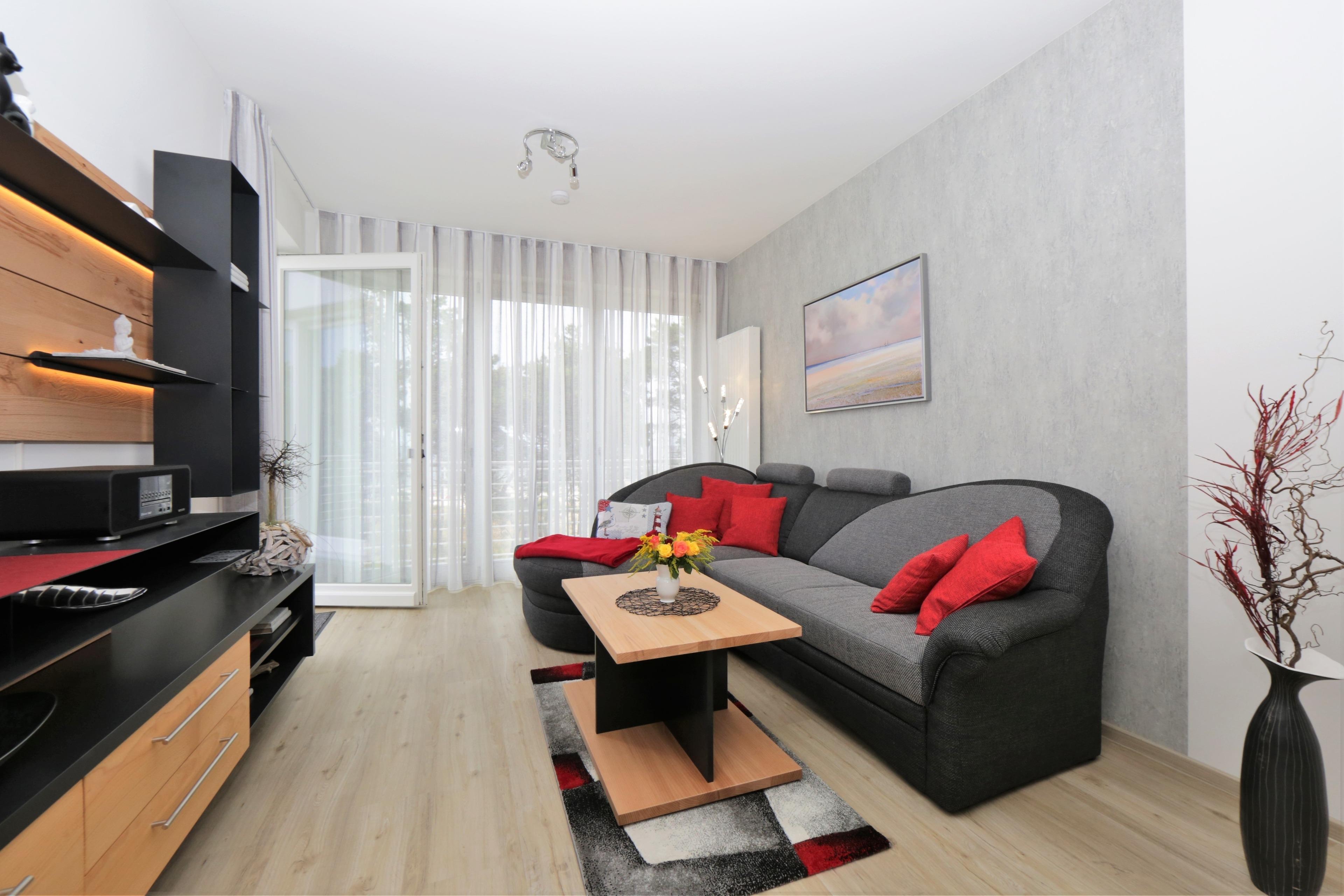 Die moderne, liebevoll eingerichtete 2-Zimmer Ferienwohnung mit 51 m² Wohnfläche befindet sich im 3. Obergeschoss der Strandresidenz. Der Balkon zur Promenade mit traumhaftem Seeblick lockt die Gäste schon zum Frühstück ins Freie. Die Wohnung ist individuell und komfortabel ausgestattet und bietet 2 Personen Platz für einen erholsamen Urlaub am Meer. Der offene Wohnraum bietet Ihnen eine gemütliche Sitzecke mit einem bequemen Sofa, einem Sessel und Flat TV. Die Küchenzeile incl. Backofen, Ceranfeld, Kühlschrank, Geschirrspüler, Mikrowelle etc. sowie der Essplatz sind offen im Wohnraum integriert. Das geräumige Schlafzimmer ist mit einem Doppelbett mit getrennten Matratzen (90 x 200), einem großen Kleiderschrank eingerichtet. Aus beiden Zimmern genießen Sie den Seeblick aus erster Hand. Der Balkon lässt sich sowohl vom Wohn- als auch vom Schlafzimmer betreten. Das großzügige, moderne Bad ist mit einer ebenerdigen Dusche und Waschtisch/WC ausgestattet.
