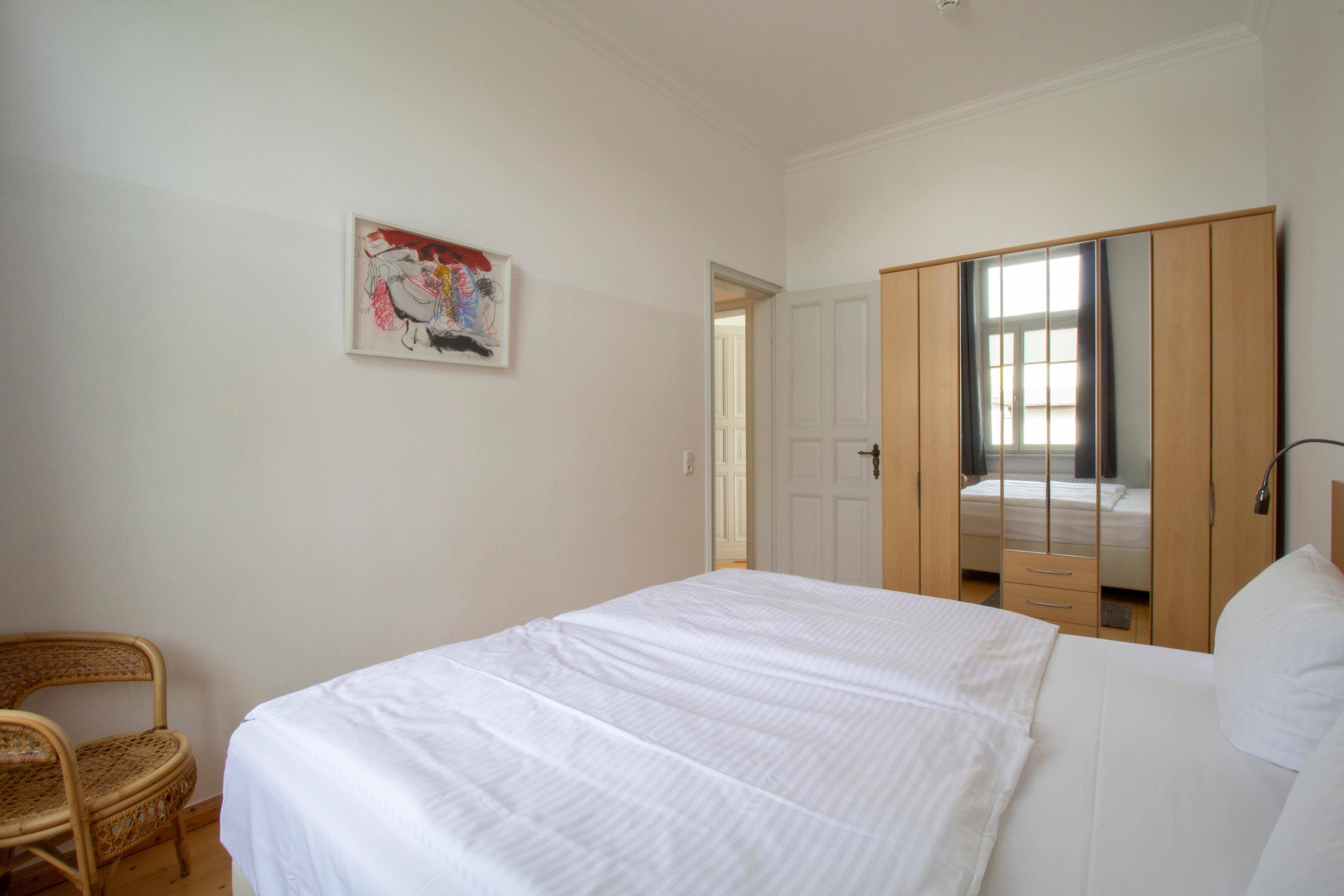 Das größere Schlafzimmer ist mit einem Boxspringbett mit getrennten Matratzen (90 x 200) und durchgängigem Topper (180 x 200) sowie reichlich Schrankraum ausgestattet. Das kleinere Schlafzimmer ist mit einem Einzelbett und einem geräumigen Kleiderschrank möbliert.