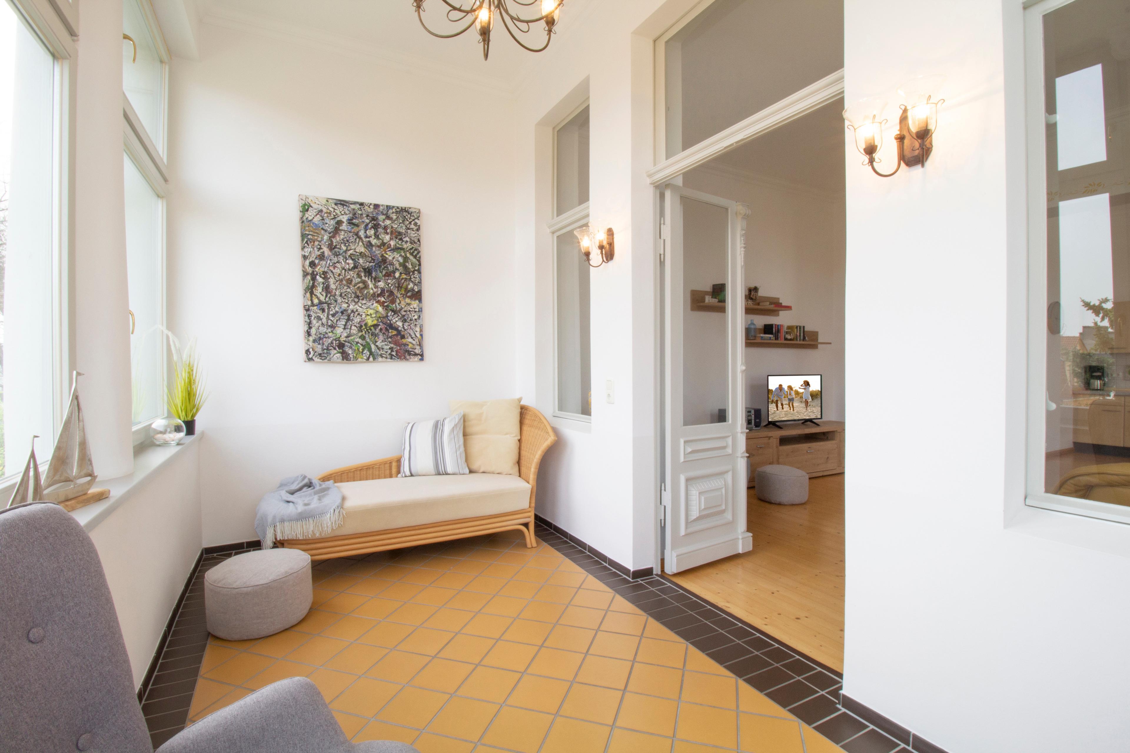 In der an das Wohnzimmer angrenzenden geschlossenen Loggia, deren Fenster sich öffnen lassen, laden Sie bequeme Loungesessel und eine Récamiere zu erholsamen Stunden ein.