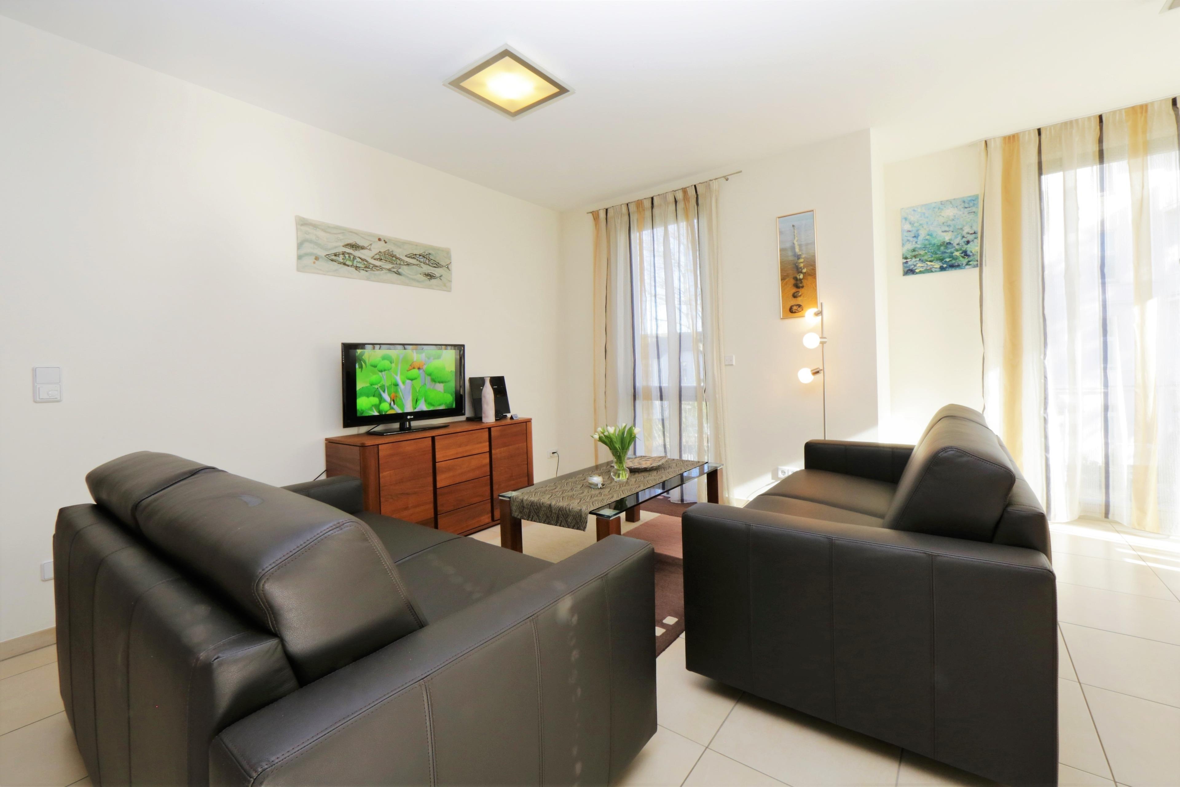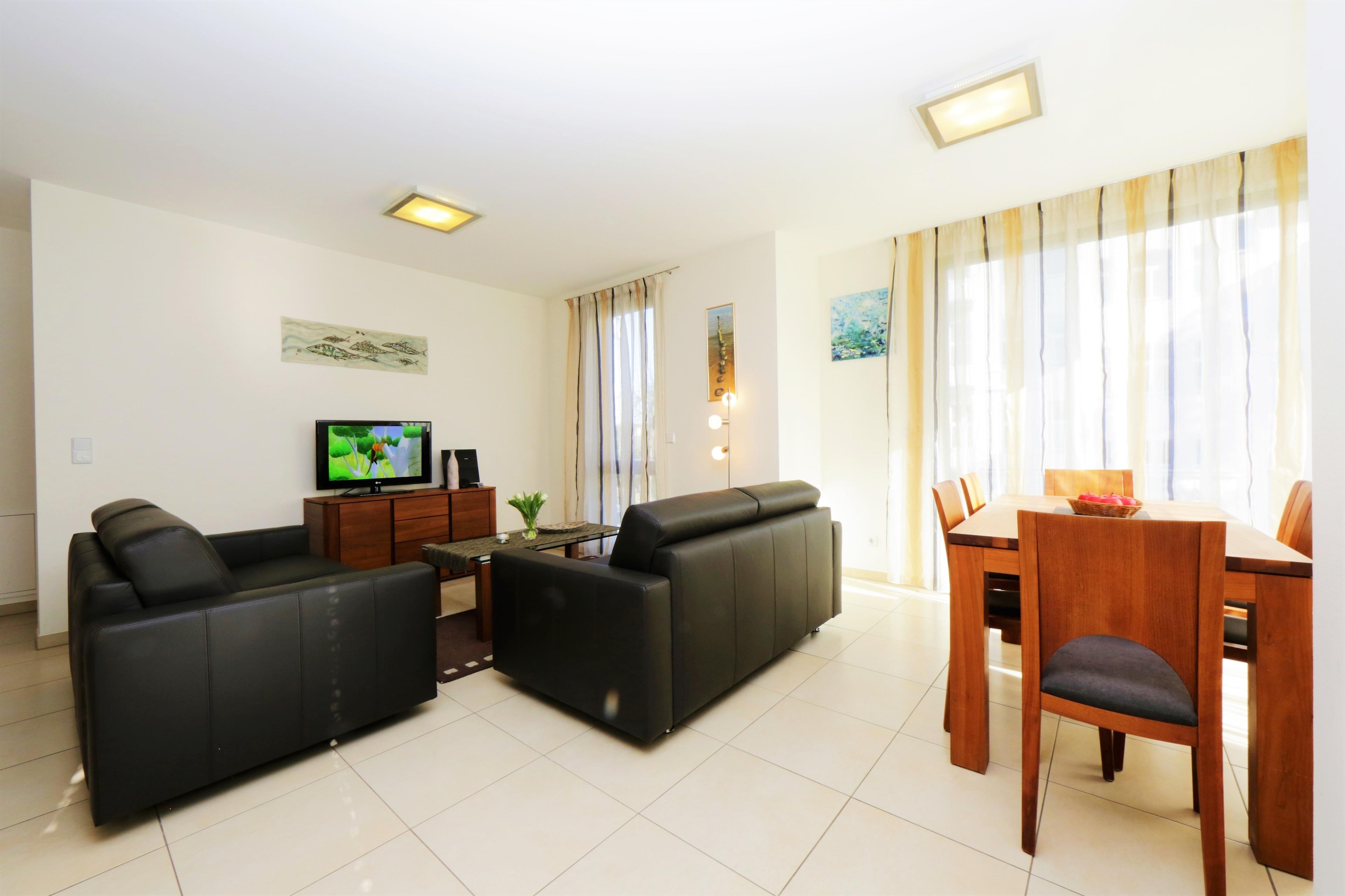 Dieses gepflegte 68 qm große 3-Zimmer-Appartement liegt im 1. Obergeschoss zur Ostseite und eignet sich für 2-4 Personen. In dieser gut ausgestatteten Wohnung finden Sie ein Wohnzimmer mit einer gemütlichen Sitzecke mit Ledergarnitur und Flat TV. Der Essbereich und die Vollküche incl. Geschirrspüler, Cerankochfeld, Backofen, Mikrowelle etc. sind ebenfalls im Wohnraum integriert. Der möblierte Balkon lockt die Gäste schon zum Frühstück ins Freie. Beide Schlafzimmer sind mit Parkettboden belegt und mit jeweils einem Doppelbett mit getrennten Matratzen (90 x 200) und genügend Schrankraum eingerichtet. Im innenliegenden Bad finden Sie Dusche, Badewanne, WC und Doppelwaschtisch. Zusätzlich steht Ihnen ein Gäste-WC zur Verfügung. Ein Pkw-Stellplatz, der ein wenig fahrerisches Können voraussetzt, befindet sich in der Tiefgarage und ist dem Appartement zugeordnet.