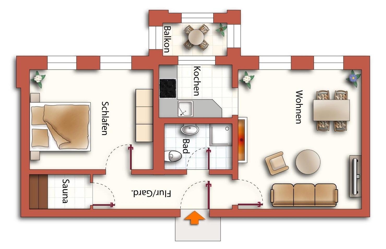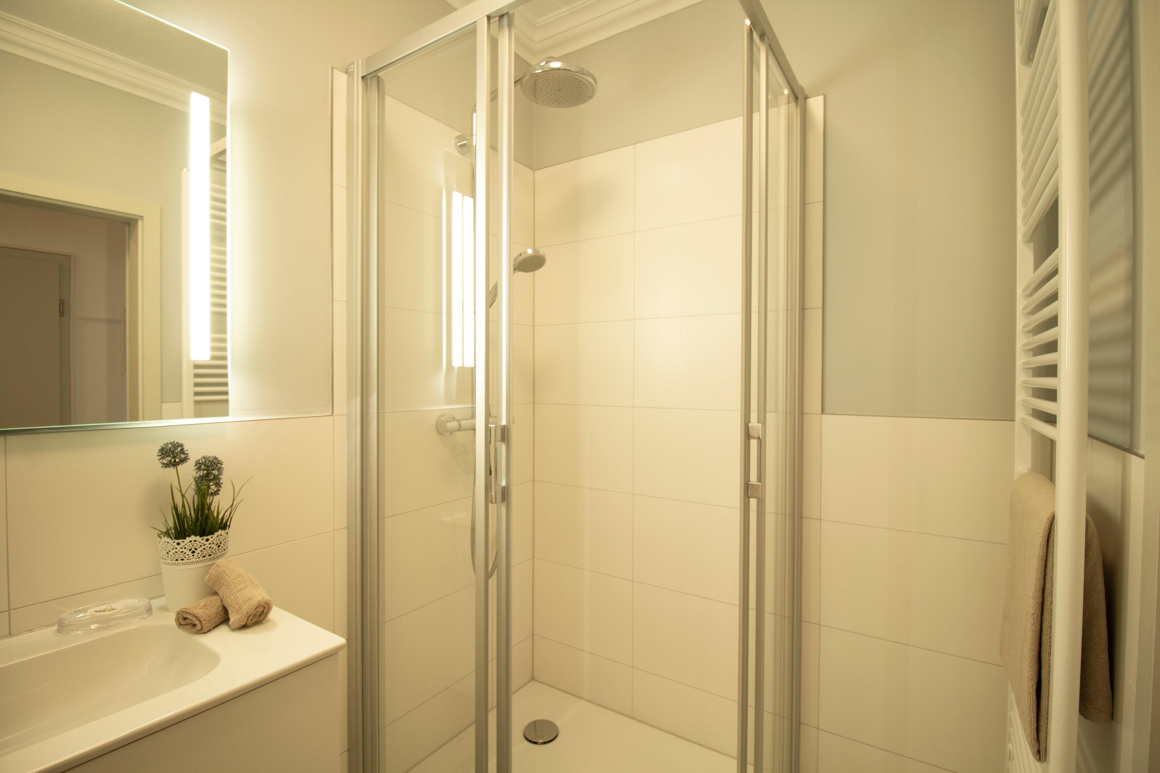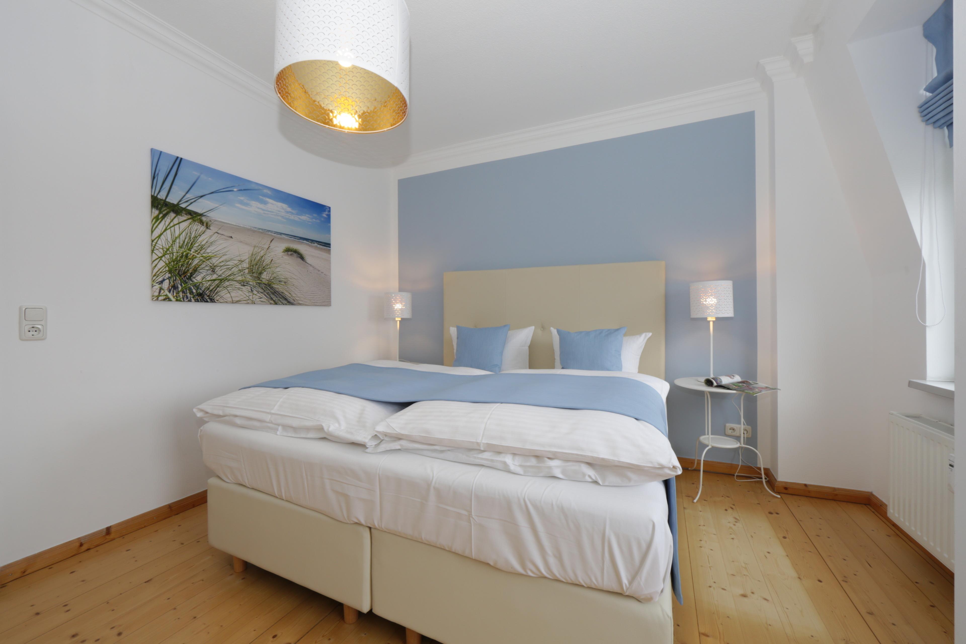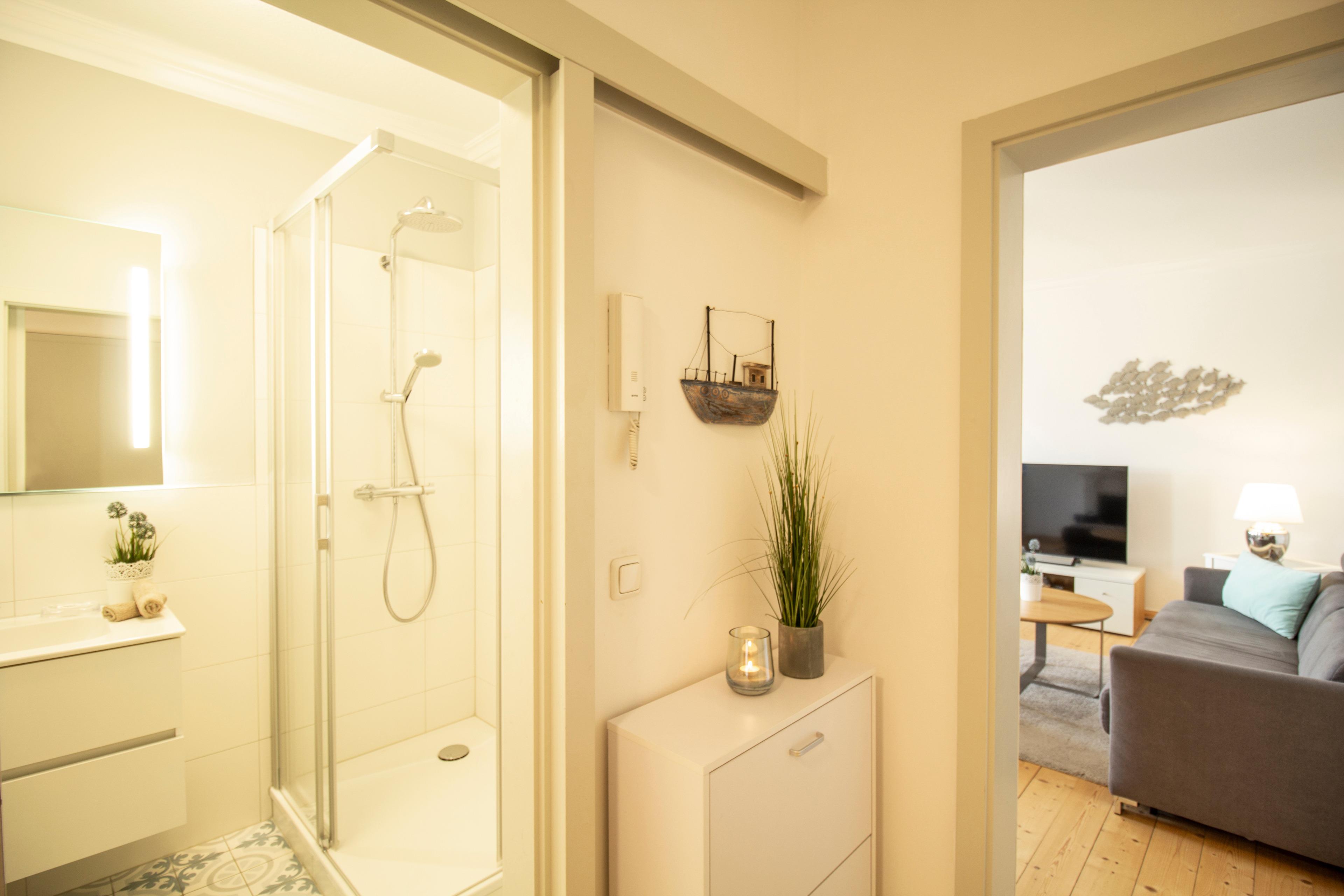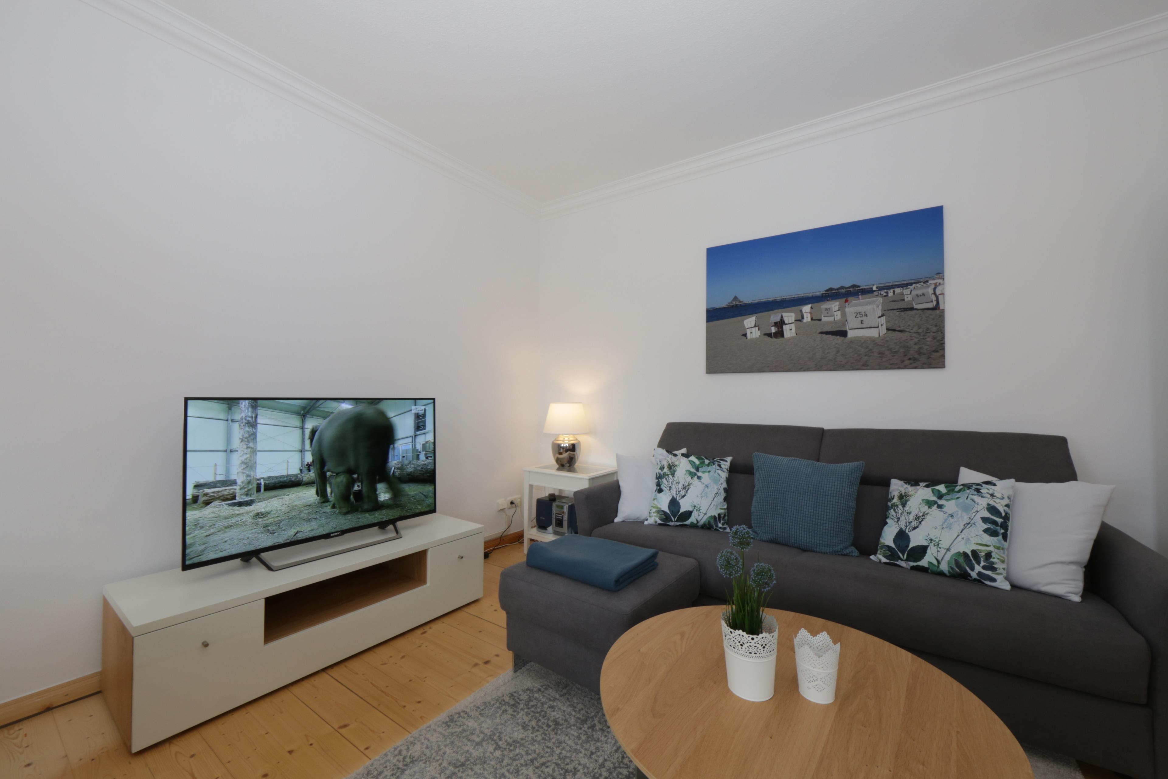 Diese liebevoll und modern eingerichtete 52 qm große Zwei-Zimmer Wohnung befindet sich im 2. Obergeschoss und bietet 2-4 Personen viel Platz für einen entspannten Urlaub am Meer. Das helle Wohnzimmer ist mit einer Schlafcouch (Liegefläche 160 x 200), TV und einem elektrischen Kamin sowie einem separaten Essplatz eingerichtet. Die halb offene Küche ist ausgestattet mit Ceranfeld, kleiner Spülmaschine, Kühlschrank, Mikrowelle, Kaffee- und Nespresso-Maschine. Von der Küche begehbar ist der kleine Balkon in Richtung Meer. Hier haben Sie einen traumhaften Blick in die verkehrsberuhigte Bismarckstraße bis hinunter zur Promenade und auf die Ostsee. Den schönen Blick genießen Sie auch aus dem Wohn- und Schlafzimmer. Das Schlafzimmer bietet Ihnen ein Boxspringbett mit getrennten Matratzen (durchgängiger Topper 180 x 200) und reichlich Platz im Kleiderschrank. Der gesamte Wohnbereich ist mit Echtholzdielen ausgelegt. Darüber hinaus steht den Gästen ein Duschbad mit Waschbecken/WC und eine eigene Sauna zur Verfügung.