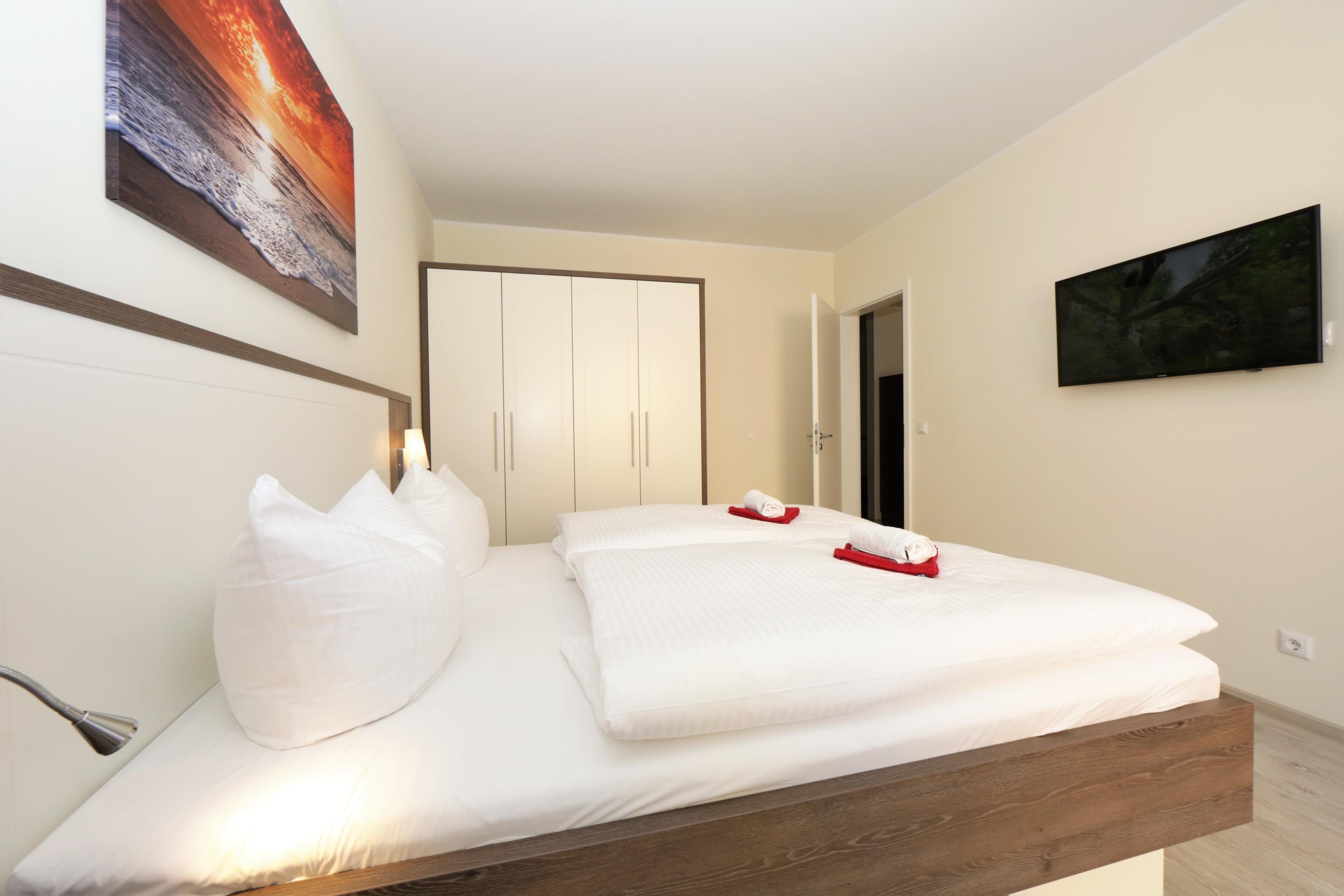 Dieses hochwertige, moderne 2-Zimmer Appartement ist 58 qm groß und befindet sich im 1. Obergeschoss der 2018 neu erbauten Strandresidenz. Die Wohnung ist für 2-4 Personen geeignet. Im Wohnbereich erwartet Sie eine bequeme Polstergarnitur mit Schlaffunktion (Matratze 160 x 200), ein Couchtisch und Flat TV sowie ein Esstisch für gemeinsame Mahlzeiten. Die Küche mit Cerankochfeld, Backofen, Mikrowelle, Geschirrspülmaschine, Kühlschrank etc. ist ebenfalls offen im Wohnraum integriert. Über den Wohnbereich sowie das Schlafzimmer erreichen Sie den zur Promenade und nach Westen ausgerichteten überdachten Balkon von dem aus Sie das Meer, eingeschränkt durch Kiefern, sehen können. Das Schlafzimmer verfügt über ein komfortables Doppelbett mit getrennten Matratzen (90 x 200), einen Kleiderschrank und Flat TV. Das großzügige moderne Badezimmer ist mit einer bodengleichen Dusche mit Echtglasabtrennung und Waschtisch/WC ausgestattet.