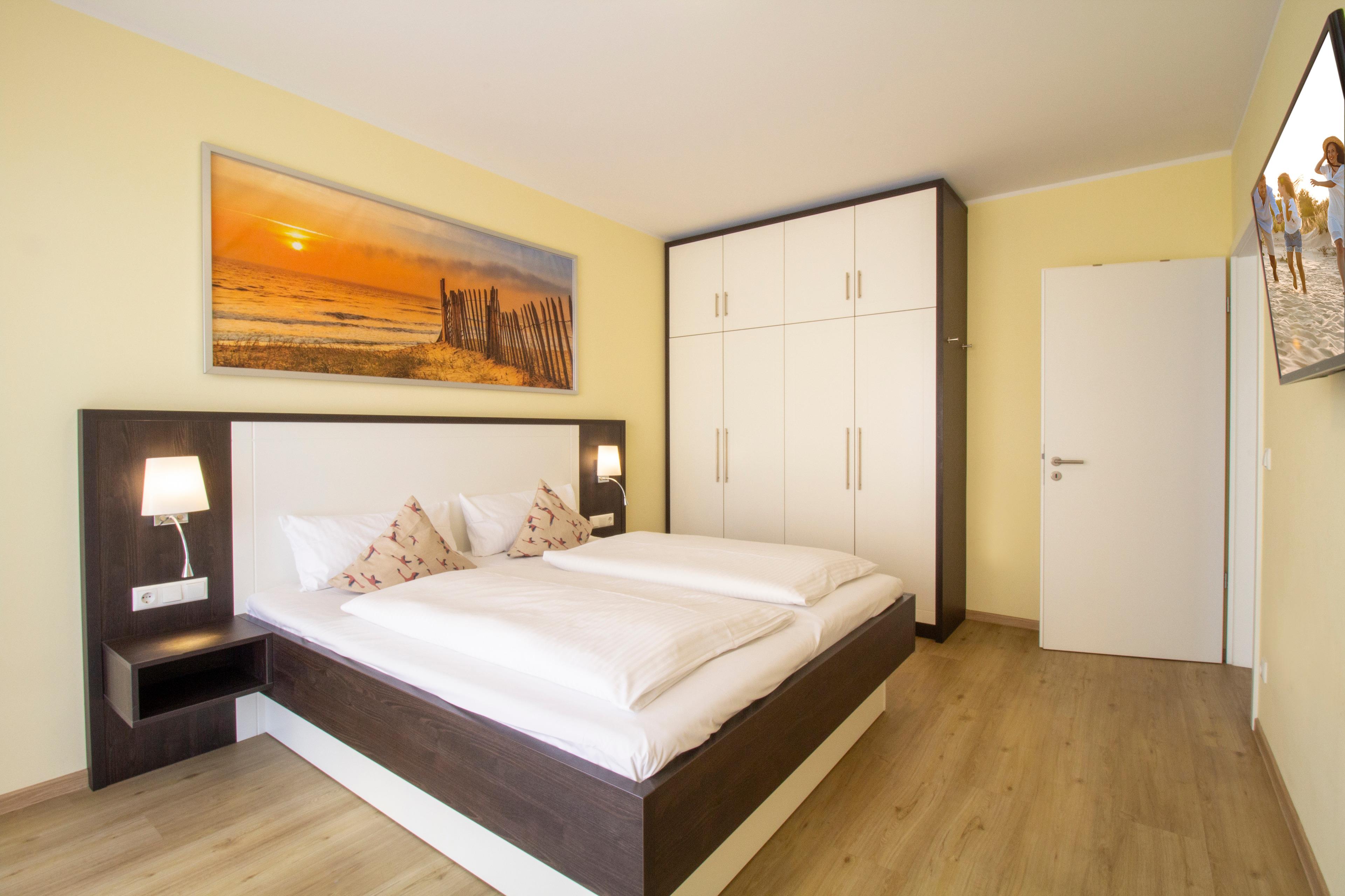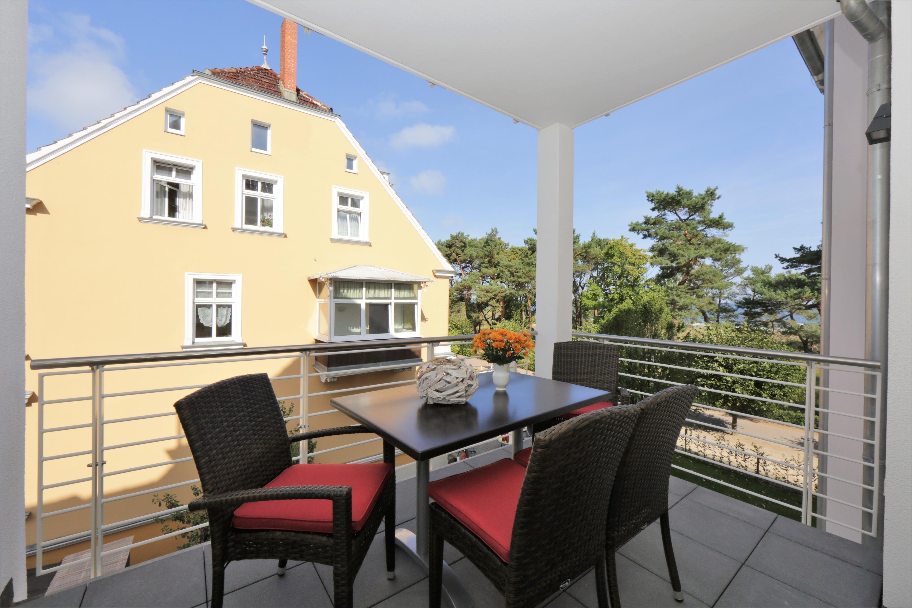 Dieses hochwertige, moderne 2-Zimmer Appartement ist 58 qm groß und befindet sich im 2. Obergeschoss der 2018 neu erbauten Strandresidenz. Die Wohnung ist für 2-4 Personen geeignet. Im Wohnbereich erwartet Sie eine bequeme Polstergarnitur mit Couchtisch und Flat TV sowie ein Esstisch für gemeinsame Mahlzeiten. Die Küche mit Cerankochfeld, Backofen, Geschirrspülmaschine, Kühlschrank etc. ist ebenfalls offen im Wohnraum integriert. Über den Wohnbereich sowie das Schlafzimmer erreichen Sie den zur Promenade und nach Westen ausgerichteten überdachten Balkon von dem aus Sie das Meer, eingeschränkt durch Kiefern, sehen können. Das Schlafzimmer verfügt über ein komfortables Doppelbett mit getrennten Matratzen (90 x 200), einen Kleiderschrank und Flat TV. Das großzügige moderne Badezimmer ist mit einer bodengleichen Dusche mit Echtglasabtrennung und Waschtisch/WC ausgestattet.