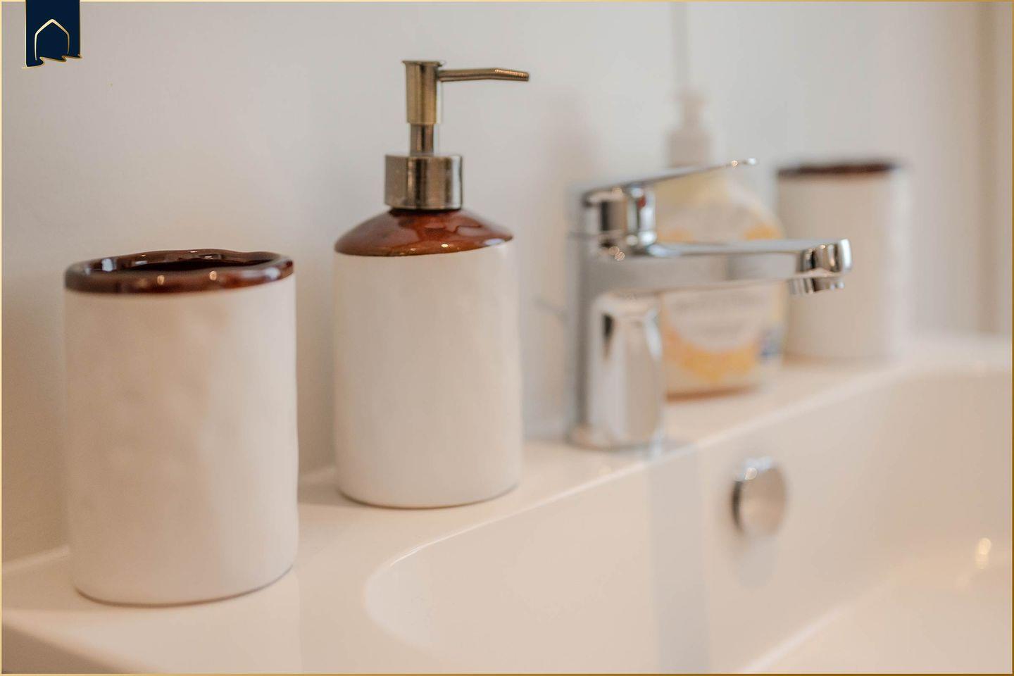 Die gut ausgestattete Küche verfügt über Backofen, Herd, Mikrowelle, Kühlschrank mit Gefrierfach, Spülmaschine, Kaffeemaschine, Wasserkocher, Toaster und alle nötigen Küchenutensilien – ideal für Selbstversorger. Im Essbereich mit großem Tisch können Sie gemeinsam essen oder einfach den Tag bei einem Glas Wein ausklingen lassen. Der angrenzende Wohnbereich lädt mit Sofa, TV und Radio zu gemütlichen Abenden ein. Ein Ganzkörperspiegel, Haartrockner und Waschmaschine sorgen für zusätzlichen Komfort während Ihres Aufenthalts.
