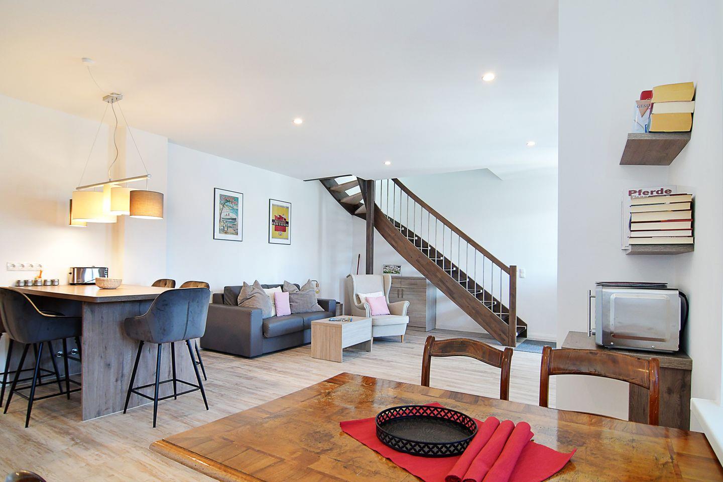 In dieser zweietagigen Doppelhaushälfte befindet sich unten auf ca 40 qm ein großzügiger Raum in dem der Wohnbereich und die offene Küche inkl. zweier Essplätze lokalisiert sind und das helle, geräumige Gäste-WC. Licht flutet diesen Raum durch Tür und 4 große Fenster die sich über die gesamte Front erstrecken. Ebenfalls über die komplett Front erstreckt sich die überdachte Terrasse mit einem weiteren Essplatz.