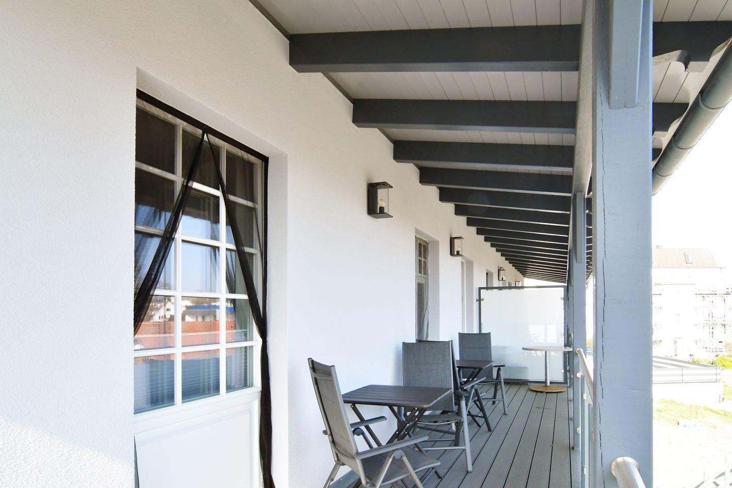 Ebenso in der oberen Etage - Fenster und Türen die viel Licht herein lassen und über die gesamte Front der überdachte Balkon mit Sitzgelegenheiten.