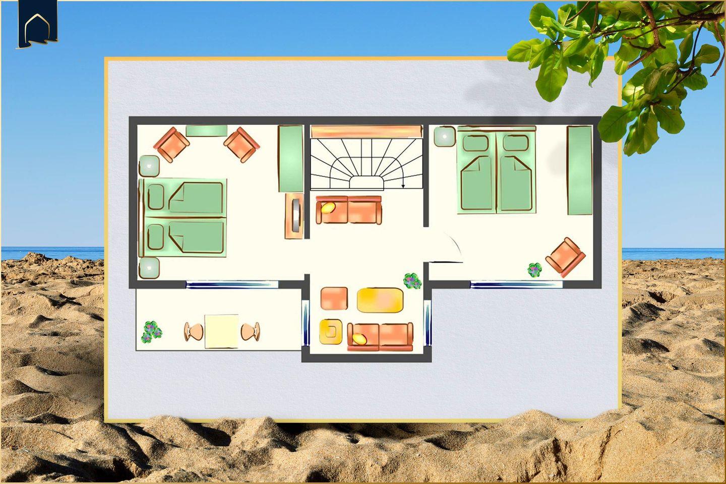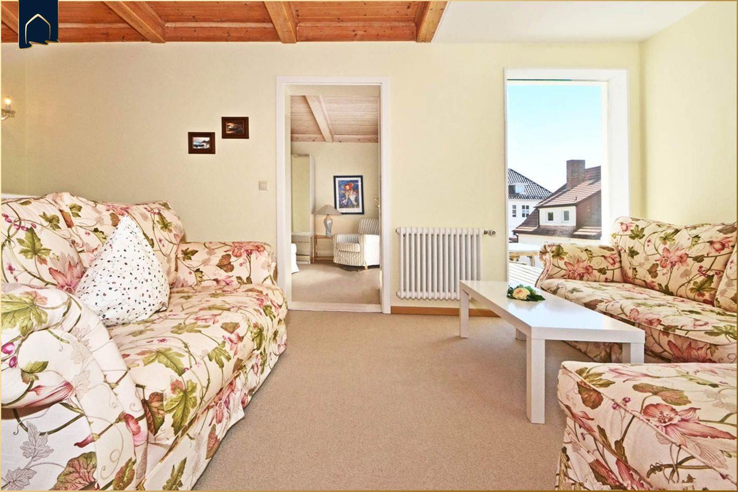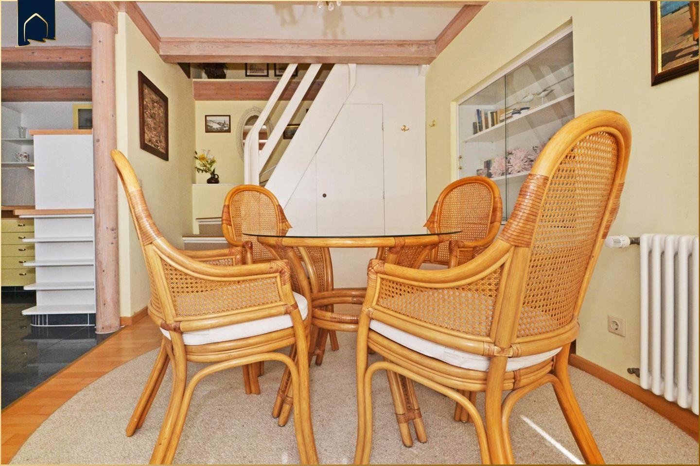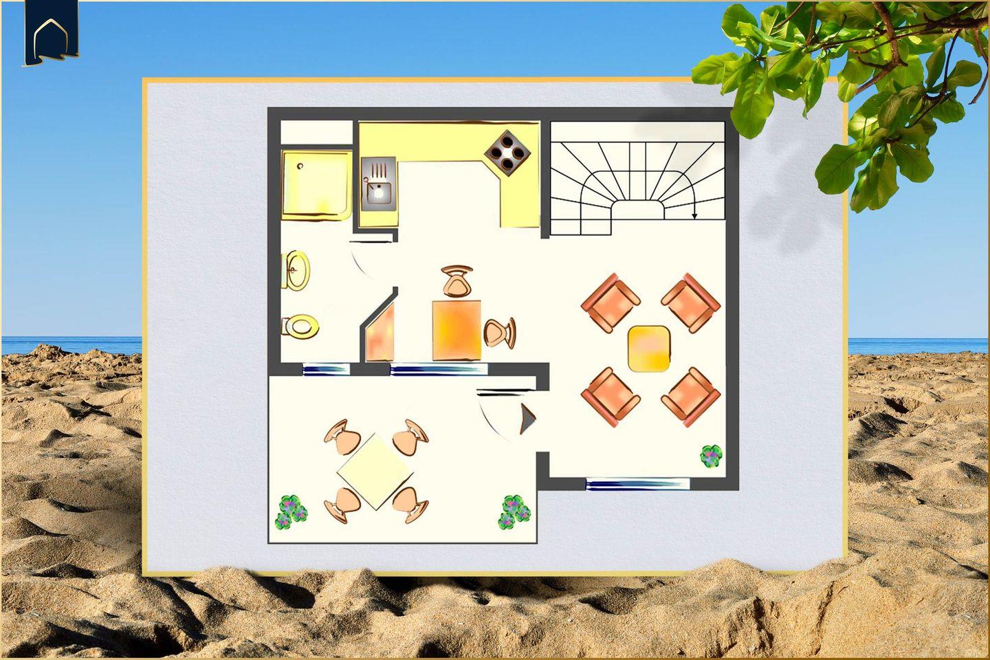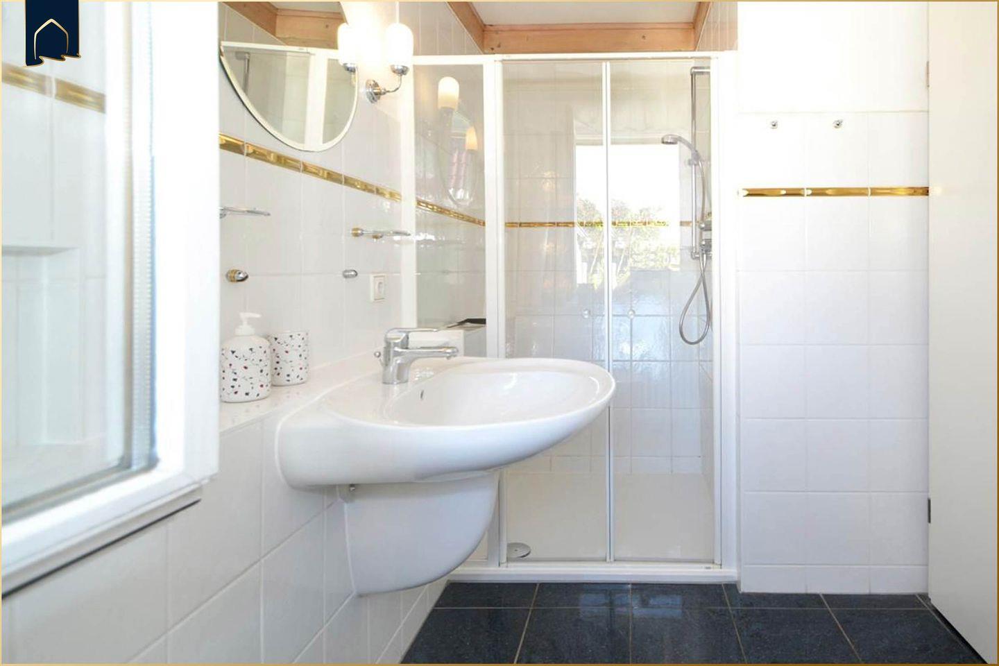 Der helle Wohnbereich mit gemütlicher Sofaecke, Esstisch und Flachbild-TV lädt zum Verweilen ein – ideal für entspannte Abende nach einem Strandtag. Die Terrasse mit Gartenmöbeln ist perfekt für ein Frühstück im Freien oder laue Sommerabende. Für den PKW steht ein Privatparkplatz direkt auf dem Grundstück zur Verfügung.