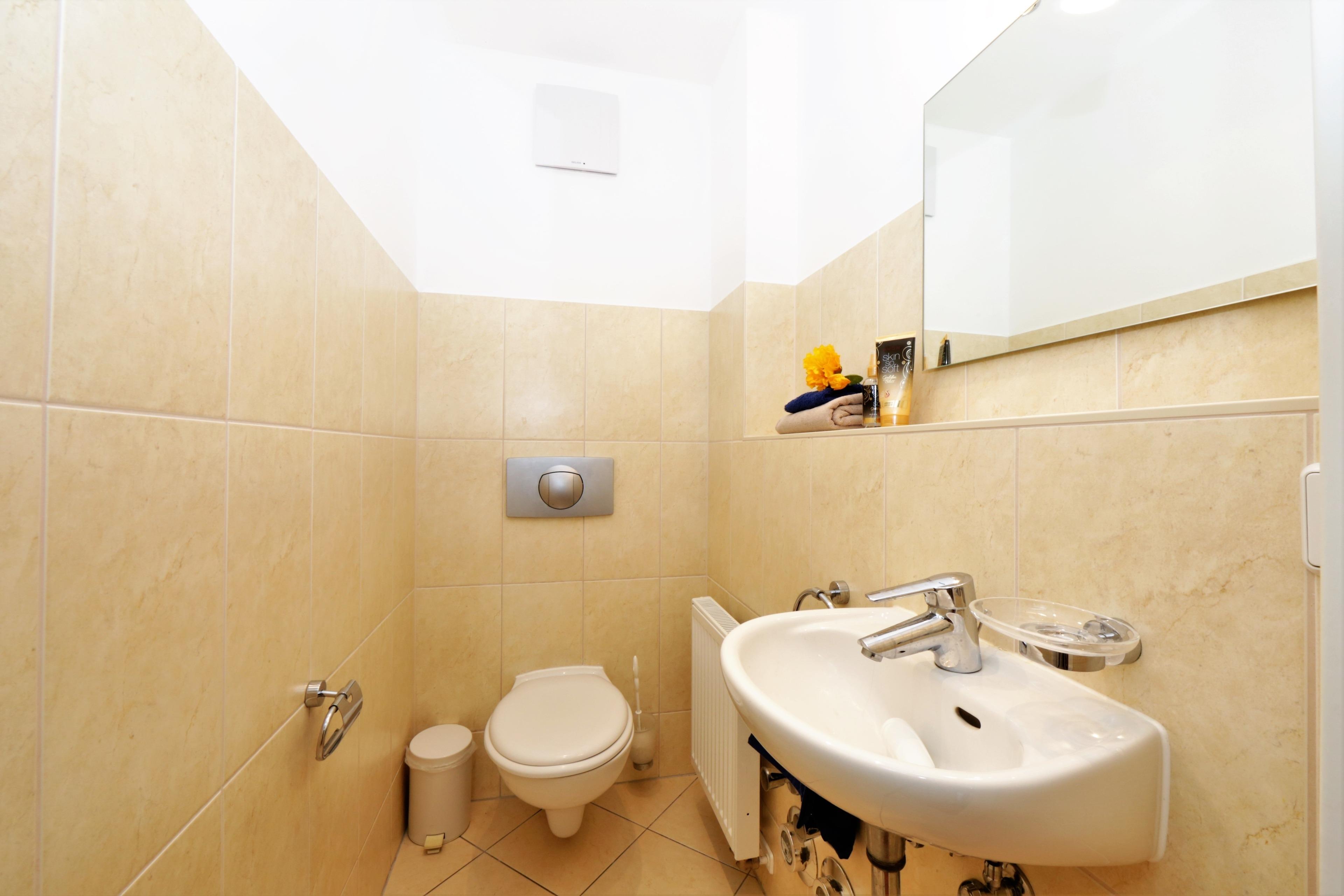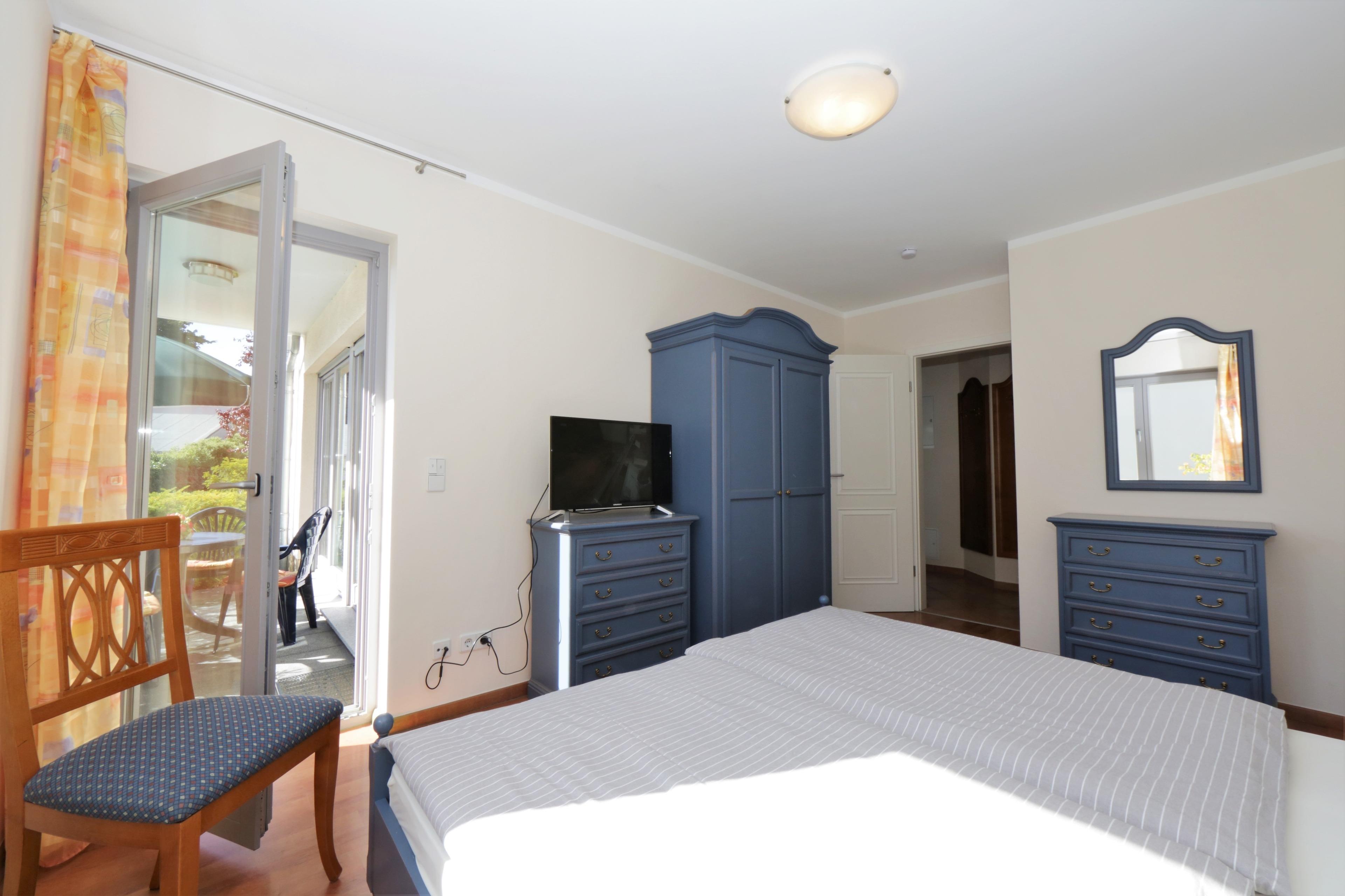 Dieses 62 qm große 3-Zimmer Appartement mit zwei Terrassen befindet sich im Erdgeschoss und eignet sich für 2 bis maximal 5 Personen. Im Wohnzimmer finden Sie eine gemütliche Couchecke mit Radio/TV sowie einen separaten Essplatz. Von hier aus können Sie auch die Terrasse zum Hof/Parkplatz mit südöstlicher Ausrichtung begehen. Die Vollküche mit Geschirrspüler, Cerankochfeld, Mikrowelle etc. ist ebenfalls offen im Wohnraum integriert. Das größere Schlafzimmer ist mit einem Doppelbett mit getrennten Matratzen (90 x 200), Kleiderschrank und Kommoden sowie einem zweiten TV ausgestattet, das kleinere Schlafzimmer mit einem Stockbett und kleinerem Stauraum. Die Terrasse ist zusätzlich vom kleineren Schlafzimmer zu begehen. Das Bad bietet Dusche sowie Badewanne und Doppelwaschbecken, die Toilette befindet sich separat gegenüber. Der Pkw-Stellplatz befindet sich auf dem Grundstück und ist der Wohnung zugeordnet. Im Keller finden Sie einen Fahrrad-Abstellraum, Münzwaschmaschine und Münztrockner.