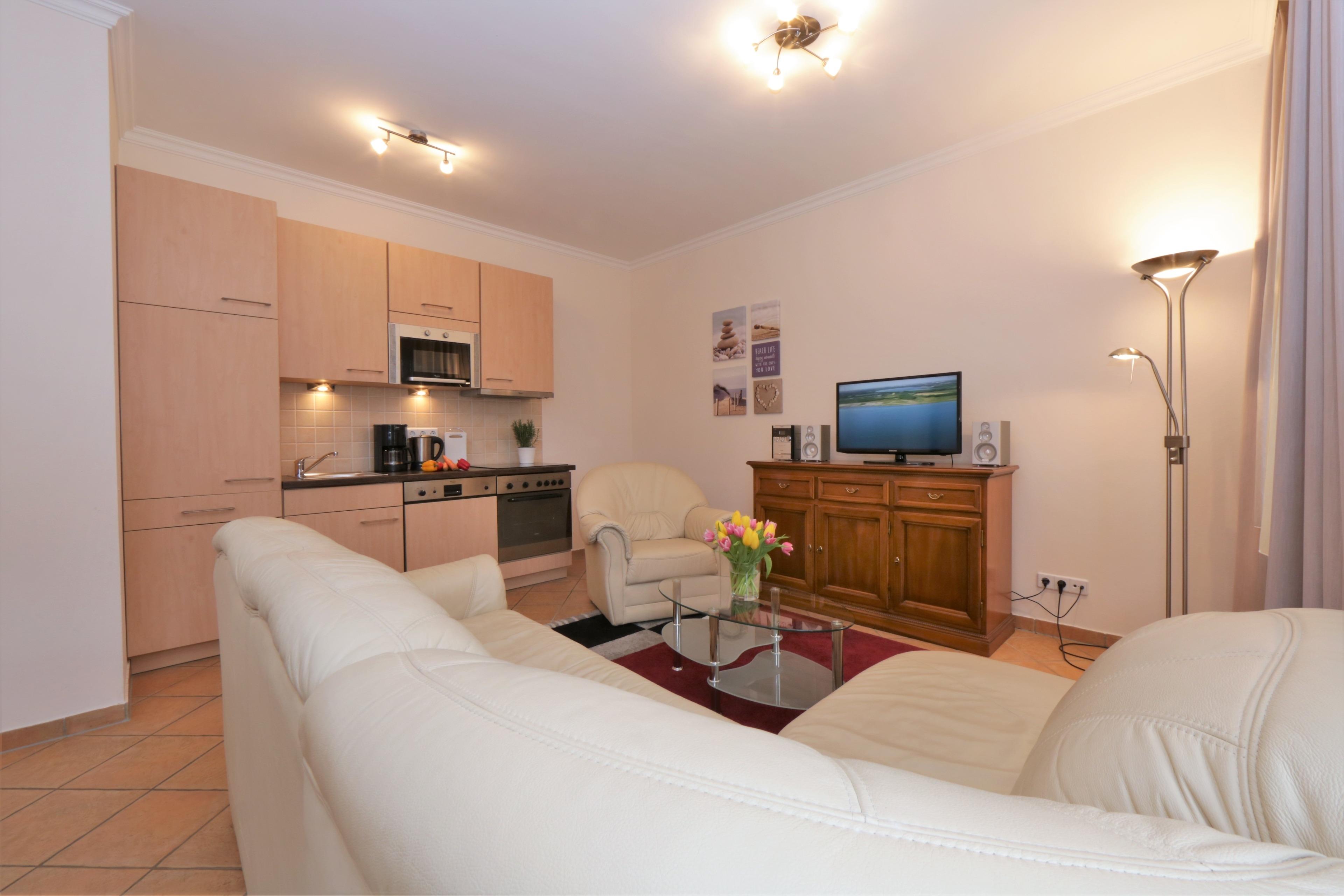 Diese mit italienischen Stilmöbeln eingerichtete 2-Zimmer Wohnung ist 53 m² groß und befindet sich im Erdgeschoss. Die Wohnung ist komfortabel ausgestattet und bietet 2-3 Personen Platz für einen erholsamen Urlaub. Der offene Wohnraum bietet Ihnen eine gemütliche Sitzecke mit Sofa, Sessel und TV. Die Küchenzeile incl. Backofen, Ceranfeld, Kühlschrank, Geschirrspüler, Mikrowelle etc. sowie der Essplatz sind offen im Wohnraum integriert. Vom Wohnzimmer betreten Sie auch den westlich ausgerichteten Balkon, auf dem Sie den Tag mit einem Glas Wein ausklingen lassen können. Von hier aus können Sie auch einen teilweisen Blick auf das Meer erhaschen. Des Weiteren steht Ihnen eine Terrasse zum Garten zur Verfügung. Das Schlafzimmer ist mit einem Doppelbett mit getrennten Matratzen (90 x 200) und einem Kleiderschrank eingerichtet. Das moderne Bad ist mit einer Dusche mit Echtglasabtrennung und Doppelwaschbecken/WC ausgestattet. Außerdem steht den Gästen ein Gäste WC zur Verfügung. Der Pkw- Stellplatz befindet sich auf dem Grundstück und ist der Wohnung zugeordnet.