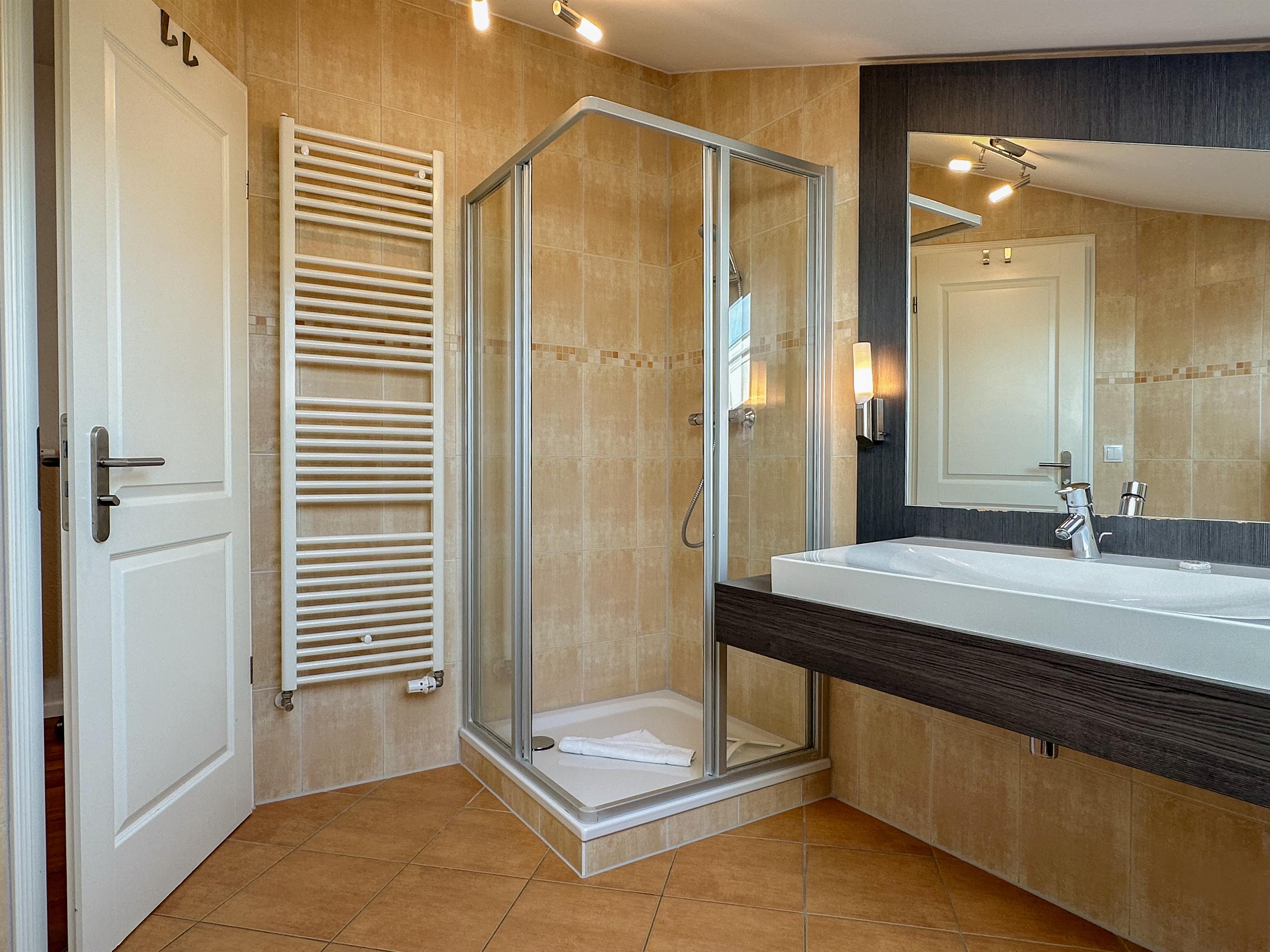 Das moderne Tageslichtbad rundet das Angebot der Wohnung perfekt ab. Helligkeit und Stil dominieren den Raum, der mit einer großzügigen Dusche, einem stilvollen Waschtisch und einem WC ausgestattet ist. Hier finden Sie alles, was Sie für Ihre tägliche Erfrischung benötigen, und können den Tag in angenehmer Atmosphäre beginnen oder ausklingen lassen.