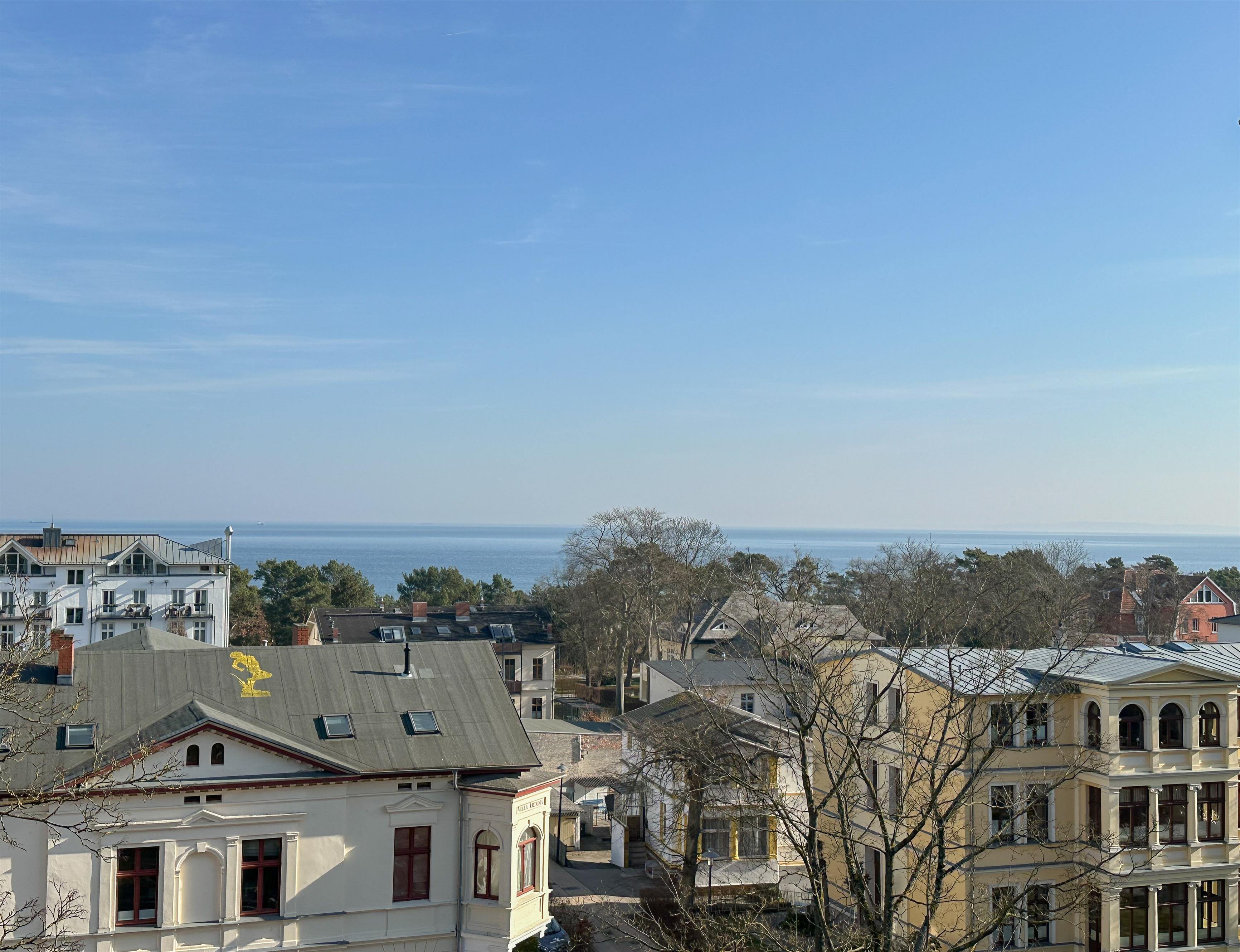 Die verglaste Loggia ist ein weiteres Highlight dieser Wohnung. Sie wird durch das einfallende Tageslicht in eine warme, einladende Atmosphäre getaucht und bietet Ihnen den idealen Platz für gemeinsame Mahlzeiten oder gesellige Abende. Am Esstisch können Sie hier mit der Familie oder Freunden beisammen sein, während Sie den herrlichen Ausblick ins Grüne und über die Dächer des Seebads Heringsdorf genießen. Dieser Ausblick verleiht der Loggia einen besonderen Charme, der sie zu einem bevorzugten Rückzugsort macht. Ob beim Frühstück mit Blick auf die Natur, einem Gläschen Wein am Abend oder bei gemütlichen Spieleabenden – die Loggia bietet den perfekten Rahmen für entspannte Stunden.
