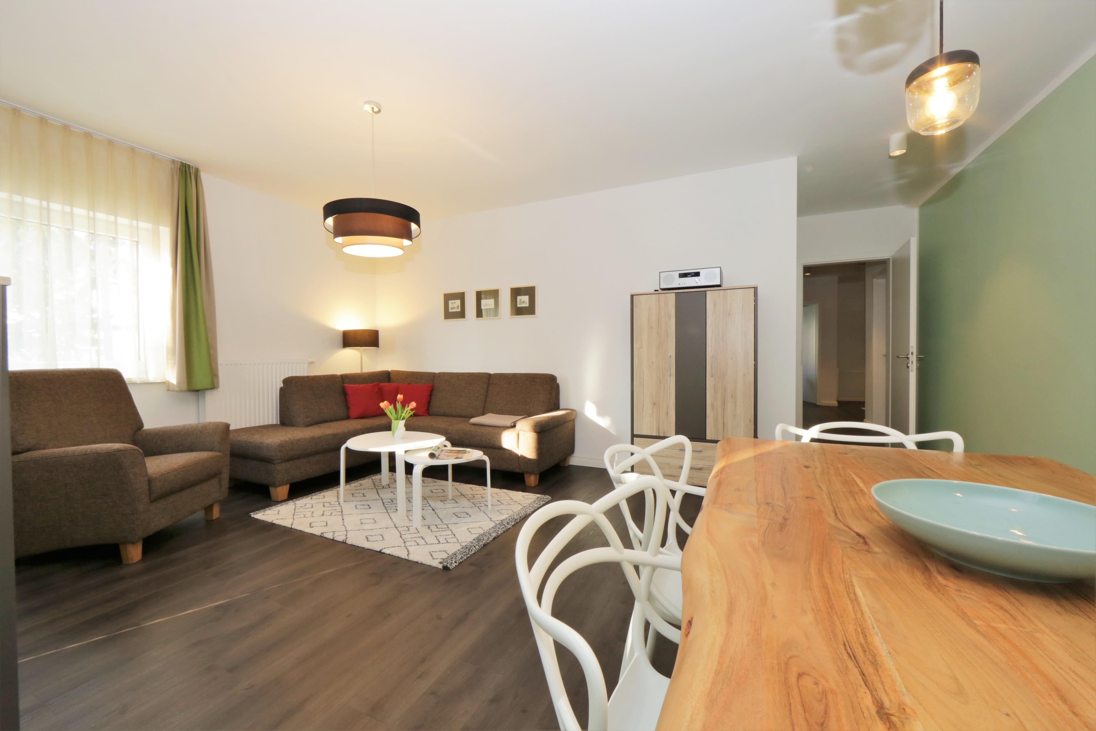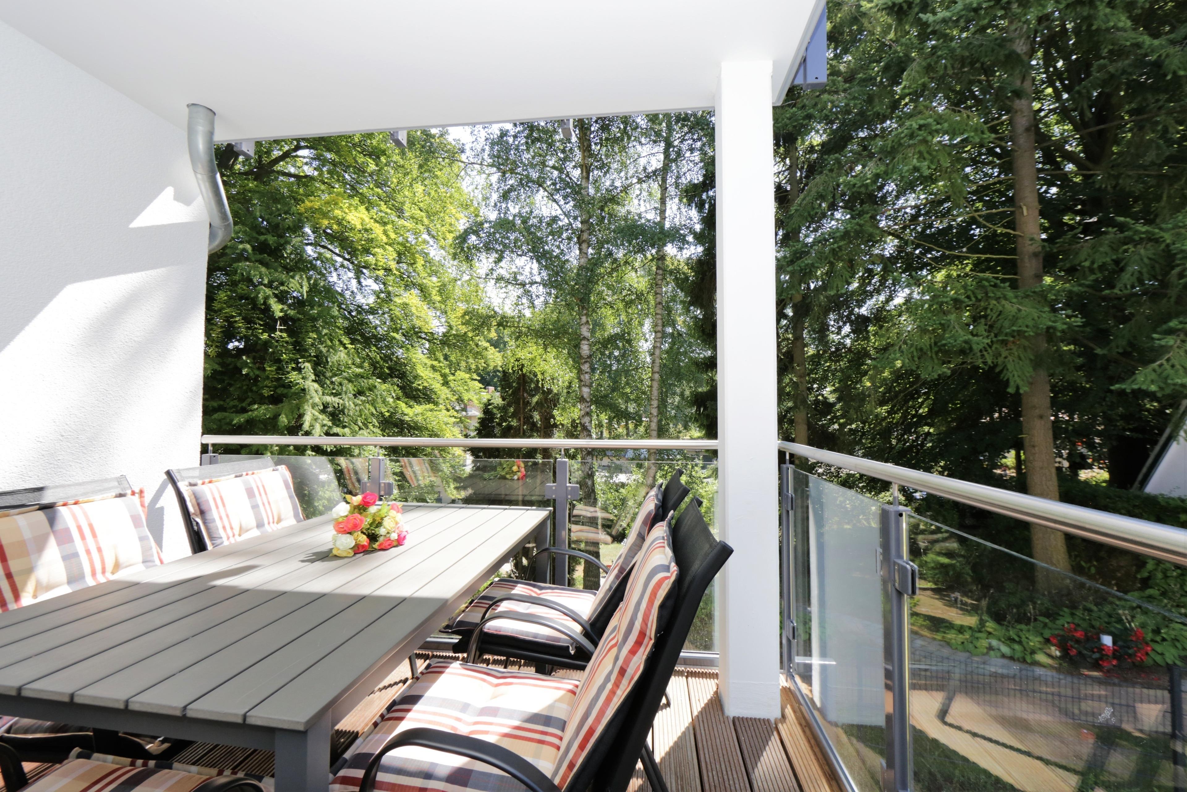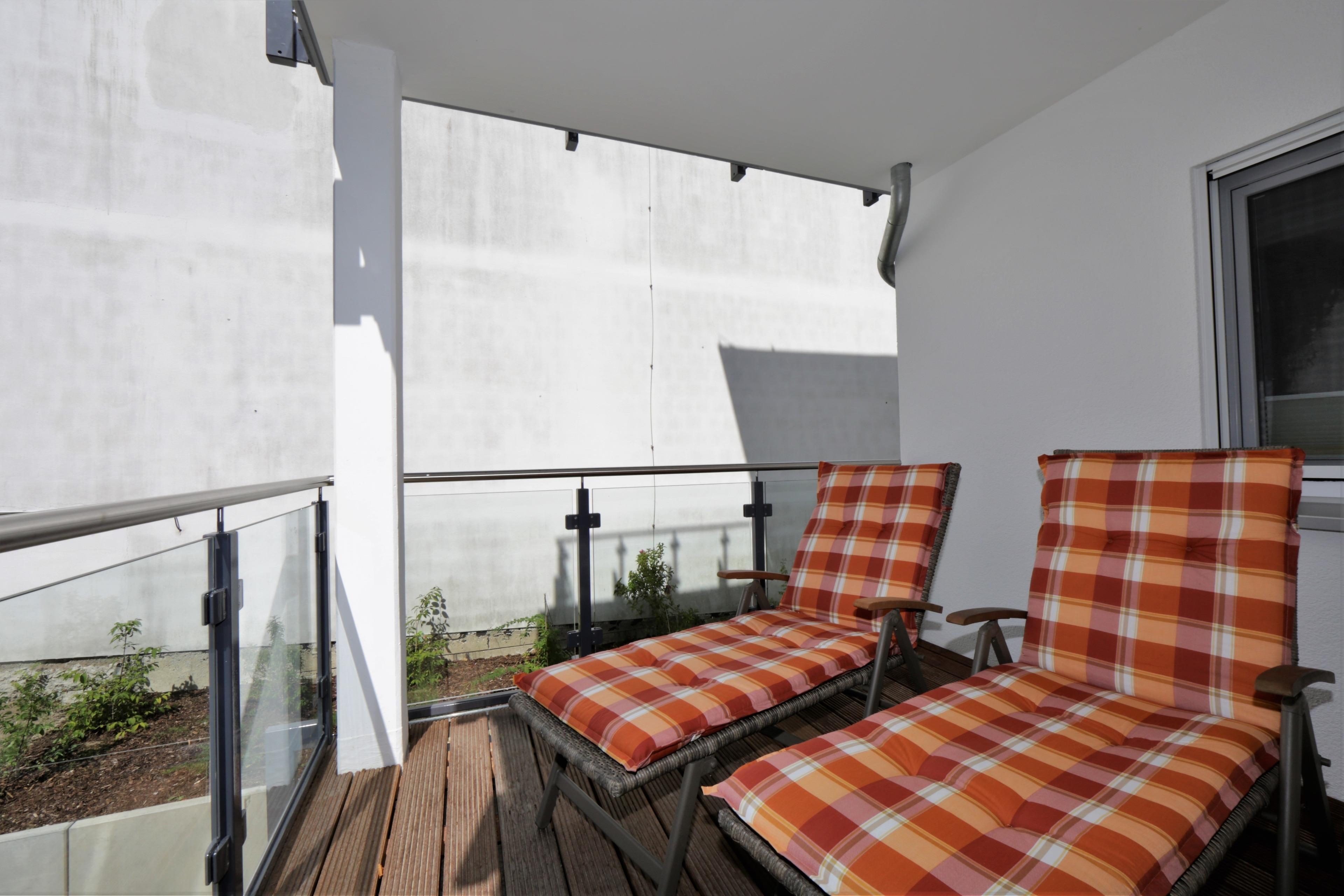 Dieses mit 90 qm großzügige 3-Zimmer Appartement befindet sich im 1. Obergeschoss und eignet sich für max. 5 Personen und ein Baby. Der großzügige Wohnraum erwartet seine Gäste mit einer modernen Sitzgarnitur zum Relaxen, Couchtisch und Flat- TV. Der Essplatz mit rustikalem Echtholztisch sowie die moderne Küchenzeile befinden sich ebenfalls im Wohnraum. Die Küche bietet Ihnen Cerankochfeld, Backofen, Mikrowelle, Geschirrspüler, Kühlschrank etc. Der große überdachte südöstlich ausgerichtete Balkon mit Blick ins Grüne lockt Sie bereits zum Frühstück ins Freie und ist vom Wohnraum aus begehbar. Beide Schlafzimmer sind mit einem Doppelbett mit getrennten Matratzen (80 bzw. 90 x 200) und einem Kleiderschrank eingerichtet. Für die 5. Person bietet ein zusätzliches Schrankbett in einem der Schlafzimmer den Schlafplatz. Ein zweiter nach Süden und ins Grüne ausgerichteter ebenfalls überdachter Balkon ist mit Sonnenliegen möbliert und lädt zum Relaxen und Lesen an. Das moderne Badezimmer mit Fenster ist mit einer Dusche und Waschtisch/WC ausgestattet. Außerdem steht den Gästen eine Waschmaschine im Bad zur Verfügung. Ein Kinderreisebett und ein Hochstuhl befinden sich im Appartement und stehen zur Nutzung bereit. Dem Appartement ist ein Pkw-Stellplatz in der Tiefgarage zugeordnet.