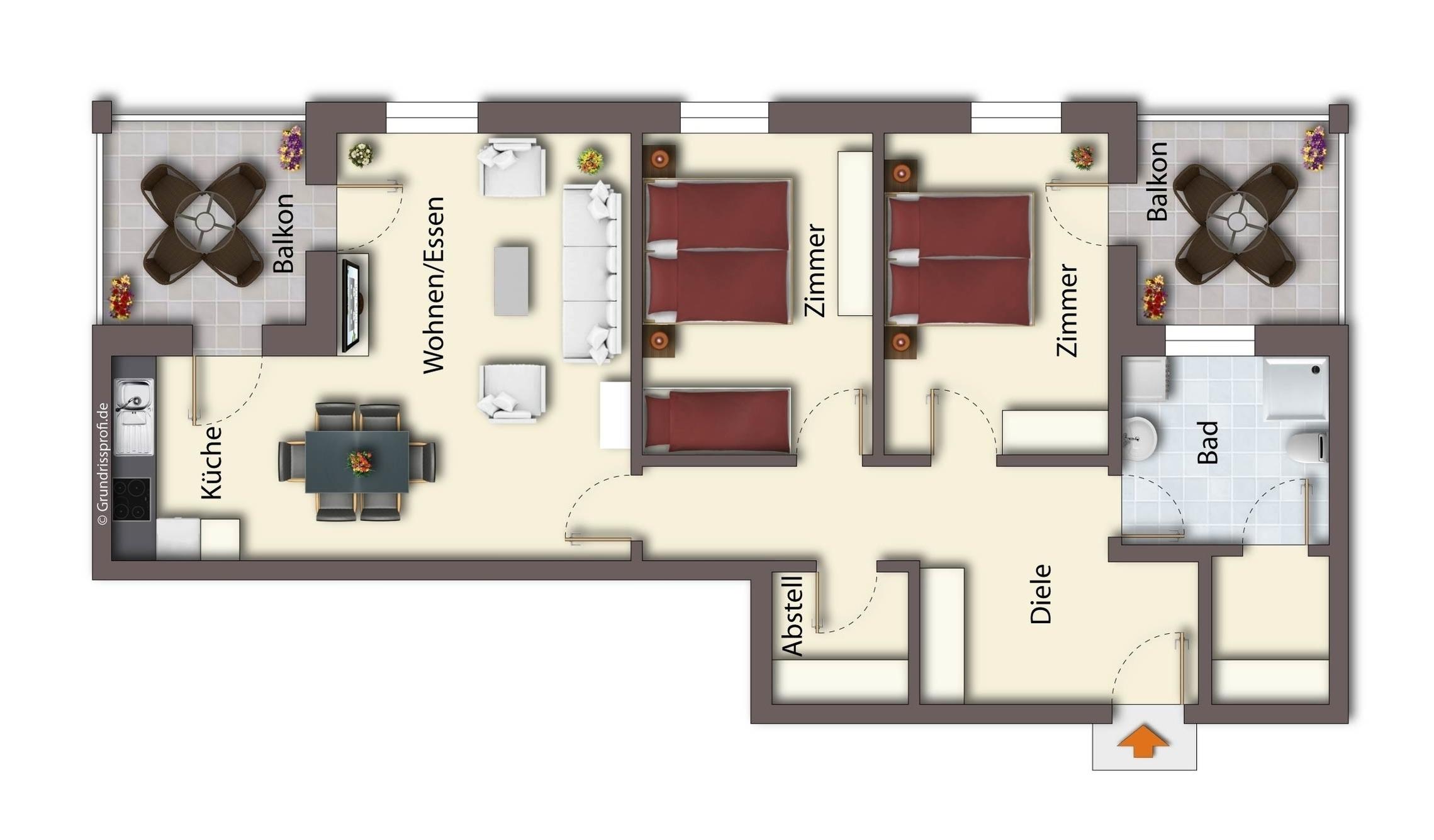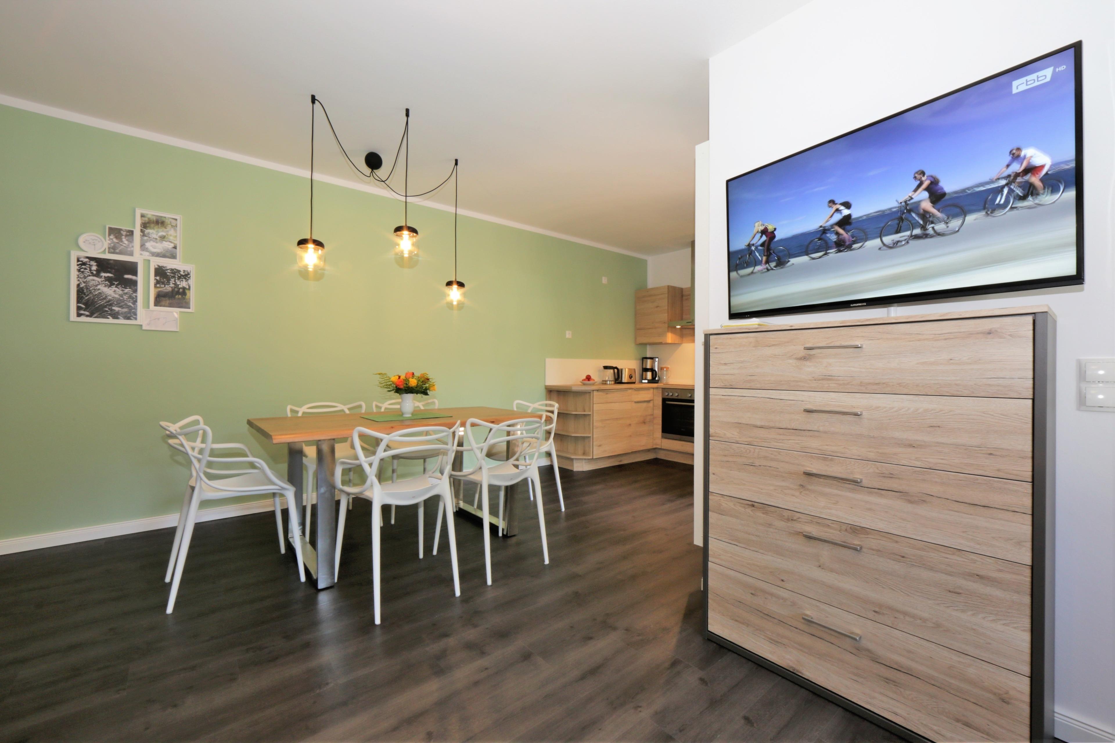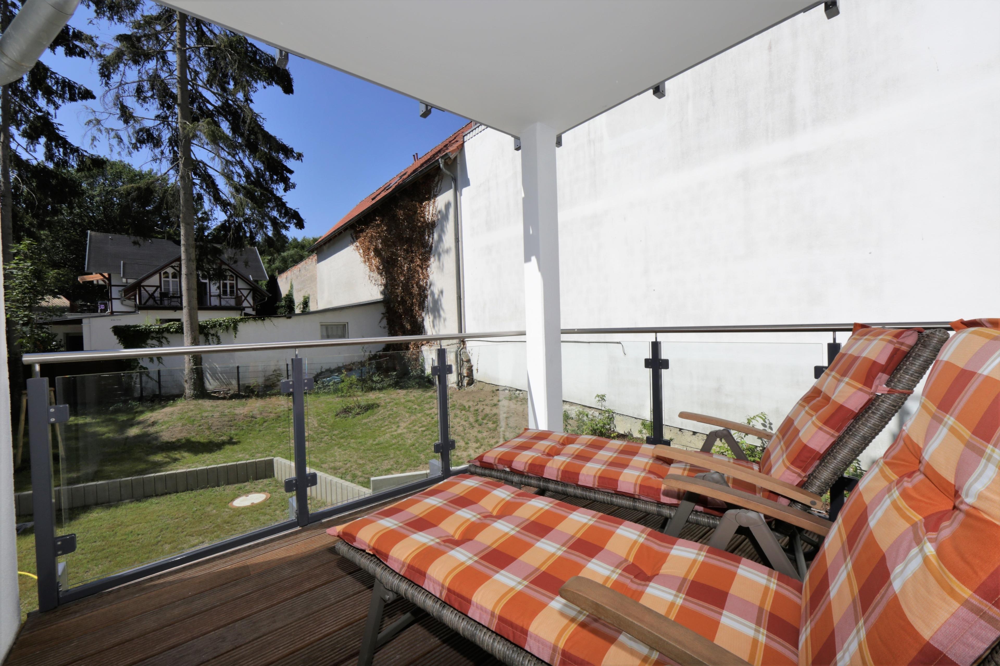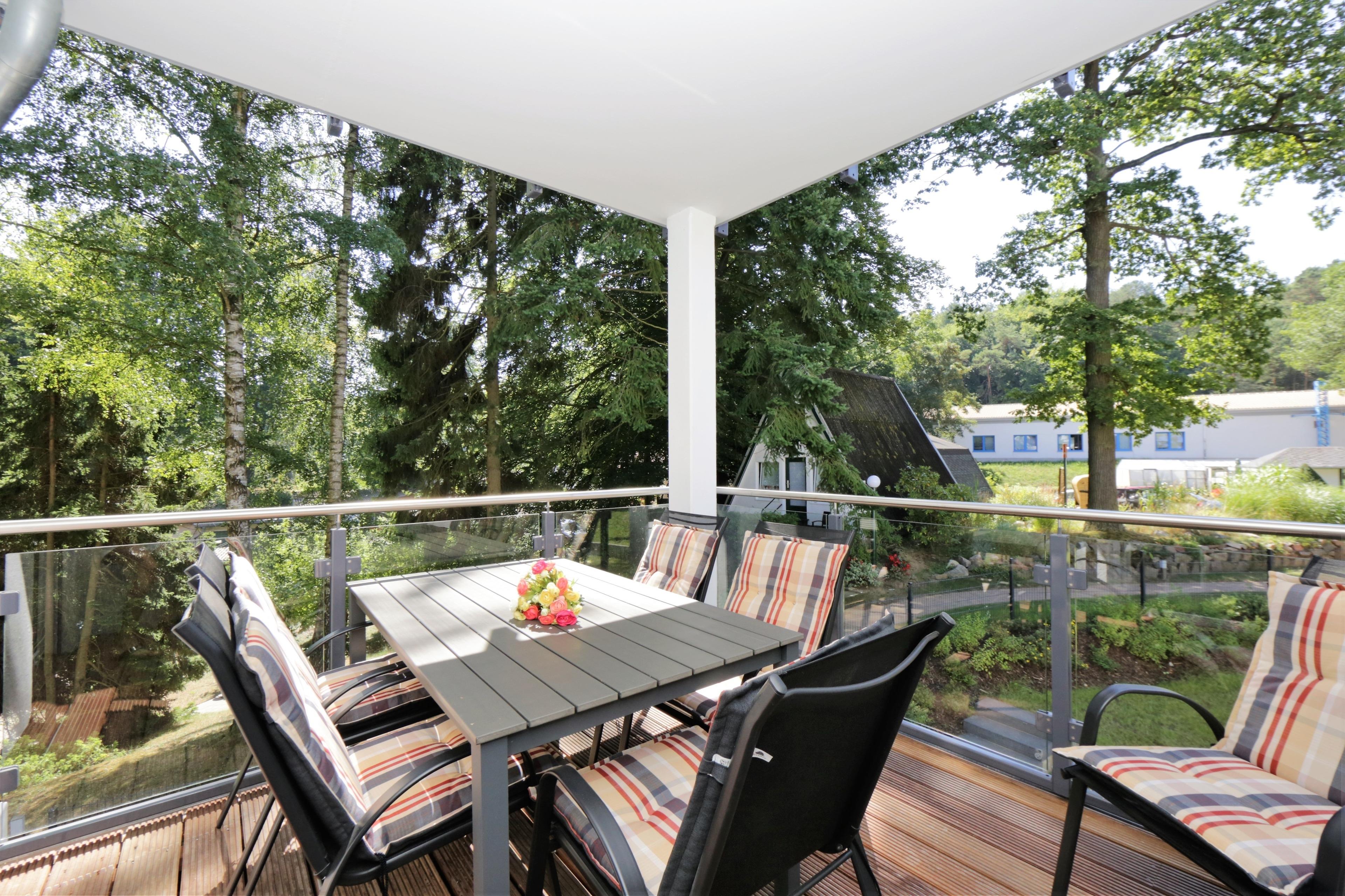 Dieses mit 90 qm großzügige 3-Zimmer Appartement befindet sich im 1. Obergeschoss und eignet sich für max. 5 Personen und ein Baby. Der großzügige Wohnraum erwartet seine Gäste mit einer modernen Sitzgarnitur zum Relaxen, Couchtisch und Flat- TV. Der Essplatz mit rustikalem Echtholztisch sowie die moderne Küchenzeile befinden sich ebenfalls im Wohnraum. Die Küche bietet Ihnen Cerankochfeld, Backofen, Mikrowelle, Geschirrspüler, Kühlschrank etc. Der große überdachte südöstlich ausgerichtete Balkon mit Blick ins Grüne lockt Sie bereits zum Frühstück ins Freie und ist vom Wohnraum aus begehbar. Beide Schlafzimmer sind mit einem Doppelbett mit getrennten Matratzen (80 bzw. 90 x 200) und einem Kleiderschrank eingerichtet. Für die 5. Person bietet ein zusätzliches Schrankbett in einem der Schlafzimmer den Schlafplatz. Ein zweiter nach Süden und ins Grüne ausgerichteter ebenfalls überdachter Balkon ist mit Sonnenliegen möbliert und lädt zum Relaxen und Lesen an. Das moderne Badezimmer mit Fenster ist mit einer Dusche und Waschtisch/WC ausgestattet. Außerdem steht den Gästen eine Waschmaschine im Bad zur Verfügung. Ein Kinderreisebett und ein Hochstuhl befinden sich im Appartement und stehen zur Nutzung bereit. Dem Appartement ist ein Pkw-Stellplatz in der Tiefgarage zugeordnet.