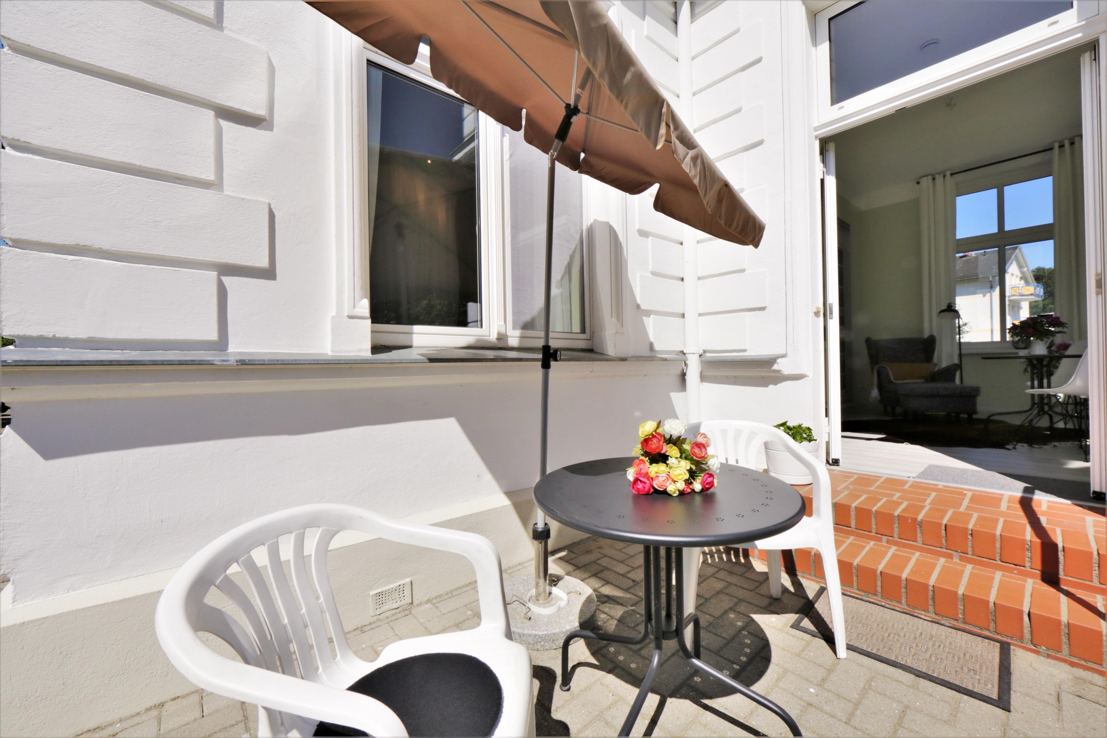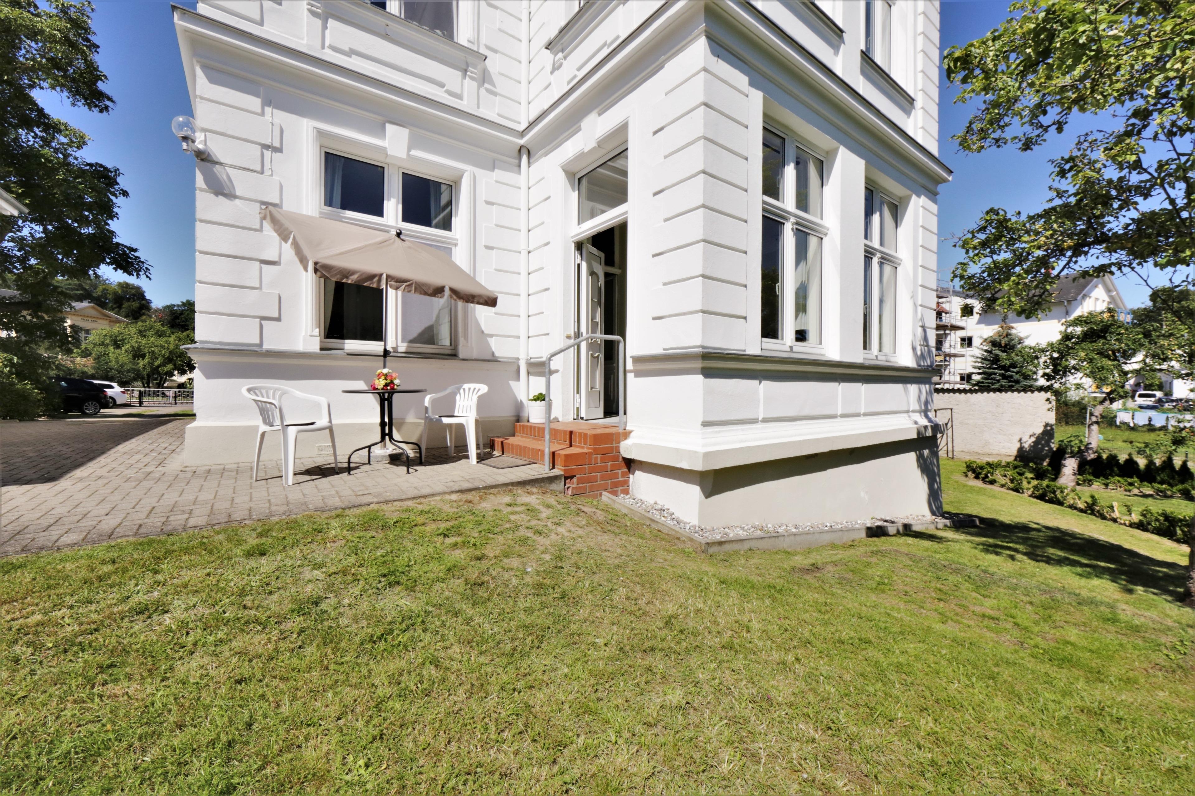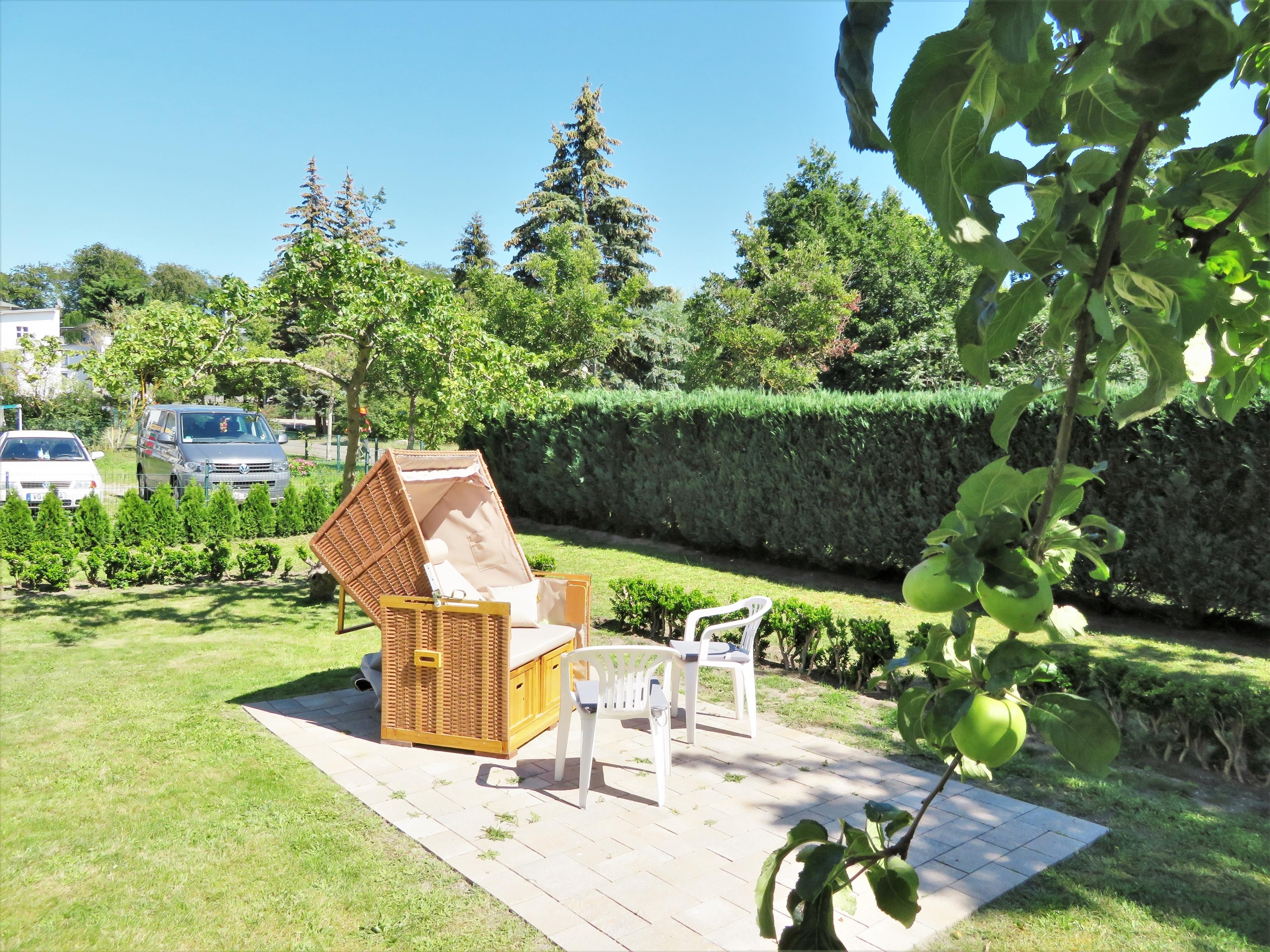 Klein aber fein erfüllt dieses geschmackvolle 1,5 Zimmer-Appartement alle Wünsche für ein erholungssuchendes Paar. Das 45 qm große Appartement liegt auf der Rückseite der Villa. Über den separaten Eingang betreten Sie die liebevoll eingerichtete Loggia, die einen Platz zum Essen bietet und eine gemütliche Leseecke. Von hier aus schweift der Blick über den herrlichen Garten, in dem Sie überall ein Plätzchen zum Verweilen finden und von der Sonne reichlich verwöhnt werden. Hier genießen Sie die Stille mitten im Herzen von Heringsdorf, was die Wohnung ziemlich einzigartig macht. Im dahinterliegenden großzügigen Wohnraum sorgen ein Sofa und Flat-TV für Wohnlichkeit. Stylisch aus einem Guss sind Sofa und Boxspringbett, die Kopf an Kopf gestellt und gekonnt mit einem eleganten Leinenvorhang optisch voneinander getrennt wurden. Ein schöner Einzelschrank bietet ausreichend Stauraum. Im Abstellraum steht eine Kleiderstange zur Verfügung. Im hinteren Bereich des Wohnraums befindet sich die Vollküche inkl. Geschirrspüler, Kühlschrank, Backofen mit Cerankochfeld etc. Das Bad ist mit einer Dusche und Waschbecken/WC ausgestattet. Ein Stellplatz befindet sich auf dem Grundstück und ist der Wohnung zugeordnet.
