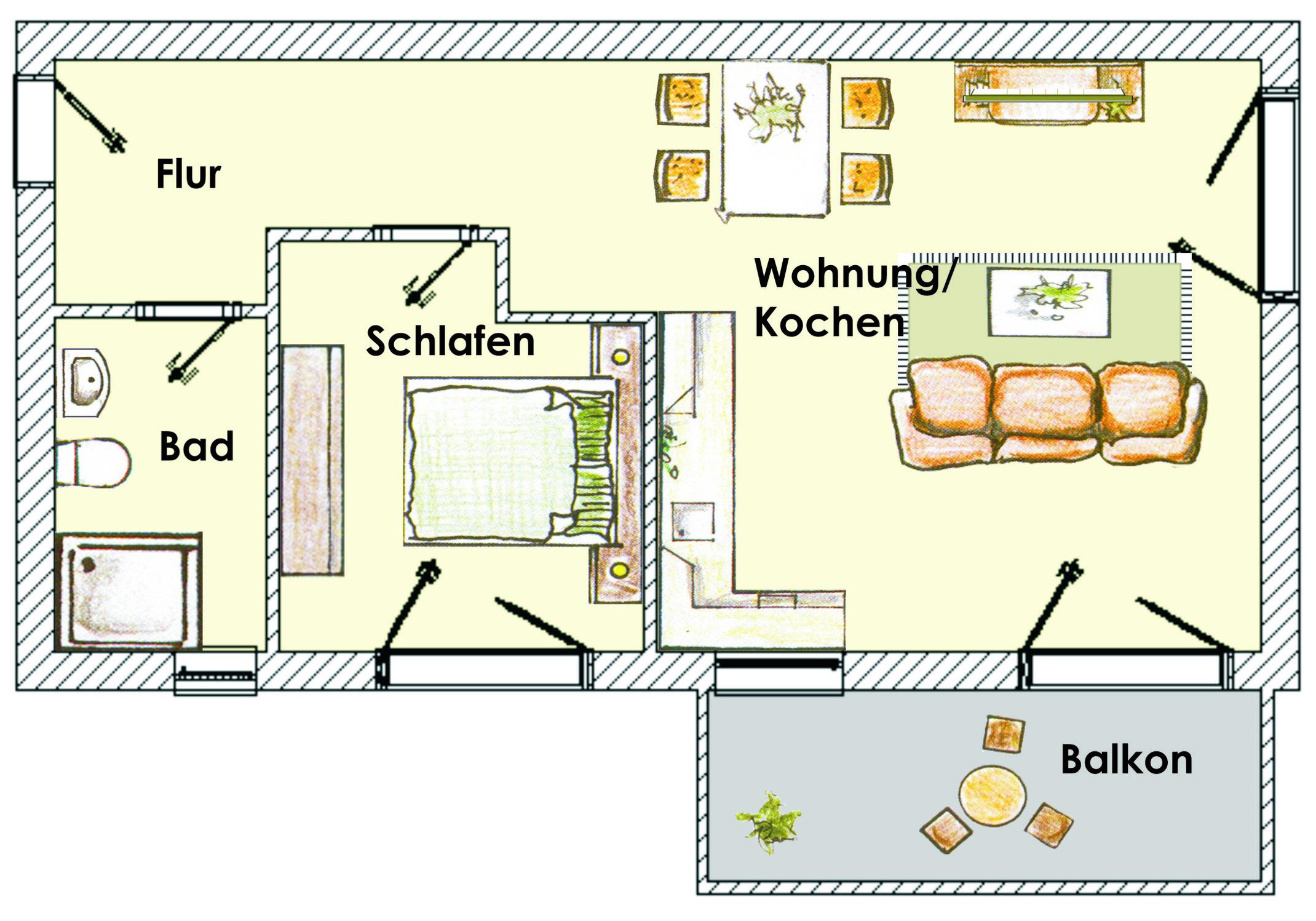 Dieses modern und hochwertig eingerichtete 45 qm große 2-Zimmer-Appartement liegt im 1. Obergeschoss und eignet sich für 2 bis 4 Personen. Der Wohnraum ist mit einer gemütlichen Sitzecke (mit Schlaffunktion 1,25 x 1,80m) sowie einem Essbereich ausgestattet. Die offen im Wohnbereich integrierte Küchenzeile ist mit Geschirrspüler, Cerankochfeld, Backofen p.p. ausgestattet. Der vom Wohnraum begehbare Balkon mit Südwestausrichtung verspricht viel Sonne. Das helle Schlafzimmer verfügt über ein Doppelbett mit getrennten Matratzen (80 x 200) und genügend Schrankraum. Im Bad mit kleinem Fenster finden Sie eine ebenerdige Dusche sowie Waschtisch und WC. Ein separater abschließbarer Fahrradraum mit Stromanschluss (für Elektrofahrräder geeignet) befindet sich im Gebäude, ein Pkw- Stellplatz auf dem Grundstück ist dem Appartement zugeordnet.