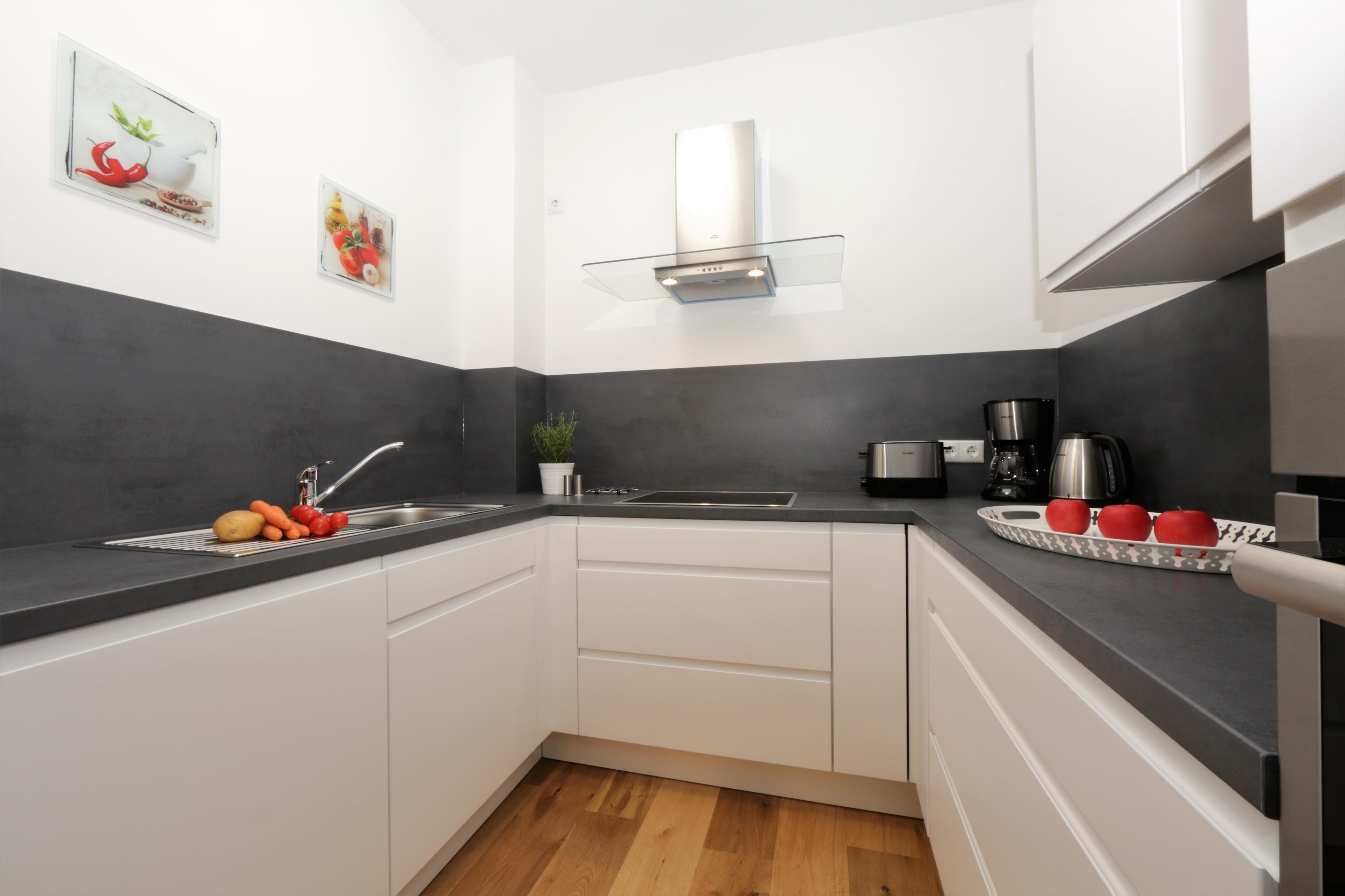 Dieses exklusive und mit seinen 115 qm großzügige 3-Zimmer Appartement im 3. Obergeschoss erreichen Sie über den Fahrstuhl. Die modern eingerichtete Wohnung ist für 4 Personen geeignet. Der große offene und helle Wohnraum ist geschmackvoll mit hochwertigen Echtholzmöbeln eingerichtet und bietet den Gästen eine gemütliche Sitzgruppe und einen großen Flat TV zum Relaxen. In einem separaten Lesesessel am Fenster können Sie Ihre Urlaubslektüre genießen. Der Esstisch für 6 Personen ist ebenfalls im Wohnraum integriert und lädt zu gemeinsamen Mahlzeiten ein. Die moderne offene Küche bietet viel Platz und ist mit Induktionskochfeld, Backofen, Geschirrspüler und Kühlschrank mit Gefrierfach ausgestattet. Der südlich ausgerichtete Balkon verläuft über die gesamte Wohnungsbreite und lockt die Gäste zu jeder Tageszeit ins Freie. Hier finden Sie immer ein windgeschütztes oder sonniges Plätzchen. Beide Schlafzimmer sind jeweils mit einem komfortablen Boxspringbett mit getrennten Matratzen (90 x 200) und einem Kleiderschrank eingerichtet. In einem der beiden Schlafzimmer kann ein zweiter TV genutzt werden. Die Fußböden der Wohn- und die Schlafräume sind mit Echtholzparkett belegt. Das großzügige und moderne Badezimmer ist mit einer ebenerdigen Echtglasdusche und Waschbecken/ WC ausgestattet. Außerdem steht den Gästen eine Waschmaschine und eine Gästetoilette mit Waschbecken zur Verfügung.