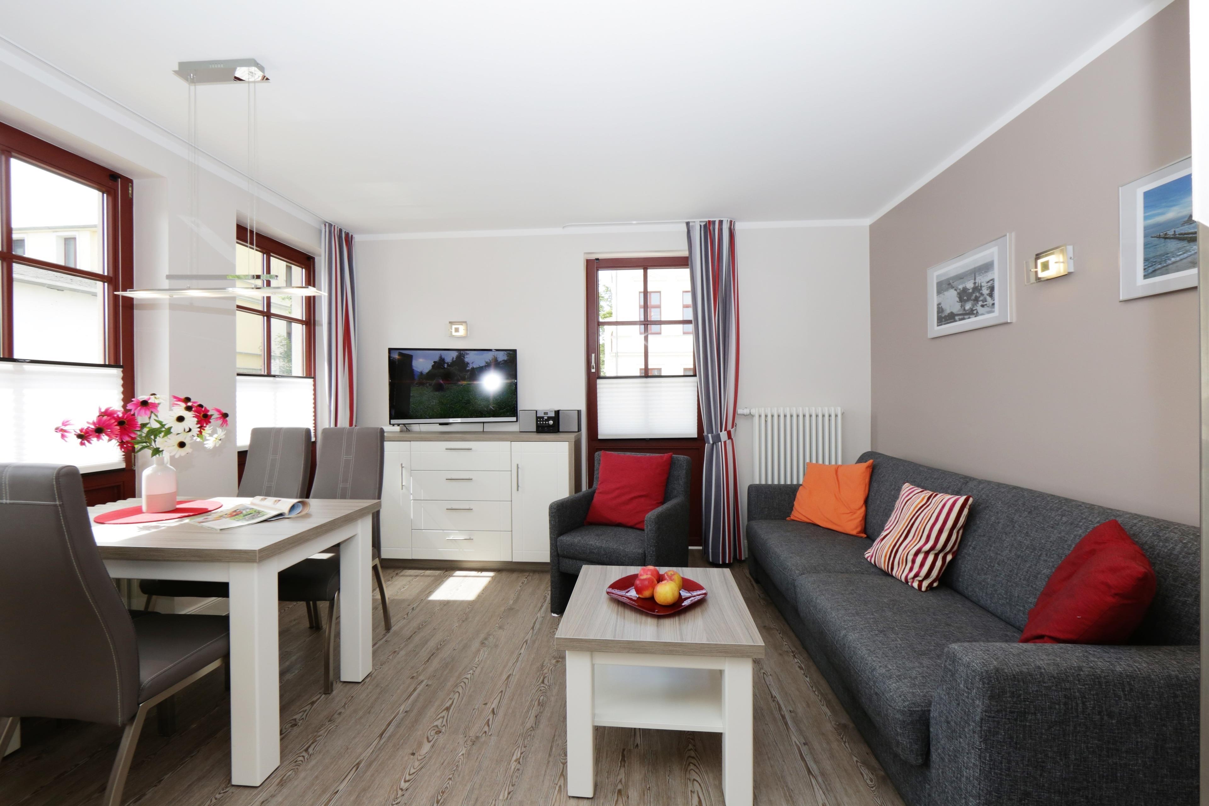 Dieses geschmackvolle und sehr hochwertig eingerichtete 45 qm große 2-Zimmer-Appartement liegt im 1. Obergeschoss und eignet sich für 2 bis 4 Personen. Der helle Wohnraum ist mit einer gemütlichen Sitzecke (mit Schlaffunktion 160 x 200), Flat TV sowie einem Essbereich für bis zu 4 Personen ausgestattet. Die ebenfalls offen im Wohnbereich integrierte Küchenzeile ist mit Geschirrspüler, Cerankochfeld, Mikrowelle, Kühlschrank etc. ausgestattet. Der vom Wohnraum begehbare Balkon in östlicher Ausrichtung lockt die Gäste schon zum Frühstück ins Freie. Das helle Schlafzimmer verfügt über ein Doppelbett mit getrennten Matratzen (90 x 200) und einen Kleiderschrank sowie einen zweiten TV. Im Bad stehen Ihnen eine Dusche und Waschtisch/ WC zur Verfügung sowie ausreichend Ablagemöglichkeiten.