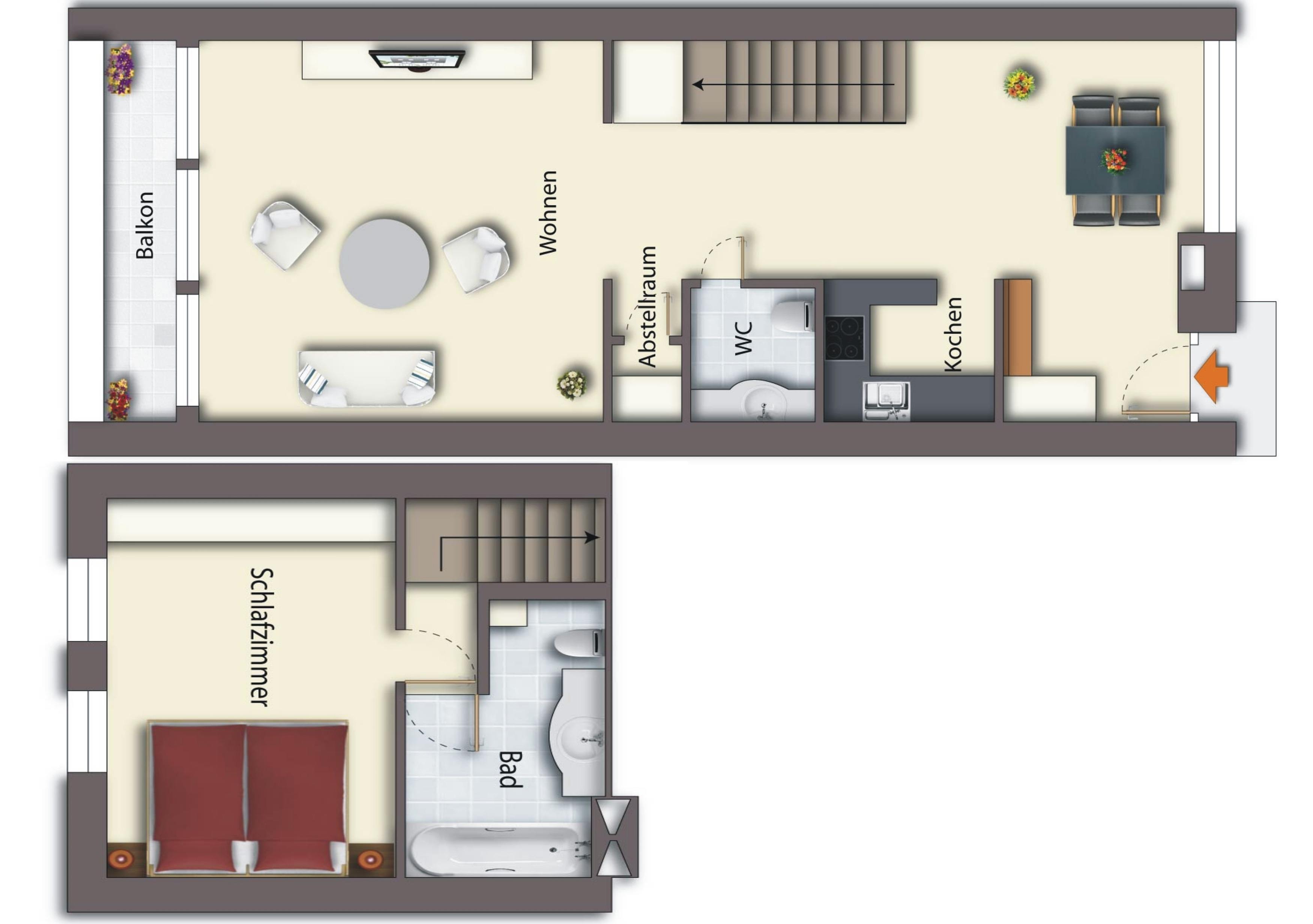Im unteren Bereich des Appartements befindet sich das Schlafzimmer, das mit einem komfortablen Doppelbett (1,80 x 2,00m) ausgestattet ist und Ihnen einen traumhaften Blick auf den Schloonsee bietet. Ein großer Kleiderschrank bietet ausreichend Stauraum für Ihre Kleidung. Das angrenzende Badezimmer lädt mit einer Badewanne, WC und Waschtisch zum Entspannen und Erfrischen ein.