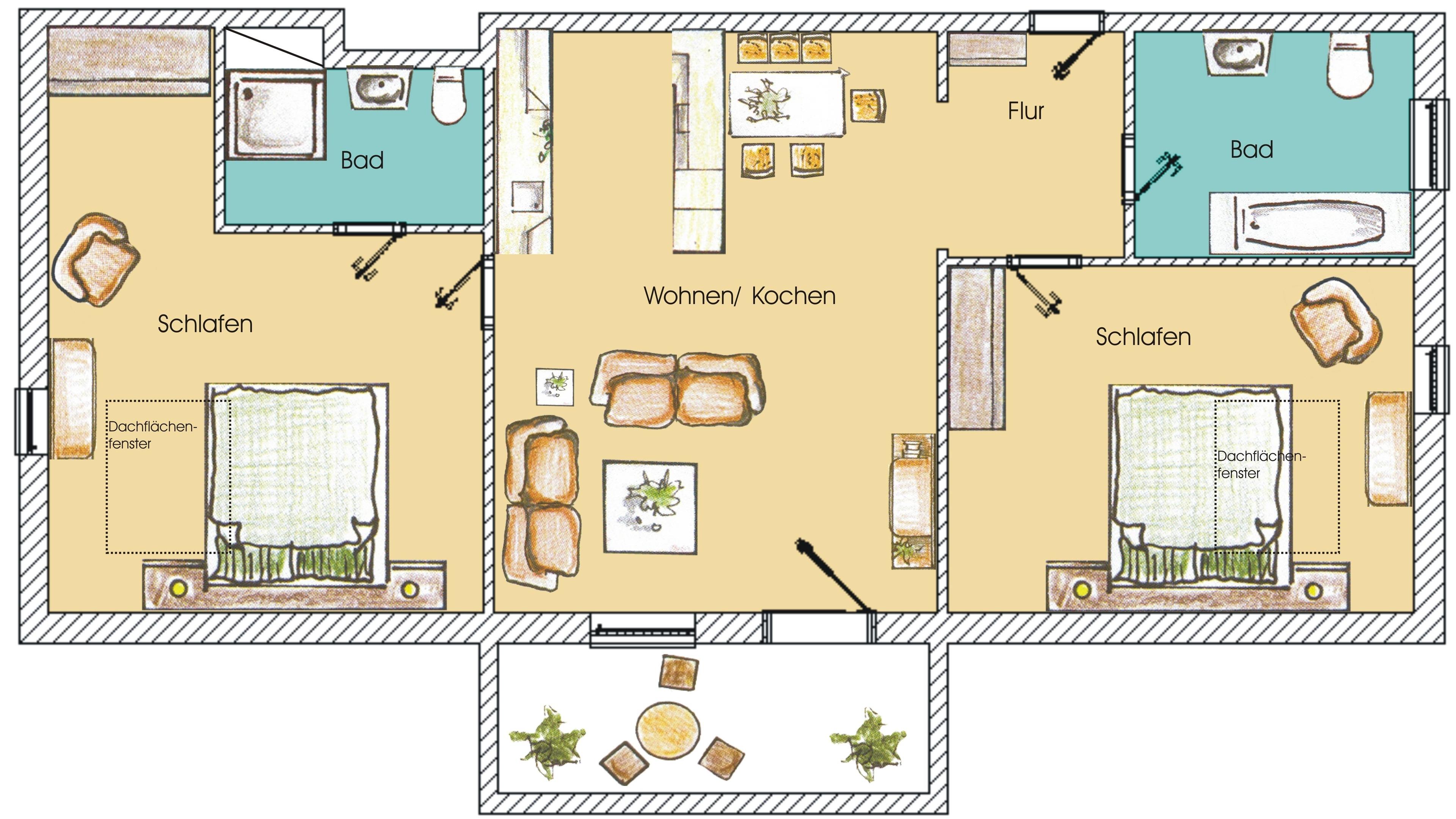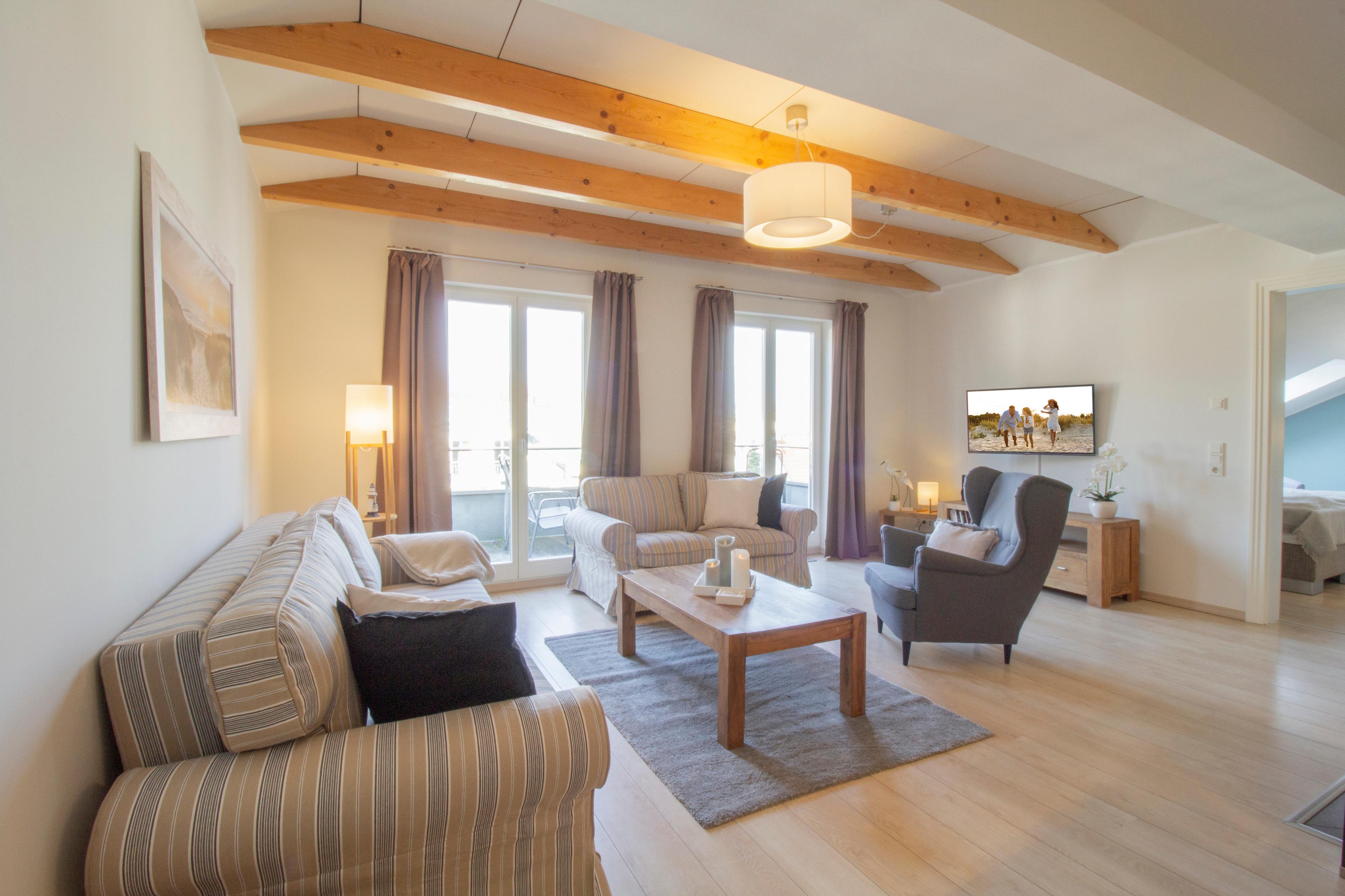 Dieses großzügige und sehr geschmackvoll eingerichtete 3-Zimmer Appartement ist 80 qm groß und befindet sich im Dachgeschoss. Der helle, freundliche Wohnraum ist im Fensterbereich mit einer gemütlichen Couchecke, Couchtisch und großem Flat TV ausgestattet. Die moderne große Einbauküche inkl. Ceranfeld, Backofen, Geschirrspüler etc. sowie der große Essplatz für bis zu 6 Personen befinden sich im hinteren Bereich des Wohnraums. Auf dem Westbalkon zur Lindenstraße können Sie mit einem Buch die Nachmittagssonne genießen. Ihnen stehen zwei Schlafzimmer mit jeweils einem Doppelbett (180 X 200) und ausreichend Schrankraum zur Verfügung. Eines der Schlafzimmer bietet den Gästen einen zusätzlichen TV. Es steht Ihnen ein Dusch- sowie ein Wannenbad mit Waschtisch/WC zur Verfügung. Ein Pkw-Stellplatz befindet sich auf dem Grundstück und ist dem Appartement zugeordnet. Eine Fahrradabstellmöglichkeit ist ebenso vorhanden.
