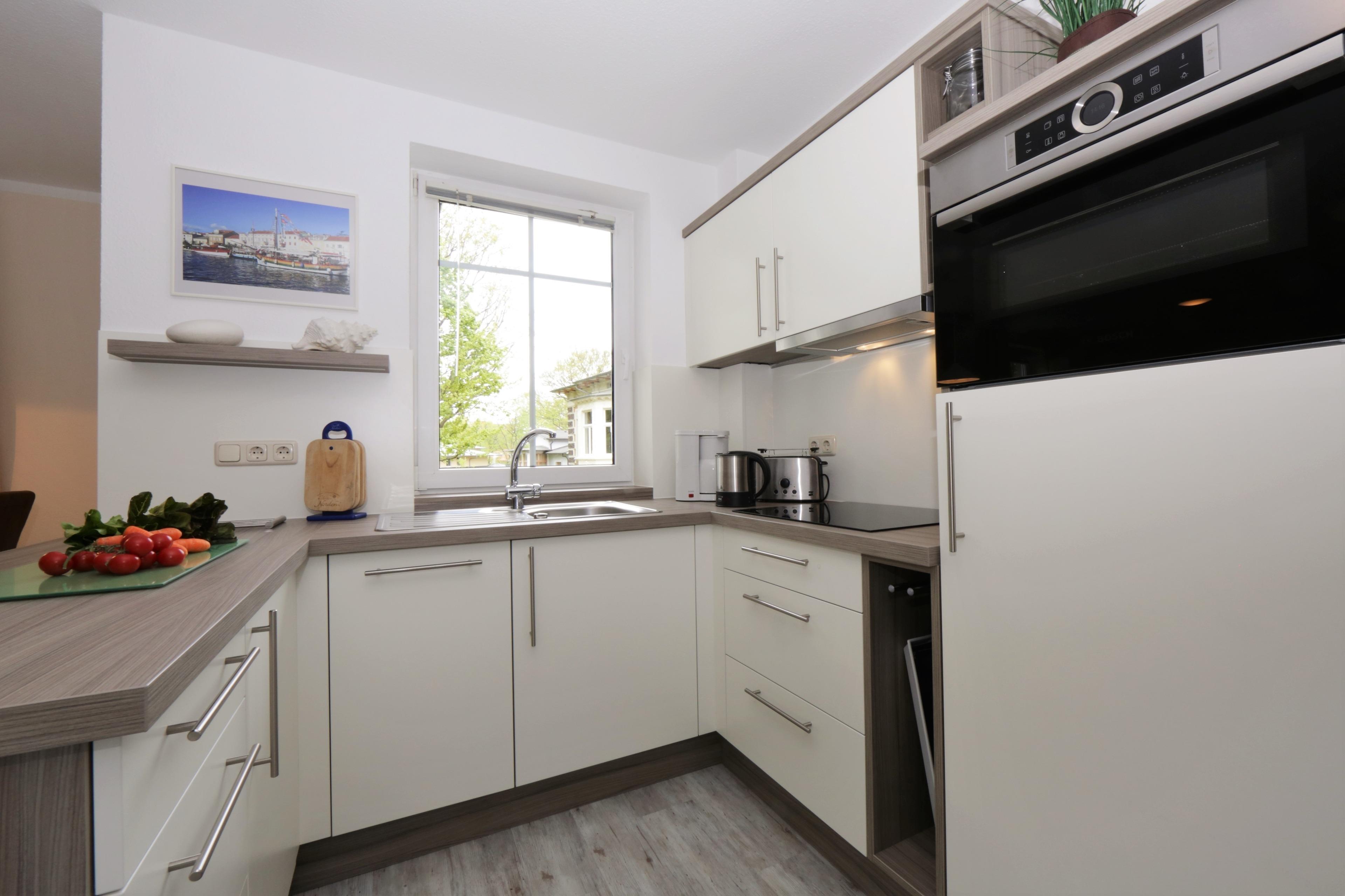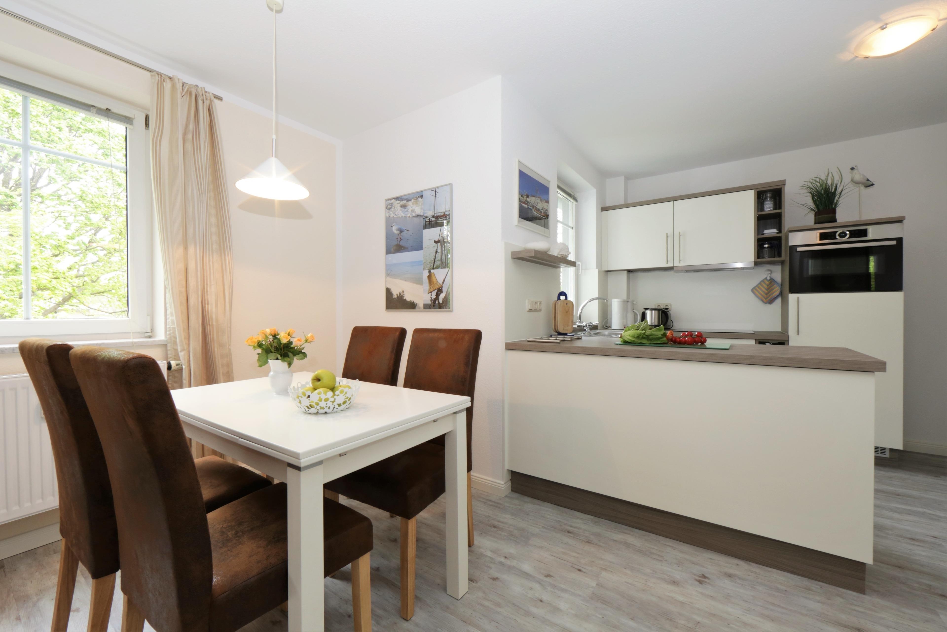 Dieses 45 qm große gemütliche Zwei-Zimmer-Appartement befindet sich im 2. Obergeschoss und bietet Ihnen einen schönen Blick in den Buchenpark von Heringsdorf. Im Wohnraum steht den Gästen ein Sofa und zwei Sessel sowie ein Essplatz für gemeinsame Mahlzeiten zur Verfügung. Ein Flat-TV ist selbstverständlich. Die im Wohnraum offen integrierte Einbauküche mit Fenster verfügt über ein Cerankochfeld, Geschirrspüler, Kühlschrank mit Gefrierfach sowie Backofen mit Mikrowellenfunktion. Das Schlafzimmer ist mit einem Doppelbett und ausreichend Schrankraum ausgestattet. Den geschützten Balkon zum Süden können Sie über das Wohn- als auch das Schlafzimmer betreten Das innenliegende Bad ist mit einer Dusche 80x110 und Waschtisch/WC ausgestattet. Ein Pkw-Stellplatz befindet sich auf dem Nachbargrundstück. Zum Be- und Entladen steht ein Platz vor dem Haus zur Verfügung.