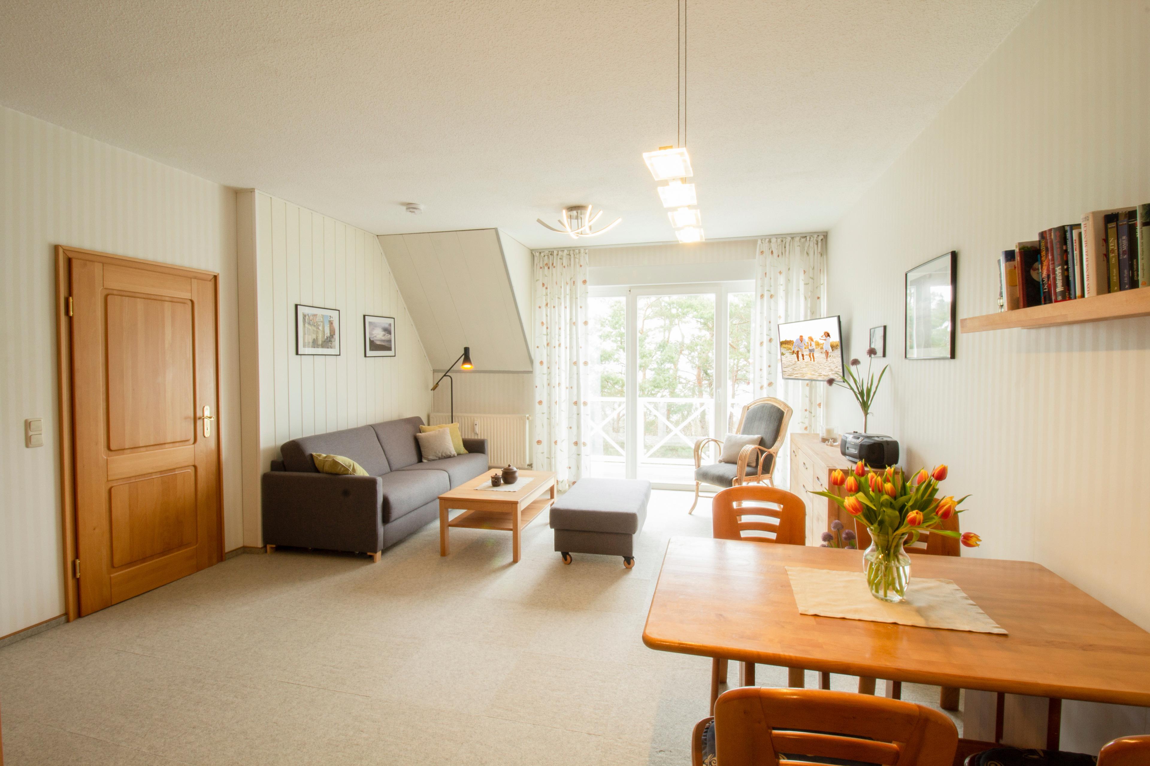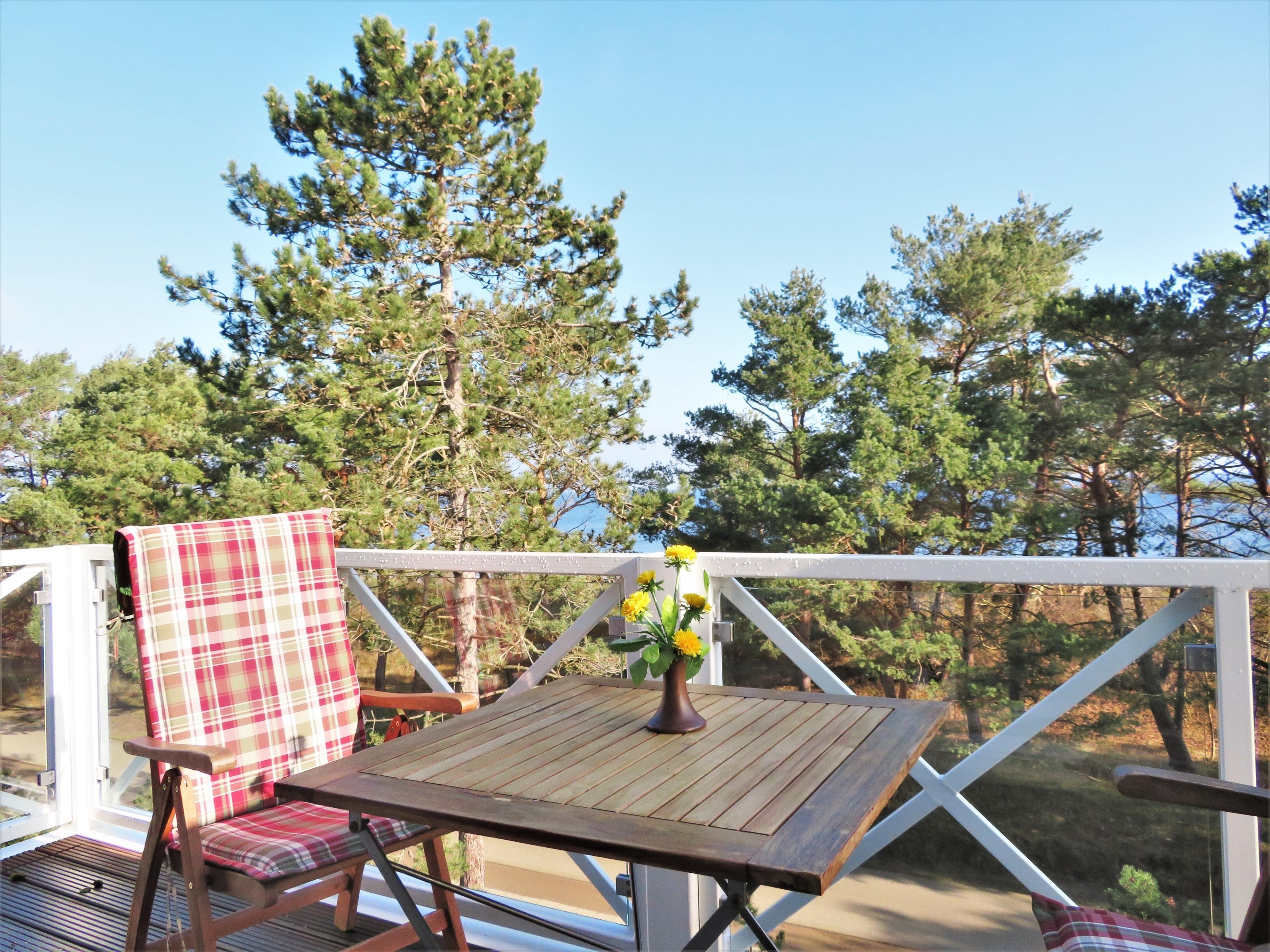 Diese mit viel Liebe eingerichtete 52 qm große Ferienwohnung für 2 Personen befindet sich im 3. Obergeschoss des Dünenhauses. Der großzügige Wohnraum mit breiter Fensterfront zum Meer ist mit einer Couch, zwei bequemen Korbsesseln und Fernseher sowie einem Essplatz für 4 Personen möbliert. Die Vollküche mit Geschirrspüler, Ceranfeld, Hochbackofen, Mikrowelle etc. ist ebenfalls im hinteren Wohnbereich integriert. Den großen zur Ostsee ausgerichteten Balkon können Sie vom Wohnraum begehen. Von hier haben Sie den Ostseeblick und das Meeresrauschen aus erster Hand. Das ebenfalls zum Meer ausgerichtete große Schlafzimmer ist mit einem Doppelbett mit getrennten Matratzen (90 x 200) und genügend Schrankraum ausgestattet. Das moderne Bad ist mit einer Dusche und Waschbecken/WC sowie einer Waschmaschine ausgestattet. Im Keller finden Sie einen Fahrradraum und Gemeinschaftswaschmaschine und -trockner. Der Pkw-Stellplatz befindet sich auf dem abgeschlossenen Grundstück und ist der Wohnung zugeordnet.