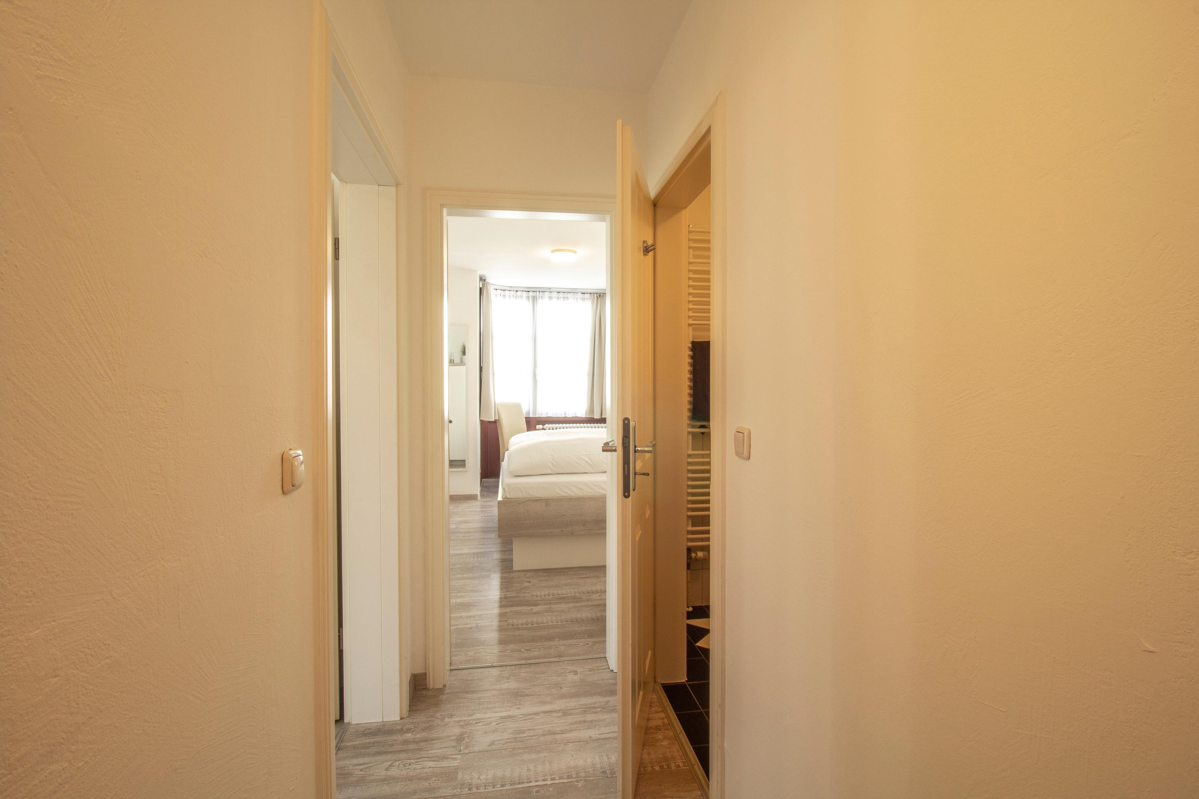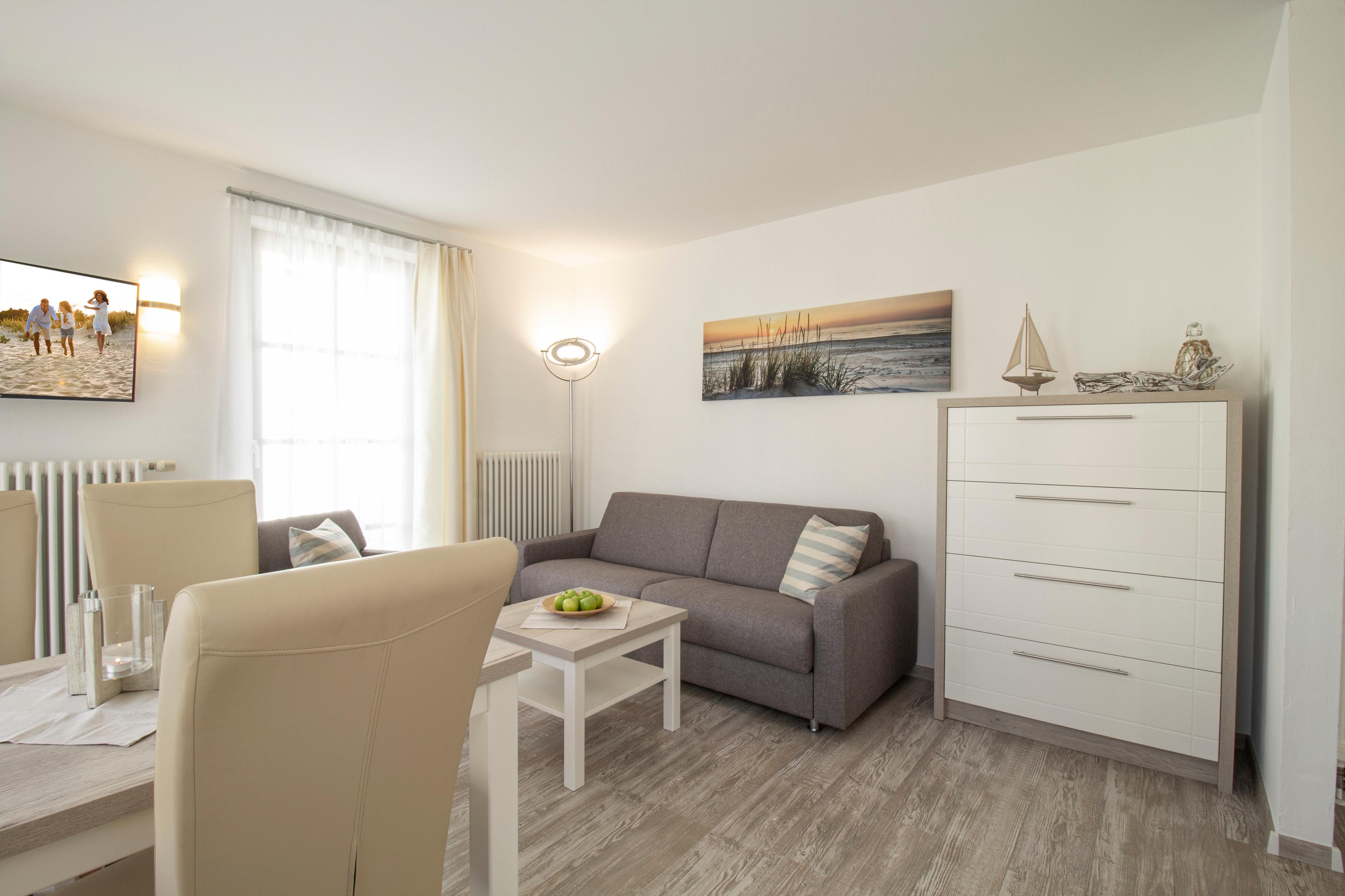 Dieses modern und komfortabel eingerichtete 45 qm große 2-Zimmer-Appartement liegt im Erdgeschoss und eignet sich für 2-4 Personen. Der helle Wohnraum ist mit einer gemütlichen Sitzecke mit Schlaffunktion, Flat TV, sowie einem Essbereich für bis zu 4 Personen ausgestattet. Die ebenfalls offen im Wohnbereich integrierte Küchenzeile ist mit Geschirrspüler, Cerankochfeld mit Backofen, Kühlschrank etc. ausgestattet. Eine kleine Terrasse mit westlicher Ausrichtung steht den Gästen zur Nutzung zur Verfügung. Das helle Schlafzimmer verfügt über ein Doppelbett mit getrennten Matratzen und einen Kleiderschrank. Das Bad ist mit Dusche und Waschtisch/WC ausgestattet.