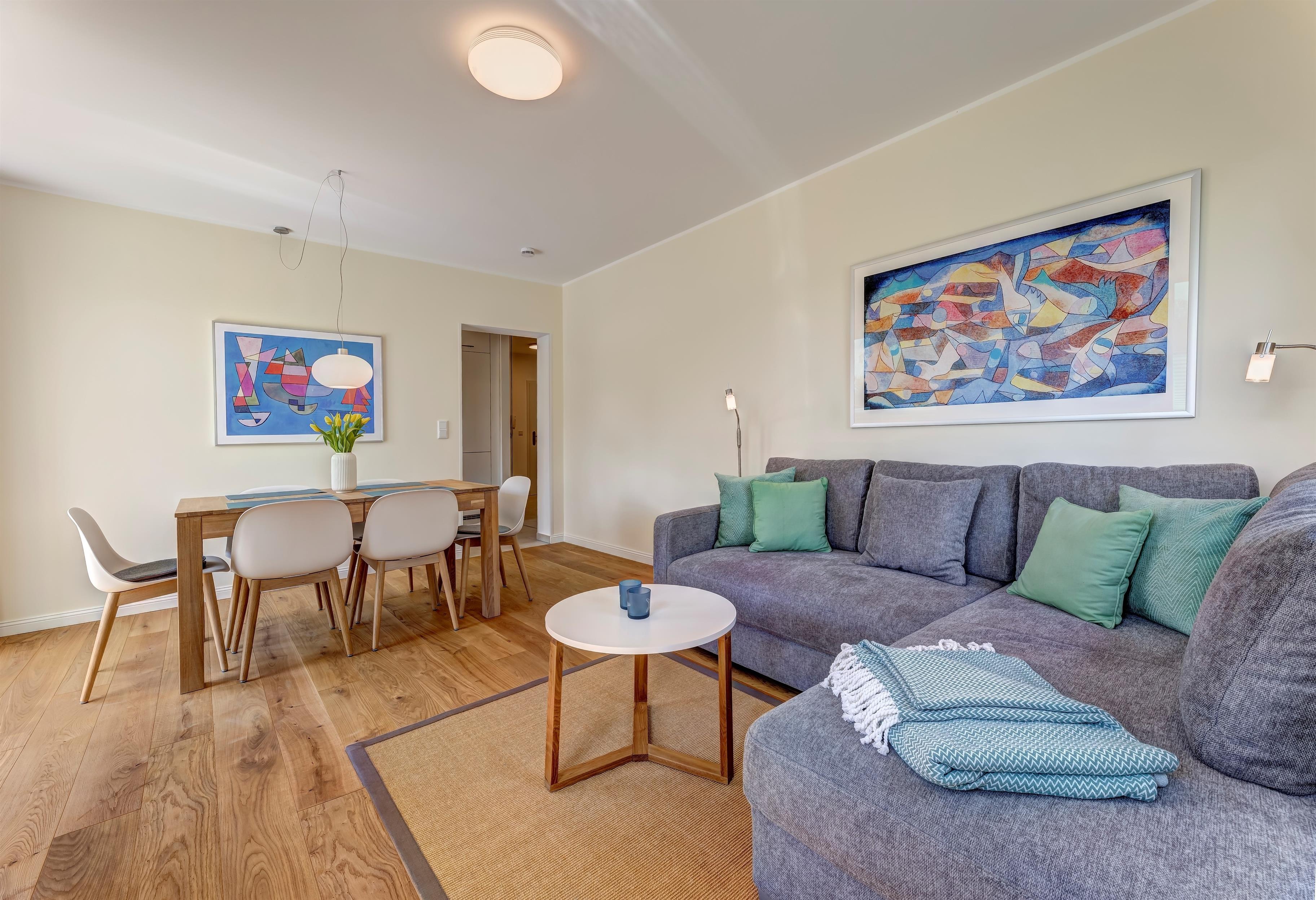 Im großzügigen Wohnbereich erwartet Sie eine gemütliche Polsterlandschaft, die zum Entspannen und Wohlfühlen einlädt. Hier können Sie es sich auf den bequemen Polstern gemütlich machen, während Sie auf dem großen Flat-TV Ihre Lieblingsserien oder -filme genießen. Ein Couchtisch ergänzt die Sitzgruppe und schafft eine harmonische Atmosphäre für entspannte Abende. Ein weiterer Blickfang ist der Essbereich, der mit einem stilvollen Tisch und bequemen Stühlen ausgestattet ist und sich perfekt für gemeinsame Mahlzeiten oder gesellige Abende eignet.