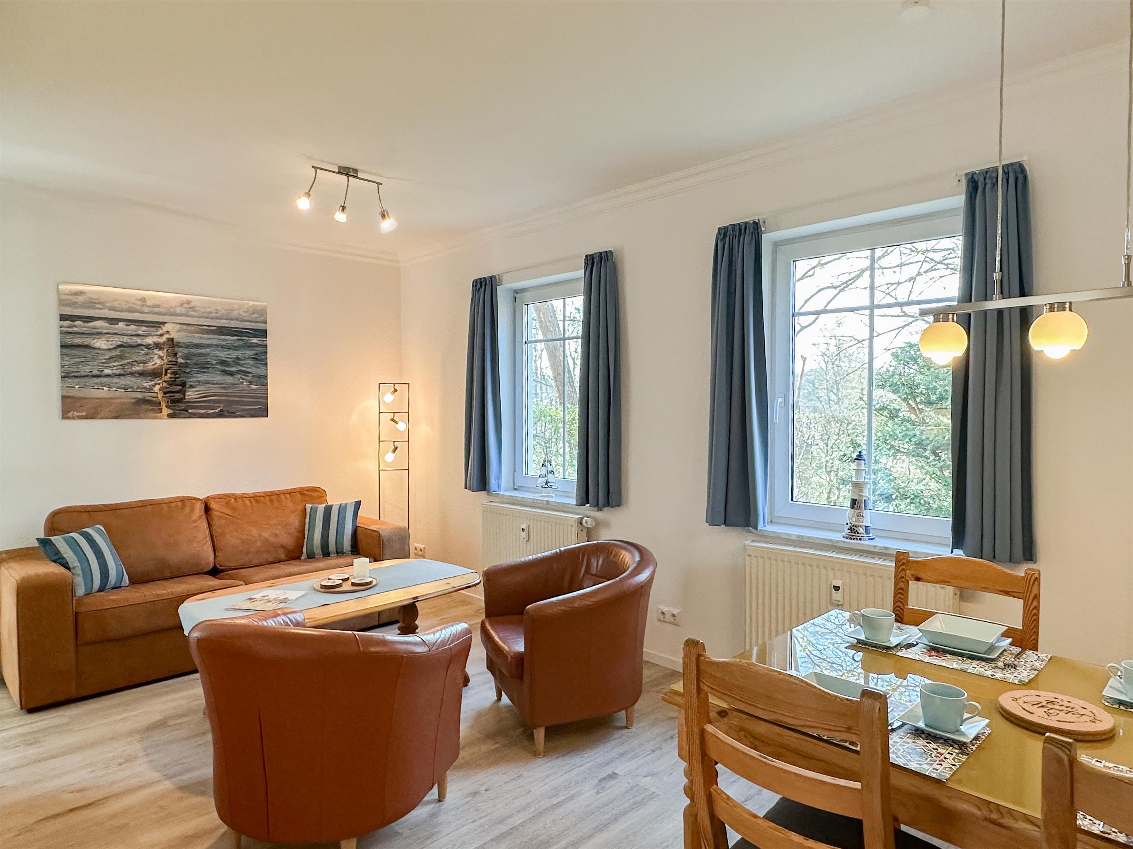 Dieses 45 qm große gemütliche 2-Zimmer-Appartement für 2-3 Personen befindet sich im Erdgeschoss und bietet Ihnen einen schönen Blick in den Buchenpark von Heringsdorf. Im Wohnraum steht den Gästen ein Sofa (mit Schlaffunktion Liegefläche 140 x 200) und zwei Sessel sowie ein Essplatz für gemeinsame Mahlzeiten zur Verfügung. TV und Radio/CD sind selbstverständlich. Die im Wohnraum offen integrierte Einbauküche mit Fenster verfügt über ein Cerankochfeld, Geschirrspüler, Kühlschrank mit Gefrierfach, Backofen etc. Das Schlafzimmer ist mit einem Doppelbett mit getrennten Matratzen (90 x 200) und ausreichend Schrankraum ausgestattet. Für einen erholsamen Schlaf lassen sich die Fenster im Schlaf- und Wohnbereich verdunkeln. Den geschützten Balkon zum Süd-Westen können Sie über das Wohn- als auch das Schlafzimmer betreten. Hier kann der Blick durch den alten Baumbestand bis über den Teich schweifen. Genießen Sie die ruhige Atmosphäre auf der Rückseite der Delbrückstraße. Das innenliegende Bad ist mit einer Dusche und Waschbecken/WC ausgestattet. Ein Pkw-Stellplatz befindet sich auf dem Nachbargrundstück. Zum Be- und Entladen steht ein Platz vor dem Haus zur Verfügung. Fahrräder können im Fahrradkeller abgestellt oder im überdachten Fahrradständer angeschlossen werden.