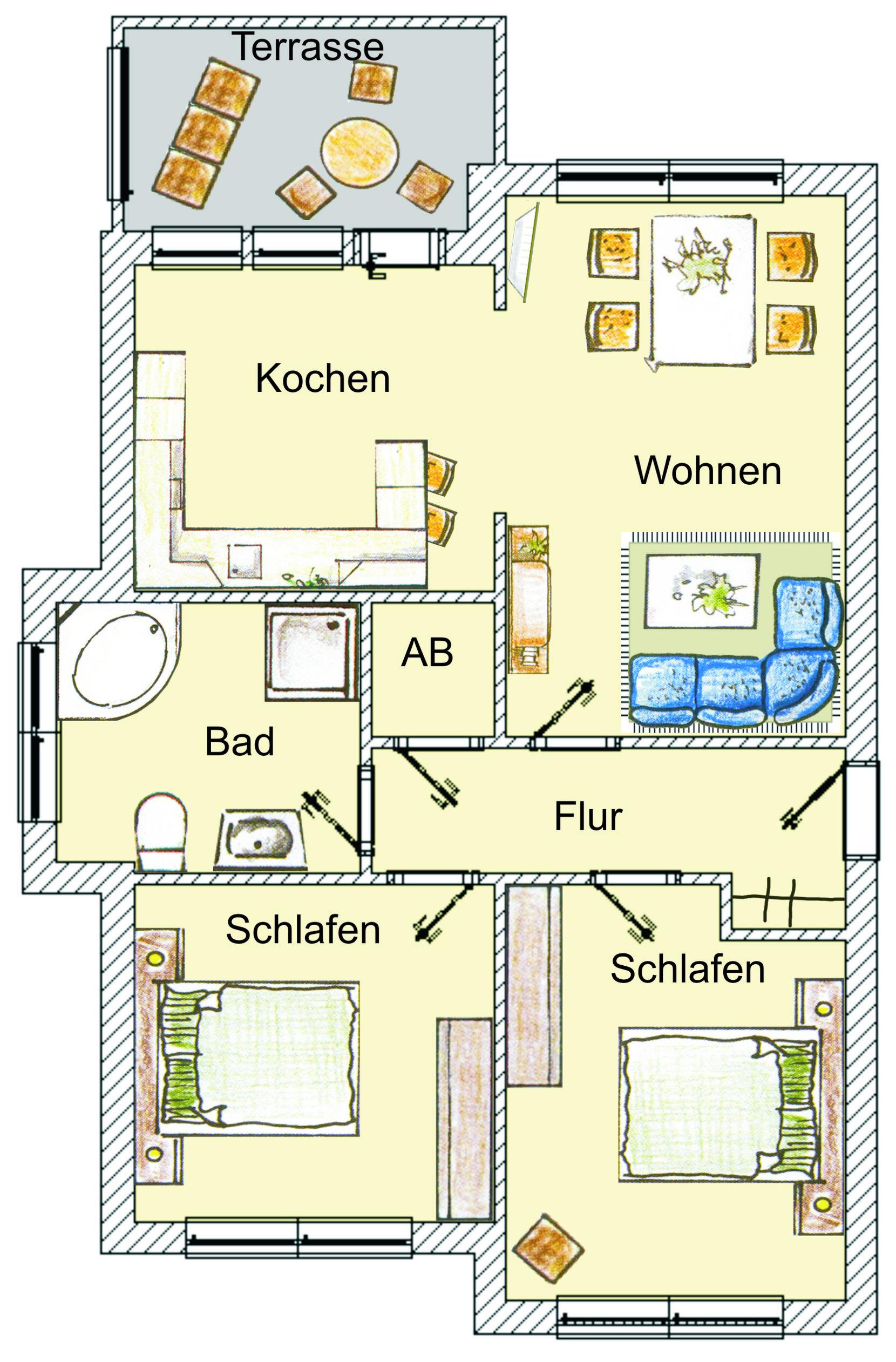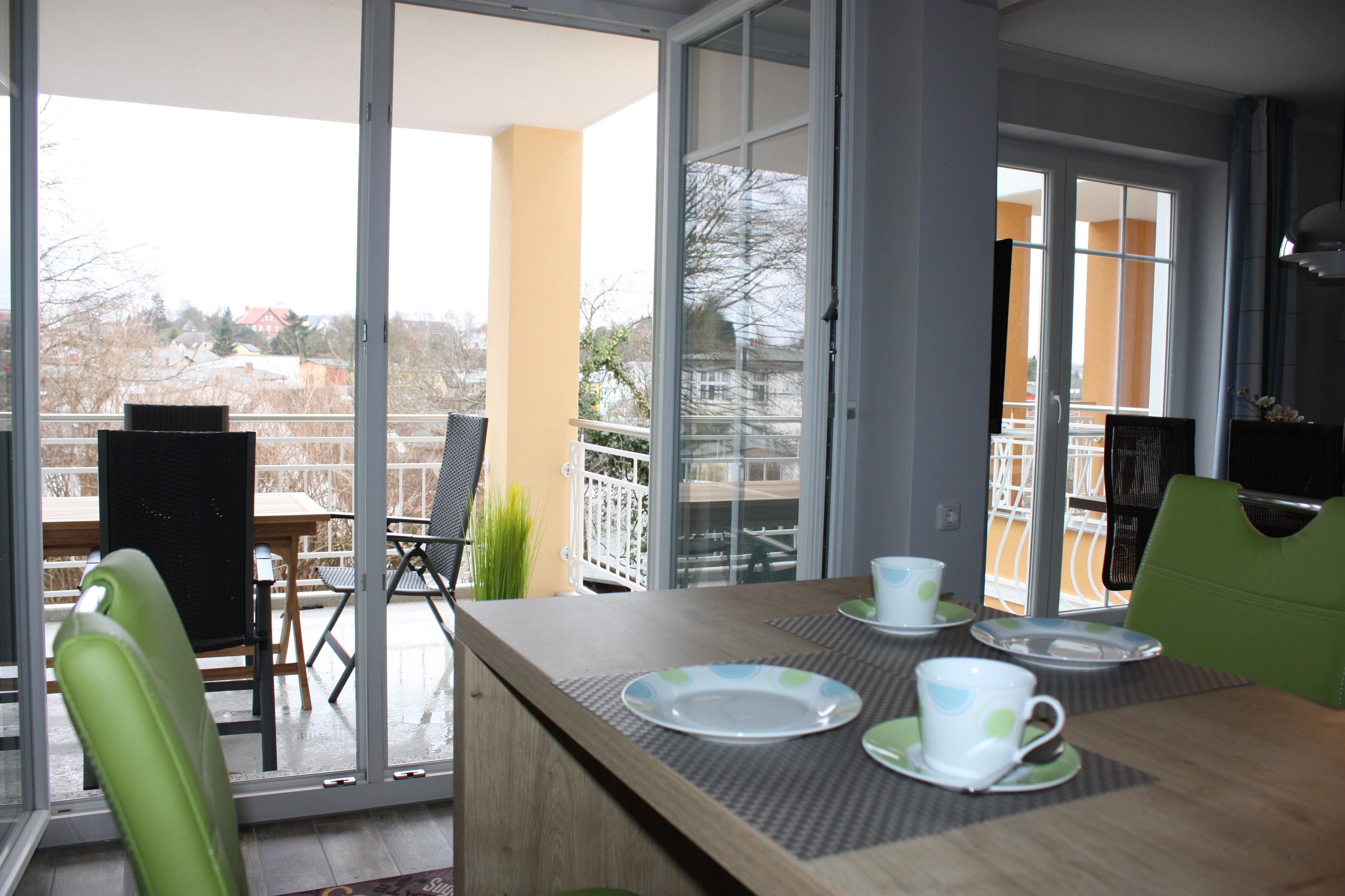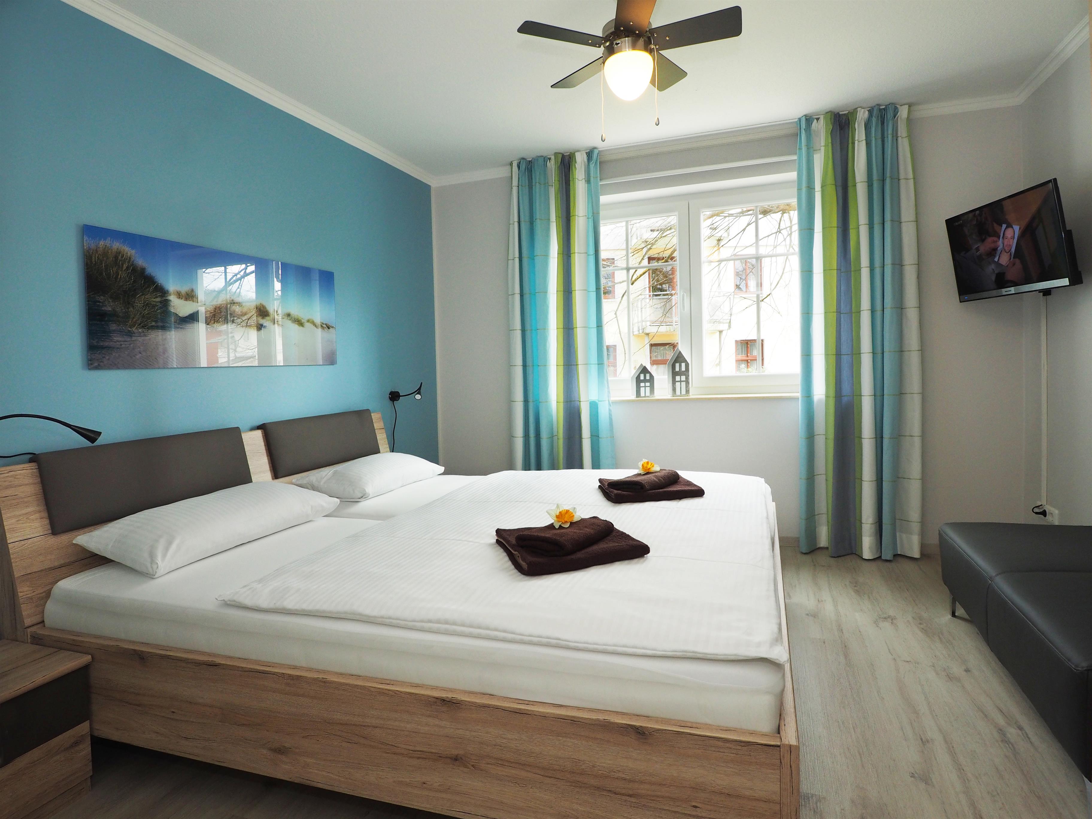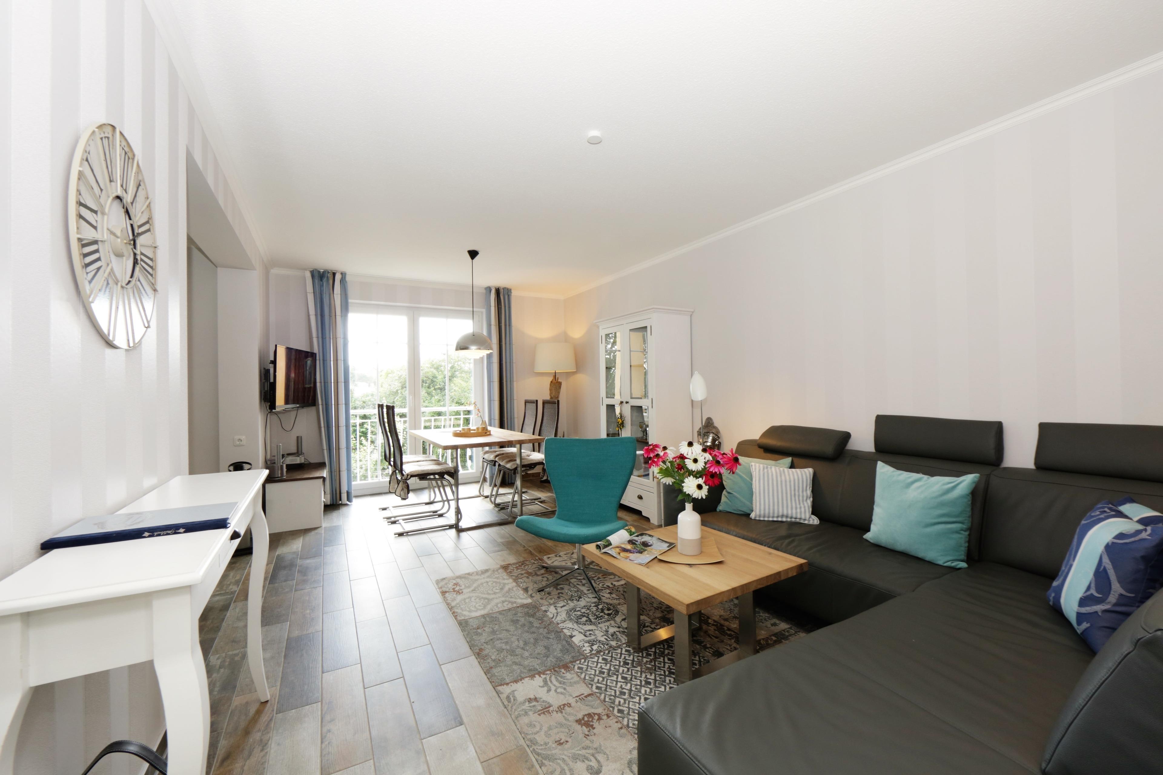 Dieses modern und geschmackvoll eingerichtete 80 qm große Drei-Zimmer-Appartement befindet sich im 1. Obergeschoss. Das sonnige Wohnzimmer ist mit einem Esstisch, der 4 Personen Platz bietet und einer gemütlichen Couchecke (mit Schlaffunktion f. 1 Pers., Liegefläche 0,60x1,80m) eingerichtet. Flat-TV sowie Radio sind selbstverständlich. Die halboffene Vollküche schließt sich an den Wohnraum an und ist mit Backofen/ Ceranfeld, Kühlschrank, Geschirrspüler, Mikrowelle p.p. ausgestattet. Der große zum Süden ausgerichtete möblierte Balkon ist von der Küche begehbar und verspricht viele Sonnenstunden. Die beiden Schlafzimmer verfügen jeweils über ein Doppelbett mit getrennten Matratzen 80 bzw. 90 x 200 und ausreichend Schrankraum. Im größeren Schlafzimmer steht ein zusätzlicher Fernseher zur Verfügung. Das großzügige Badezimmer ist mit Badewanne, Dusche, Waschbecken und WC ausgestattet. Auf dem Hof stehen den Gästen ein gekennzeichneter Pkw-Stellplatz zur Verfügung sowie eine Abstellmöglichkeit für die Fahrräder.