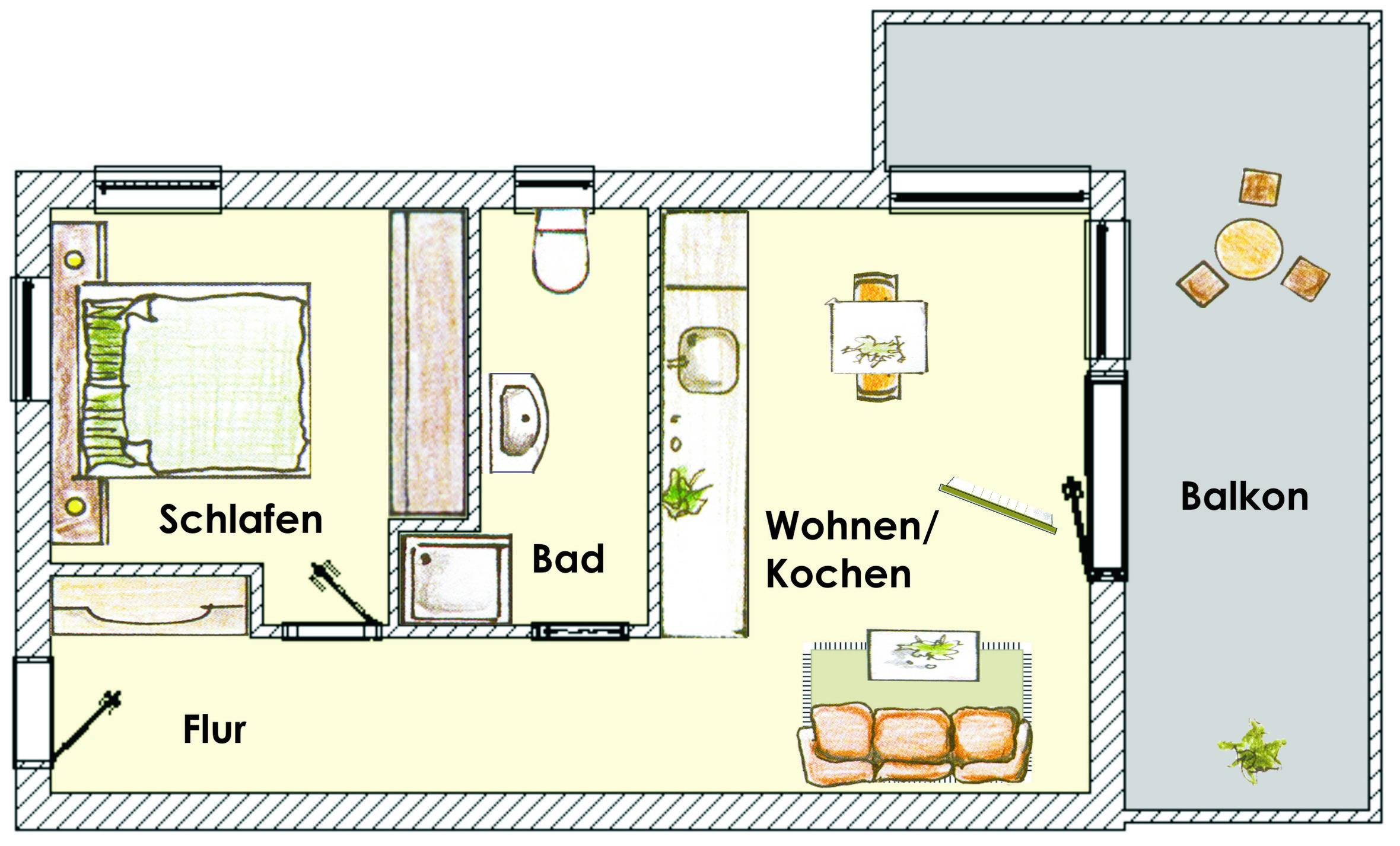 Dieses modern ausgestattete 2-Zimmer-Appartement befindet sich im Dachgeschoß und ist für 2 Personen ausgelegt. Der offen gestaltete, lichtdurchflutete Wohnbereich verfügt über eine gemütliche Sitzecke, einen Essbereich sowie eine komfortable Einbauküche mit Geschirrspüler, Cerankochfeld und Backofen. Eine große Schiebetür öffnet den Zugang zur Dachterasse. Das helle Schlafzimmer besitzt einen Massivholz-Doppelbett aus Kernbuche, dass nach Grundsätzen einer modernen Wohnbiologie entwickelt wurde. Ein großzügiger Einbauschrank bietet hinter seinen Schiebetüren ausreichend Stauraum sowie eine Kofferablage. Im Bad finden Sie eine bodengleiche Echtglas-Dusche, WC und Waschtisch. In der kalten Jahreszeit sorgt eine Fußbodenheizung im gesamten Appartment für eine angenehmes Raumklima. Der überdachte inklusive PKW-Stellplatz auf dem Grundstück ist dem Appartement zugeordnet, ebenfalls ein abschließbarer Abstellraum für Ihre Fahrräder.
