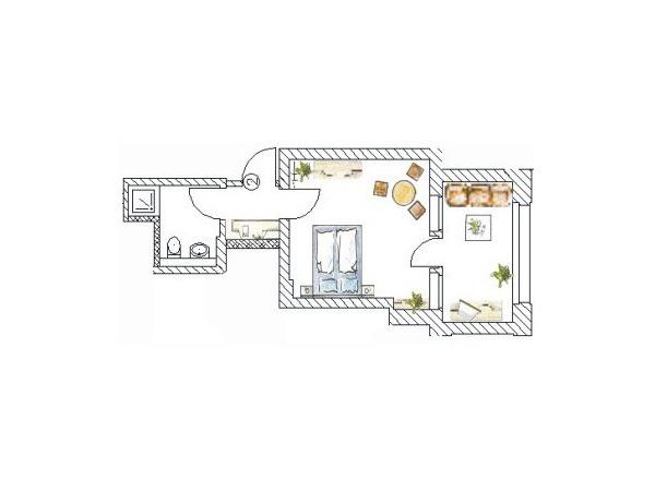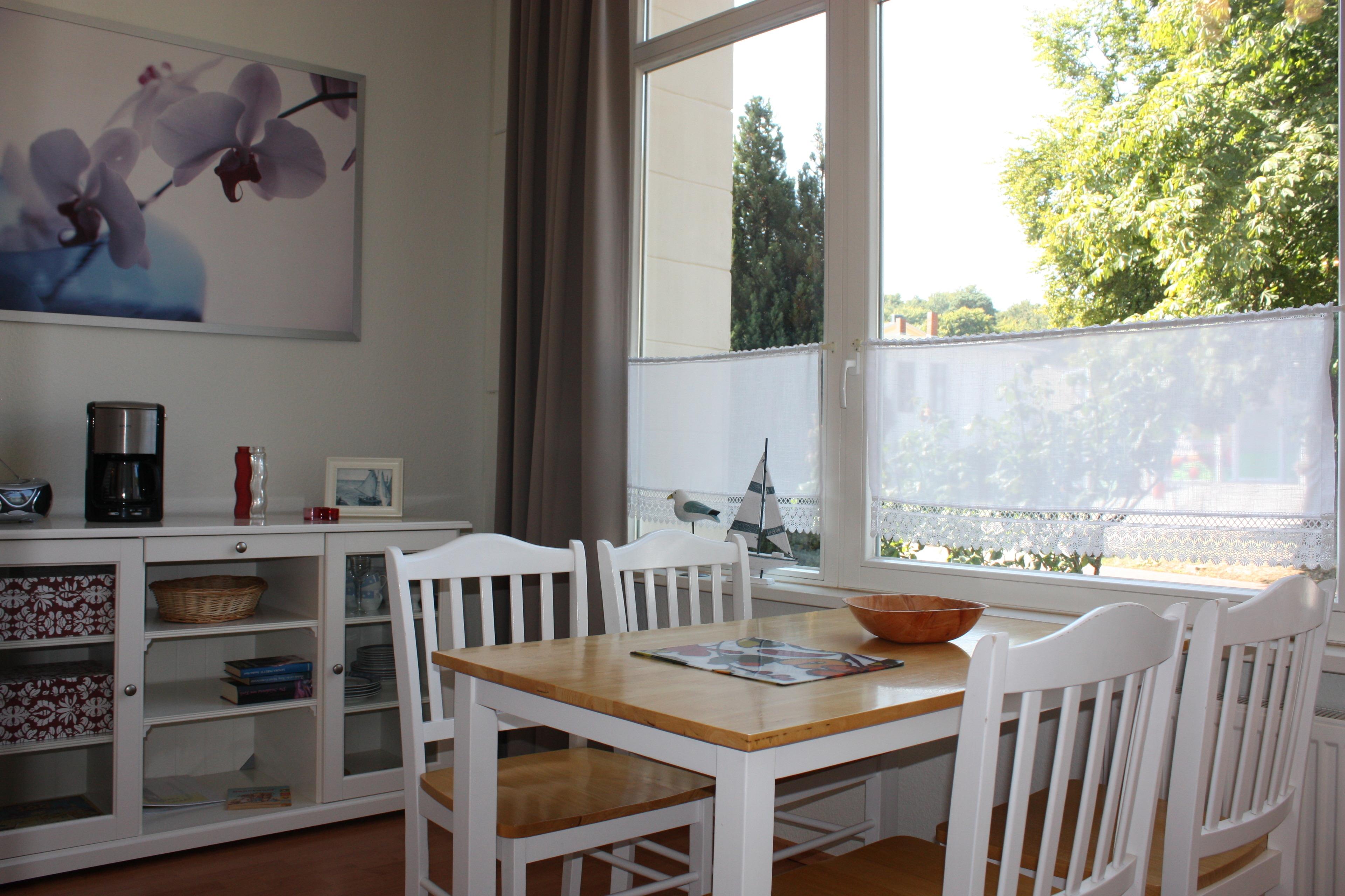 Dieses 40 qm große, helle 1-Zimmer-Appartement mit großer Loggia befindet sich im Erdgeschoss. Der großzügige Wohnraum beherbergt ein Boxspringbett mit getrennten Matratzen (90x200) und einen Kleiderschrank sowie eine kleine Sitzecke zum Entspannen und Fernsehen. In der geschlossenen Loggia (Fenster lassen sich öffnen), die zum Süden ausgerichtet ist, können an dem großen Esstisch die Mahlzeiten eingenommen werden. Die Pantryküche mit zwei Kochplatten, Kühlschrank, Mikrowelle und Geschirrspüler befindet sich separat im Flurbereich. Das Bad ist mit Dusche, Waschbecken und WC ausgestattet.