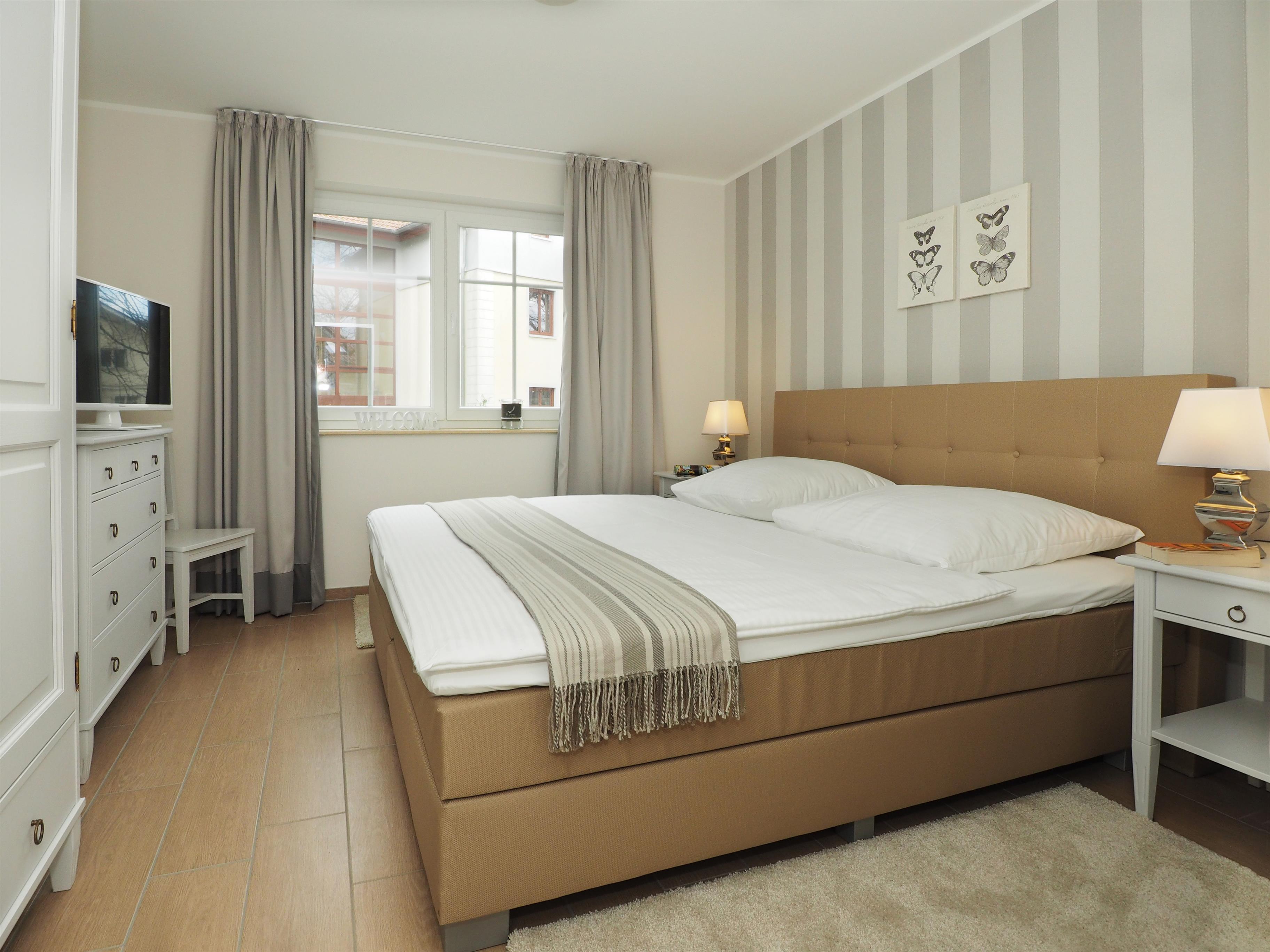 Dieses mit sehr viel Liebe und Geschmack eingerichtete 81 qm große Drei-Zimmer-Appartement befindet sich im 1. Obergeschoss. Das sonnige Wohnzimmer ist mit einer gemütlichen Couch mit Sessel und einer kuscheligen Leseecke eingerichtet. Flat-TV mit Blu-ray-Player sowie Radio/CD und i Pod - Dockingstation stehen den Gästen zur Verfügung. Die halboffene Wohnküche schließt sich an den Wohnraum an. Sie bietet 6 Personen bequem Platz für gemeinsame Mahlzeiten. Die Vollküche ist mit Backofen/ Ceranfeld, Kühlschrank, Geschirrspüler, Mikrowelle p.p. ausgestattet. Der große zum Südwesten ausgerichtete möblierte Balkon ist von der Küche begehbar und verspricht viele Sonnenstunden. Die beiden Schlafzimmer verfügen jeweils über ein Doppelbett und ausreichend Schrankraum sowie einen zusätzlichen Flat-TV. Das Badezimmer ist mit einem sehr hochwertigen großen Waschtisch, einer Dusche und WC ausgestattet. Außerdem erwartet die Gäste im Badezimmer eine eigene Sauna. Auf dem Hof stehen den Gästen ein gekennzeichneter Pkw-Stellplatz zur Verfügung sowie eine Abstellmöglichkeit für die Fahrräder.