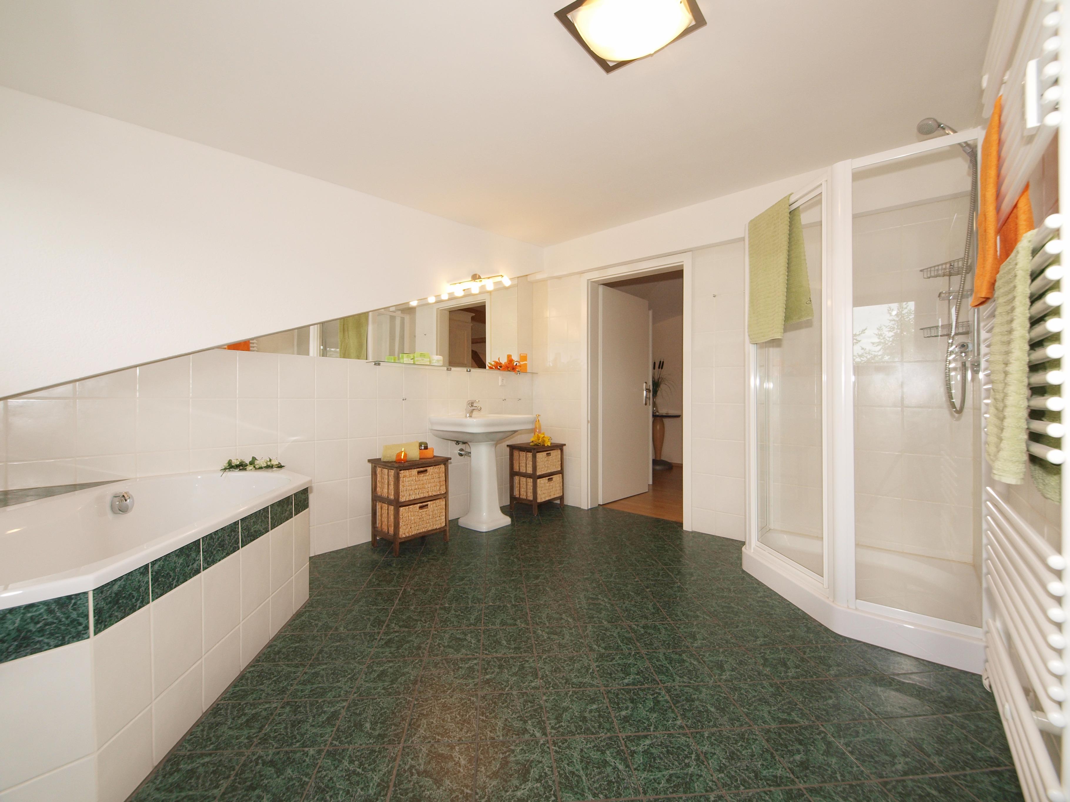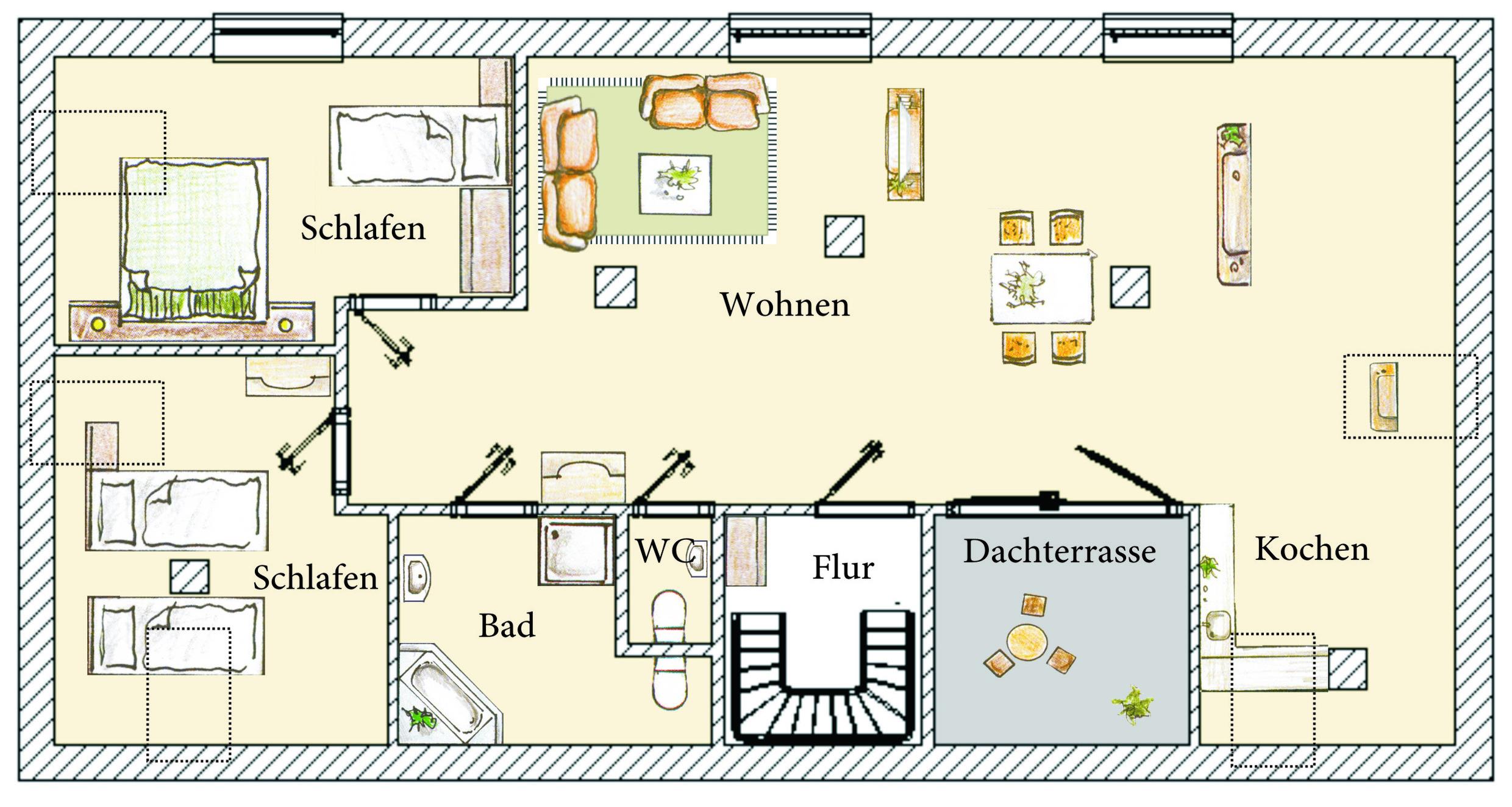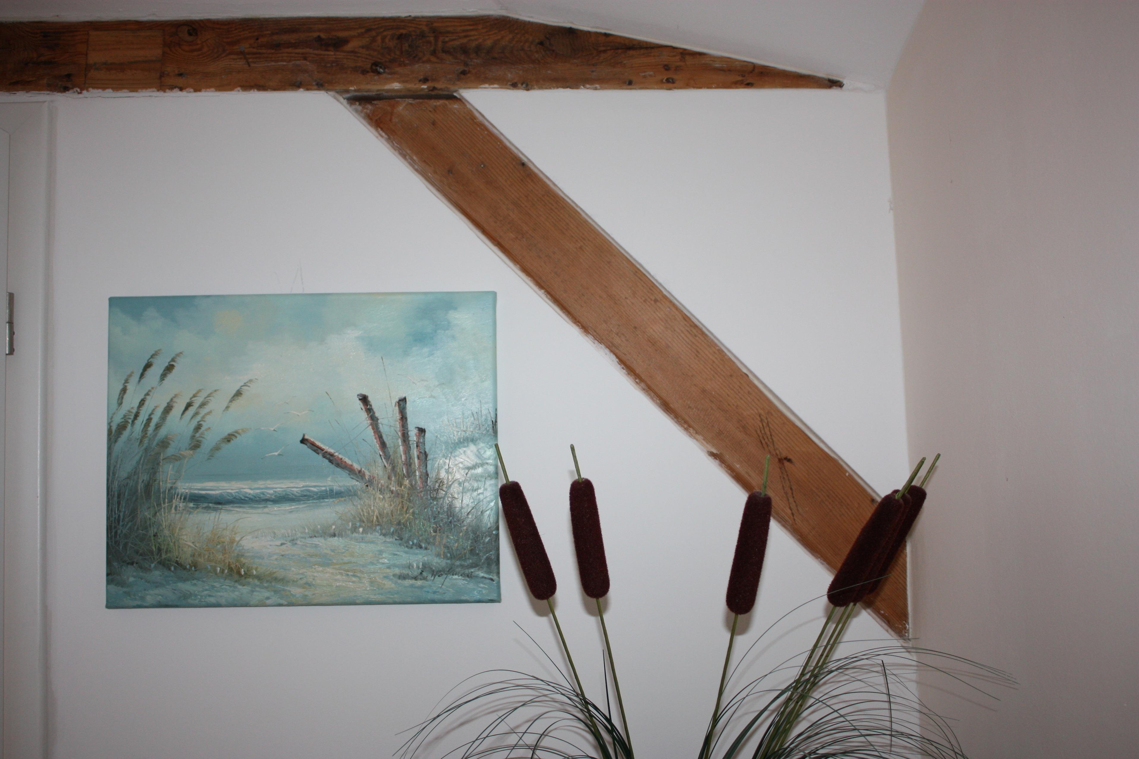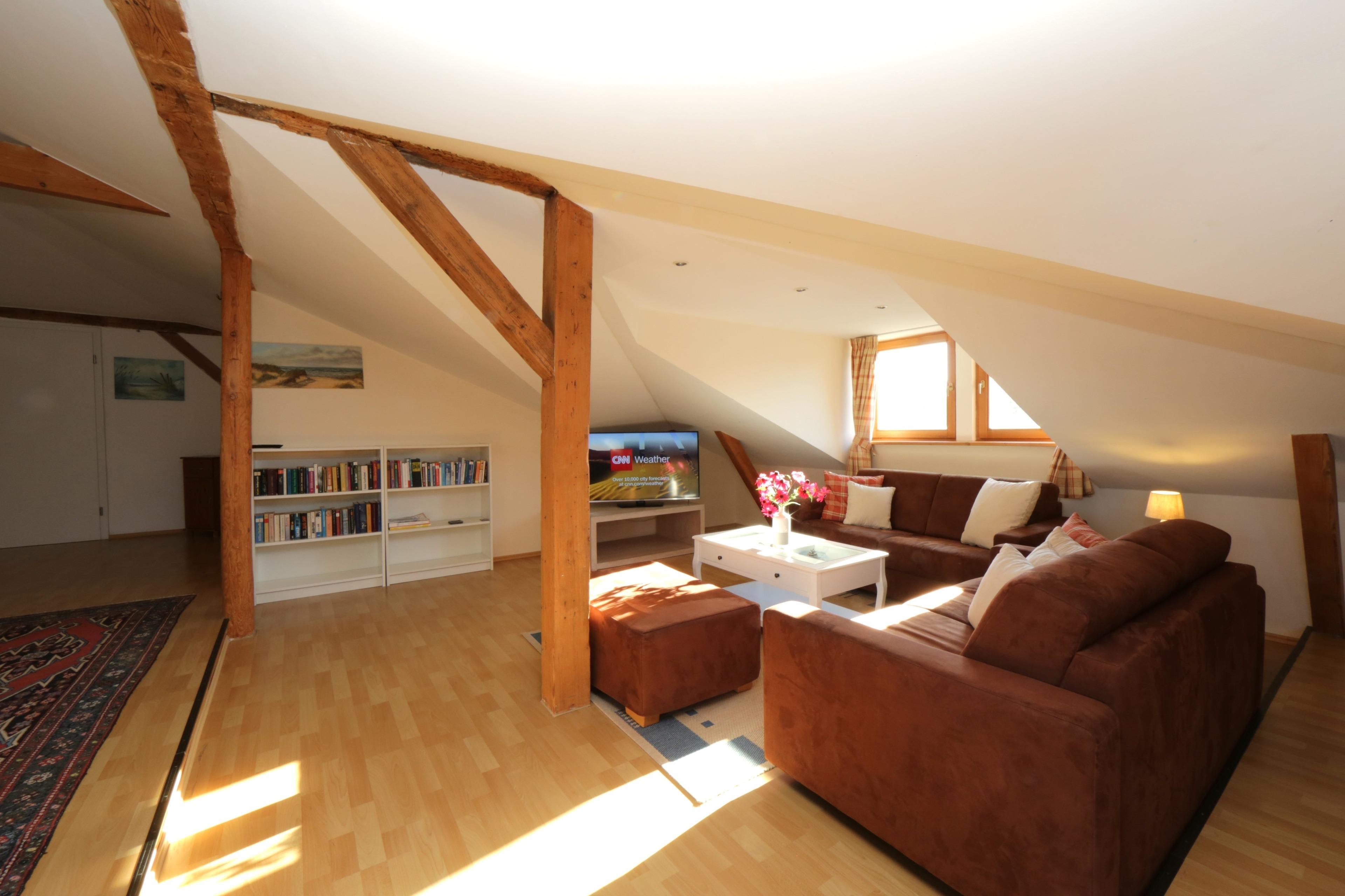 Diese interessante Dachgeschoß-Wohnung mit unterschiedlichen Wohnebenen und Dachschrägen (Achtung eingeschränkte Deckenhöhe) bietet Ihnen einen großzügigen und gemütlichen Wohnraum mit einer großen Couchecke. Ein Flat-TV ist selbstverständlich. Die zum Wohnbereich offene Küche ist mit Cerankochfeld, Backofen, Geschirrspüler pp. ausgestattet. Ein Esstisch, der bis zu 5 Personen Platz bietet, lädt zu gemeinsamen Mahlzeiten ein. Die vom Wohnraum begehbare Dachterrasse in nord-westlicher Richtung steht den Gästen zur Nutzung zur Verfügung. Das größere Schlafzimmer ist mit einem Doppelbett (ein großer Topper) sowie einem Einzelbett und ausreichend Schrankraum ausgestattet, das kleinere Schlafzimmer verfügt über zwei Einzelbetten. Im großzügigen Bad finden Sie sowohl Badewanne als auch Dusche, Waschtisch und WC. Darüber hinaus verfügt die Wohnung über ein Gäste-WC. Ein Pkw-Stellplatz (Carport, Einfahrtshöhe 2,20m) befindet sich auf dem Grundstück und ist der Wohnung zugeordnet.