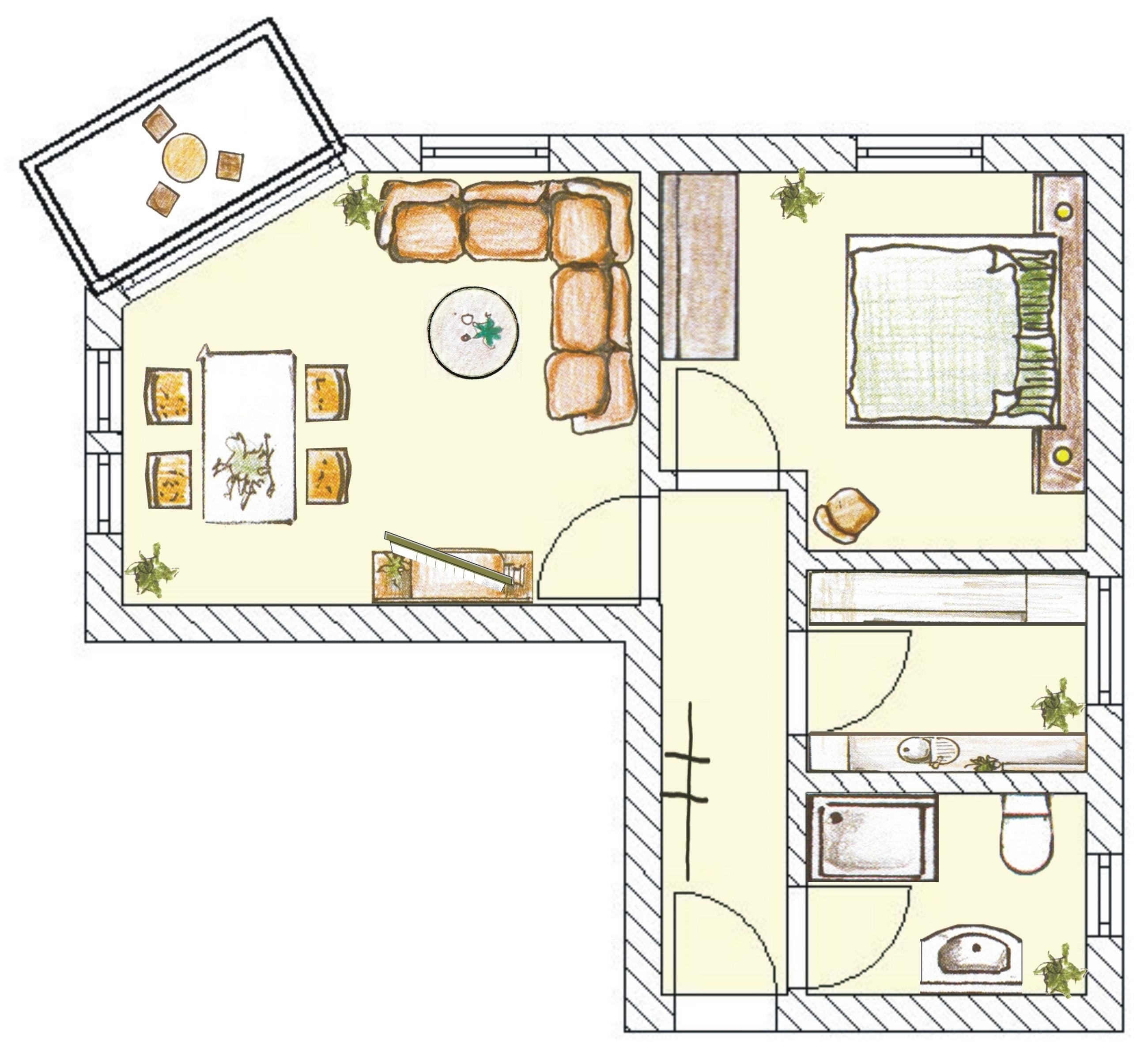 Dieses 64 qm große, gemütlich eingerichtete Zwei-Zimmer-Appartement für 2 bis maximal 4 Personen befindet sich im 1. Obergeschoss. Der großzügige helle Wohnraum ist mit einem Essplatz für 4 Personen sowie einer Couch (mit Schlaffunktion 136 x 195), Couchtisch und Flat TV eingerichtet. Der zur Südseite gehende Balkon ist vom Wohnzimmer zu begehen. Die separate gut ausgestattete Küche verfügt über einen Backofen mit Ceran-Kochfeld, Geschirrspüler, Kühlschrank mit separatem Gefrierfach, Kaffeemaschine etc. Das Schlafzimmer ist mit einem Doppelbett mit getrennten Matratzen (90 x 200) und ausreichend Schrankraum eingerichtet. Das Bad mit Fenster ist mit einer Dusche sowie Waschbecken/WC ausgestattet. Ein Pkw-Stellplatz (Carport, Einfahrtshöhe 2,20m) befindet sich auf dem Grundstück und ist der Wohnung zugeordnet.