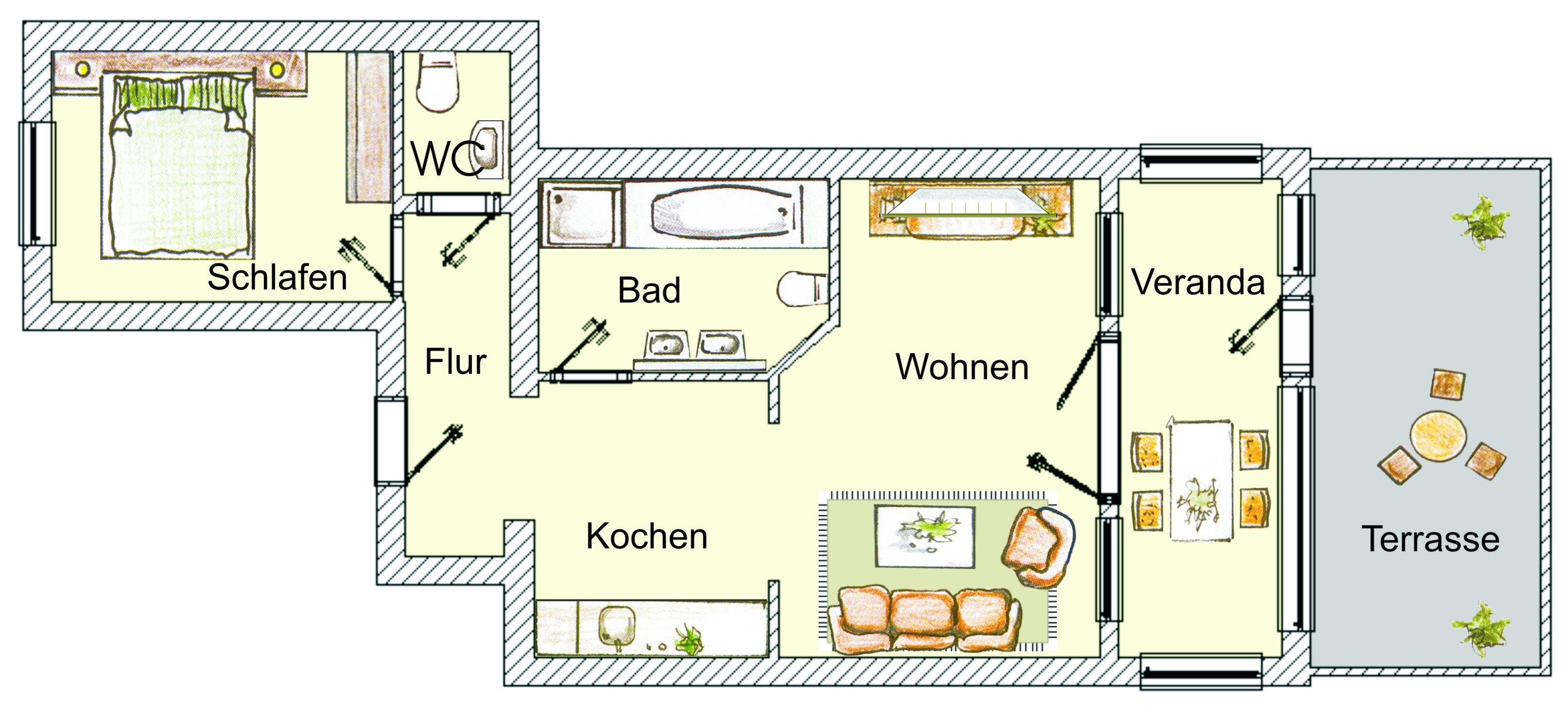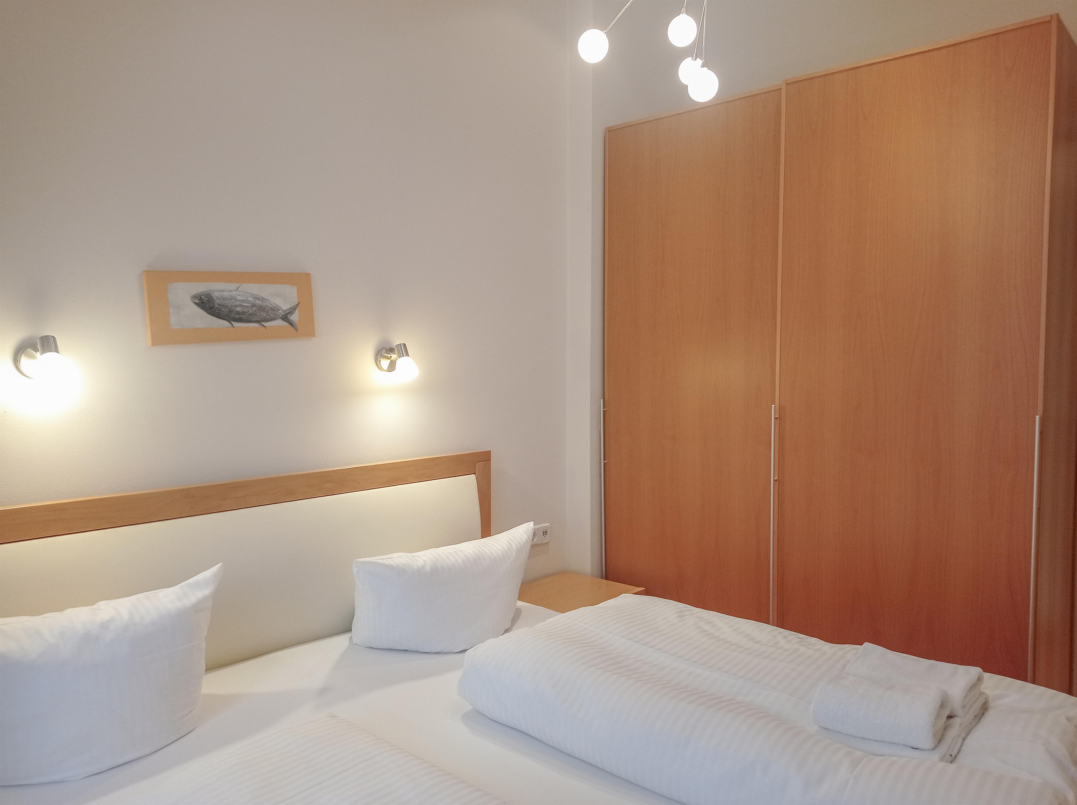 Dieses helle ca. 52 qm große 2- Zimmer Appartement liegt im Erdgeschoss und verfügt über eine Loggia sowie eine Terrasse zur Südseite, die zu jeder Jahreszeit viel Sonne versprechen. Die Lage des Hauses spricht für sich. Im Wohnraum steht den Gästen eine Couchecke mit Flat-TV und Radio/CD zur Verfügung. Offen im Wohnraum integriert befindet sich die Vollküche incl. Backofen-Ceranfeld, Geschirrspüler, Kühlschrank, Mikrowelle etc. Die Mahlzeiten können Sie in der sonnigen Loggia einnehmen. Das Schlafzimmer ist mit einem Doppelbett mit getrennten Matratzen (90 x 200) und ausreichend Schrankraum ausgestattet. Für eine dritte Person steht im Wohnzimmer ein Schrankbett zur Verfügung. Das moderne Bad ist ausgestattet mit Dusche sowie Badewanne und Waschtisch/WC. Darüber hinaus steht ein separates Gäste-WC zur Verfügung. Der Pkw-Stellplatz befindet sich auf dem Grundstück und ist der Wohnung zugeordnet. Waschmaschine und Trockner finden Sie im Keller.