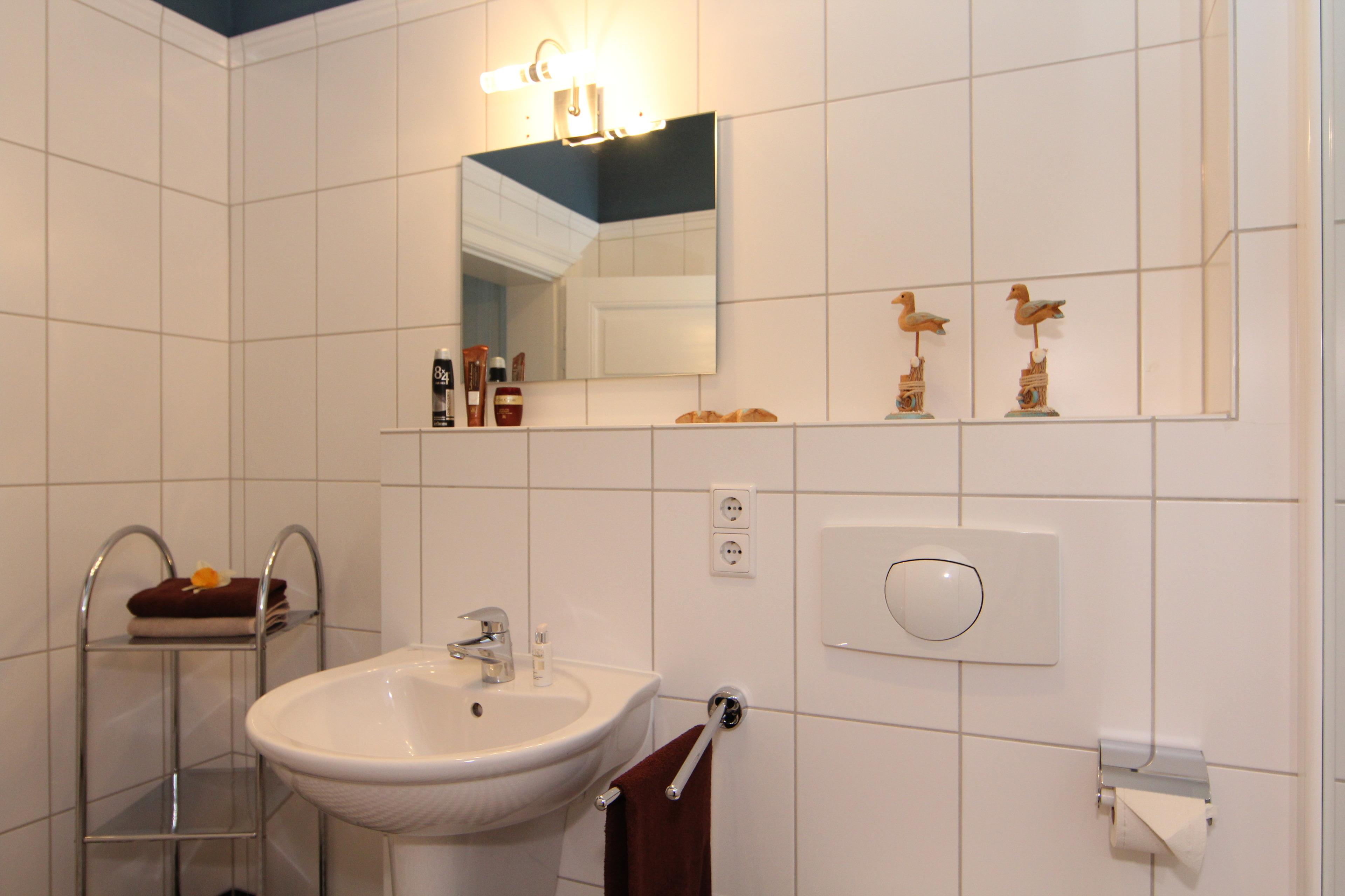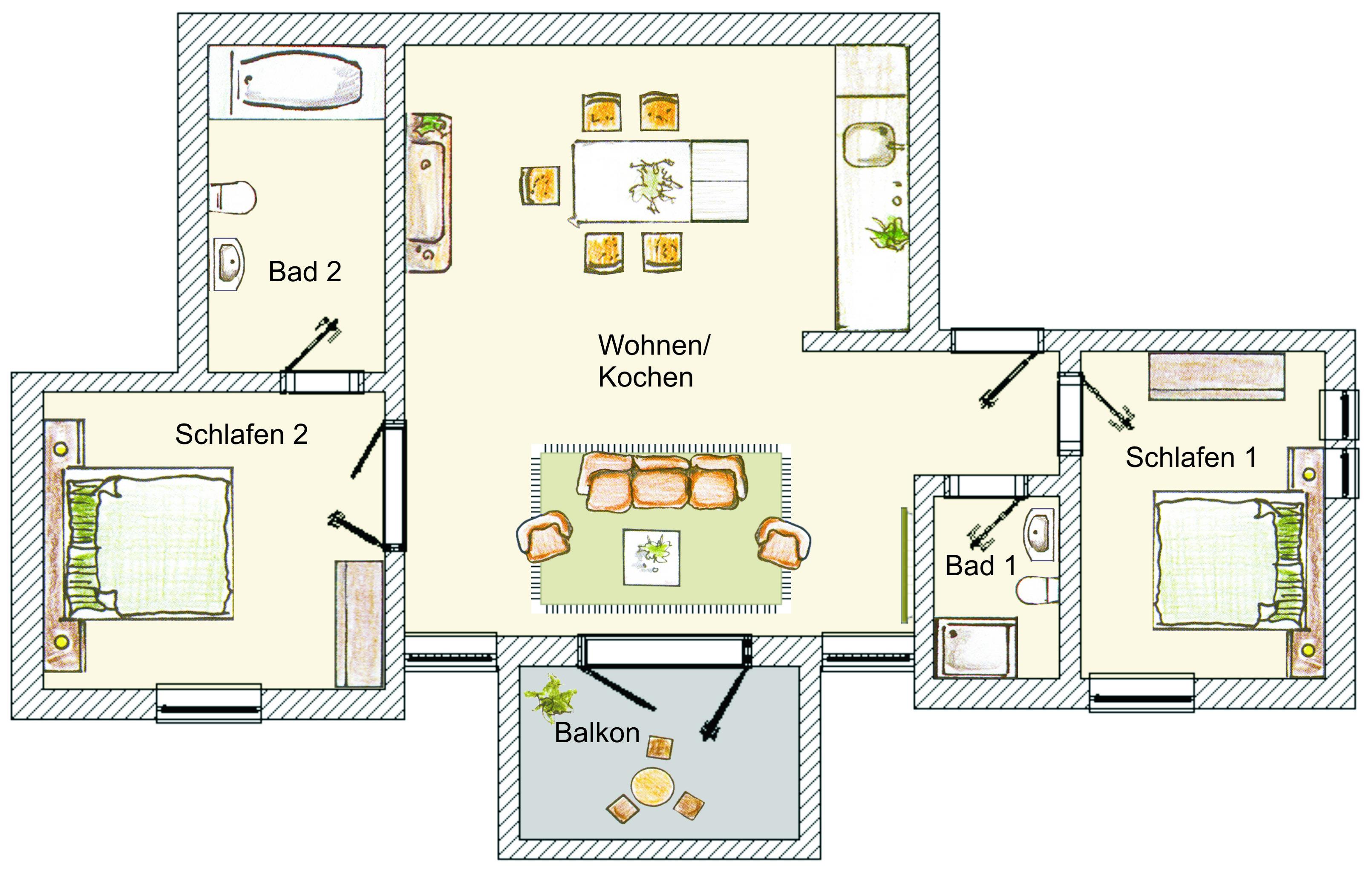 Dieses großzügige wunderschöne Urlaubsdomizil empfängt seine Gäste mit einer geschmackvollen modernen Möblierung. Die 75 qm große Drei-Zimmer-Wohnung befindet sich im 1. Obergeschoss und bietet viel Komfort. Der geräumige lichtdurchflutete Wohnraum verfügt über eine gemütliche Sitzgruppe mit Flat-TV, CD/DVD-Player und Radio. Ein großer Esstisch lädt Sie zu gemeinsamen Mahlzeiten ein. Der kleine Südbalkon, der vom Wohnraum zu begehen ist, verspricht fast den ganzen Tag Sonne. Die Vollküche mit Kühlschrank, Geschirrspüler, Ceranfeld, Backofen, p.p. ist ebenfalls offen im Wohnbereich integriert. Beide Schlafzimmer sind mit einem Doppelbett mit getrennten Matratzen (80 bzw. 90 x 200, durchgängiger Topper) und einem Kleiderschrank ausgestattet. Im gesamten Wohn- und Schlafbereich wurde der alte Dielenboden liebevoll aufgearbeitet und versprüht besonderes Flair. In den modernen Bädern, die jeweils einem Schlafzimmer angegliedert sind, finden Sie Waschtisch/WC und eine Badewanne bzw. eine Dusche. Ein Pkw- Stellplatz befindet sich auf dem Grundstück und ist der Wohnung zugeordnet.