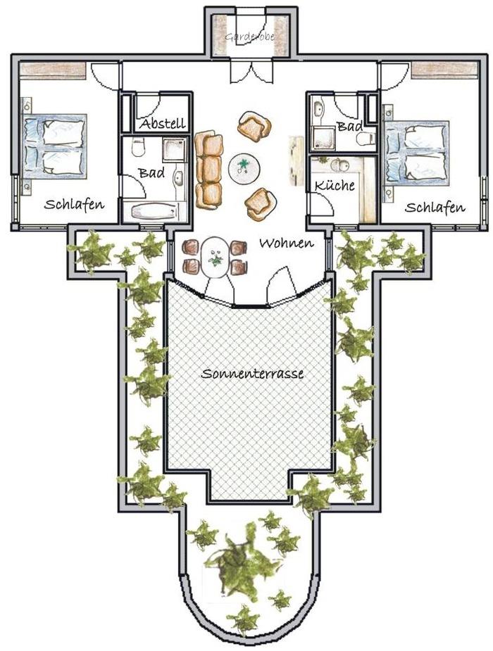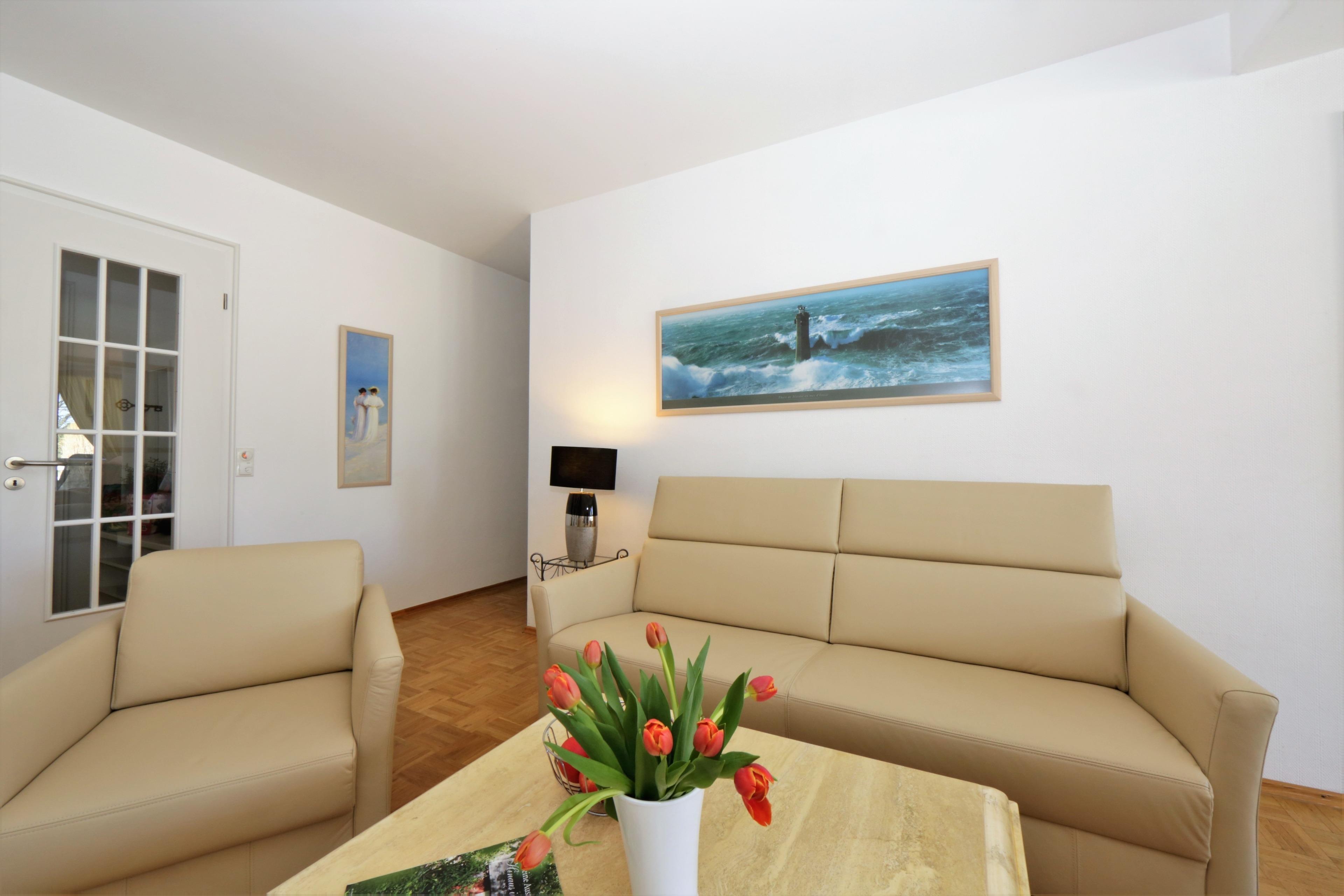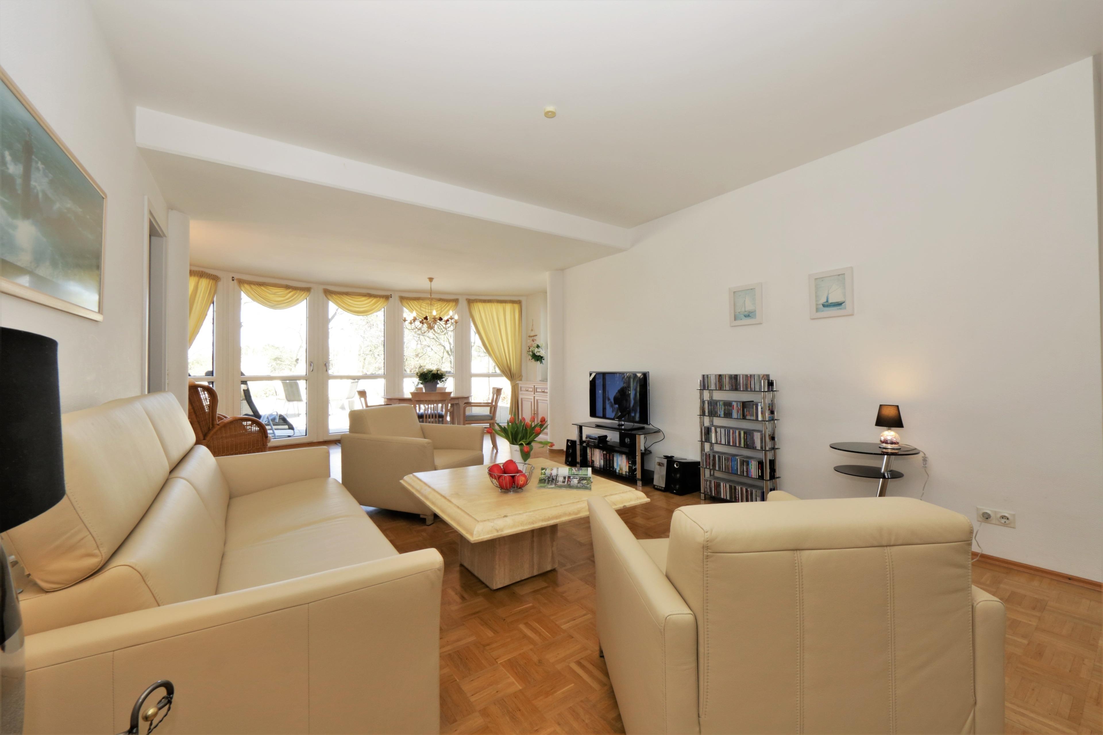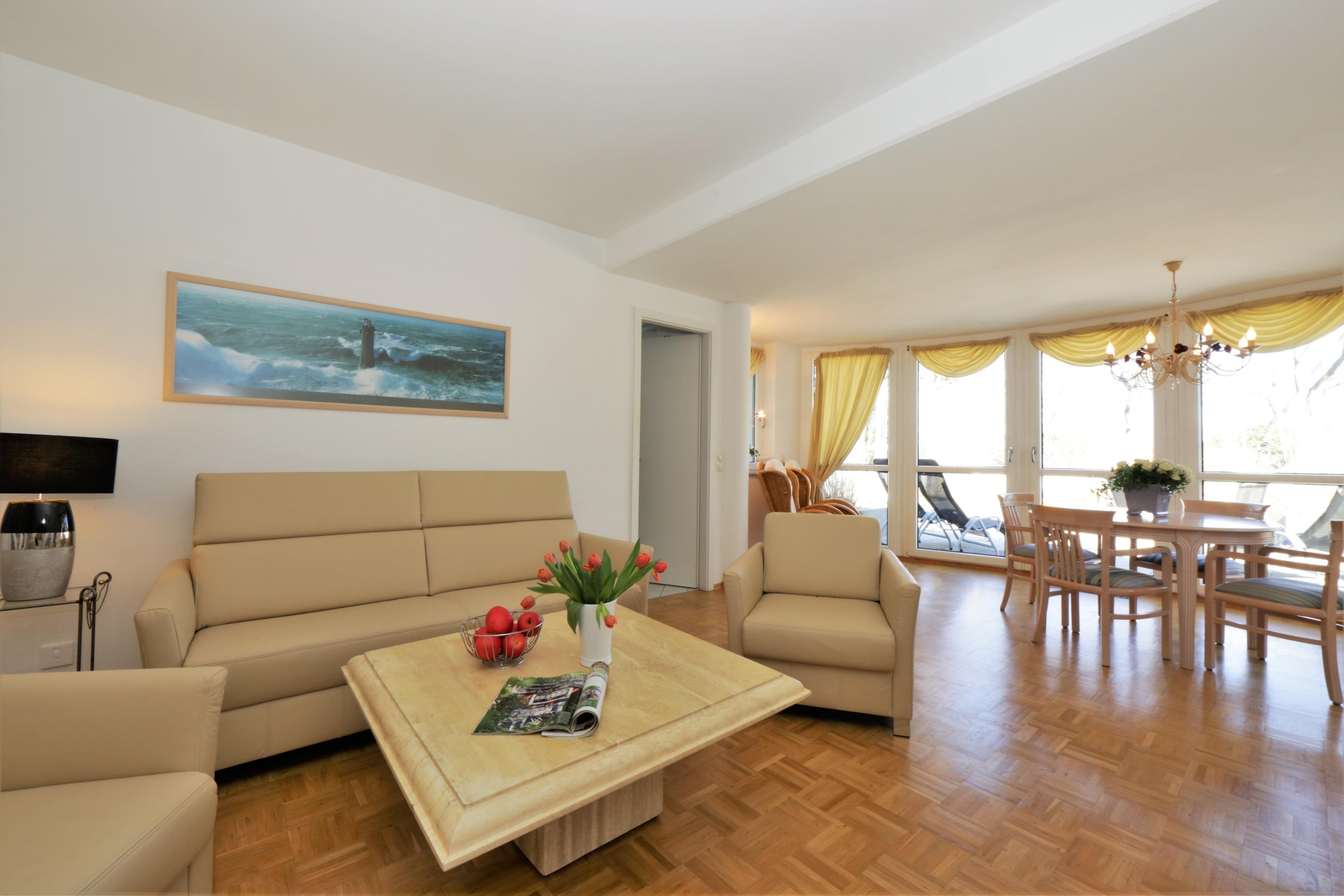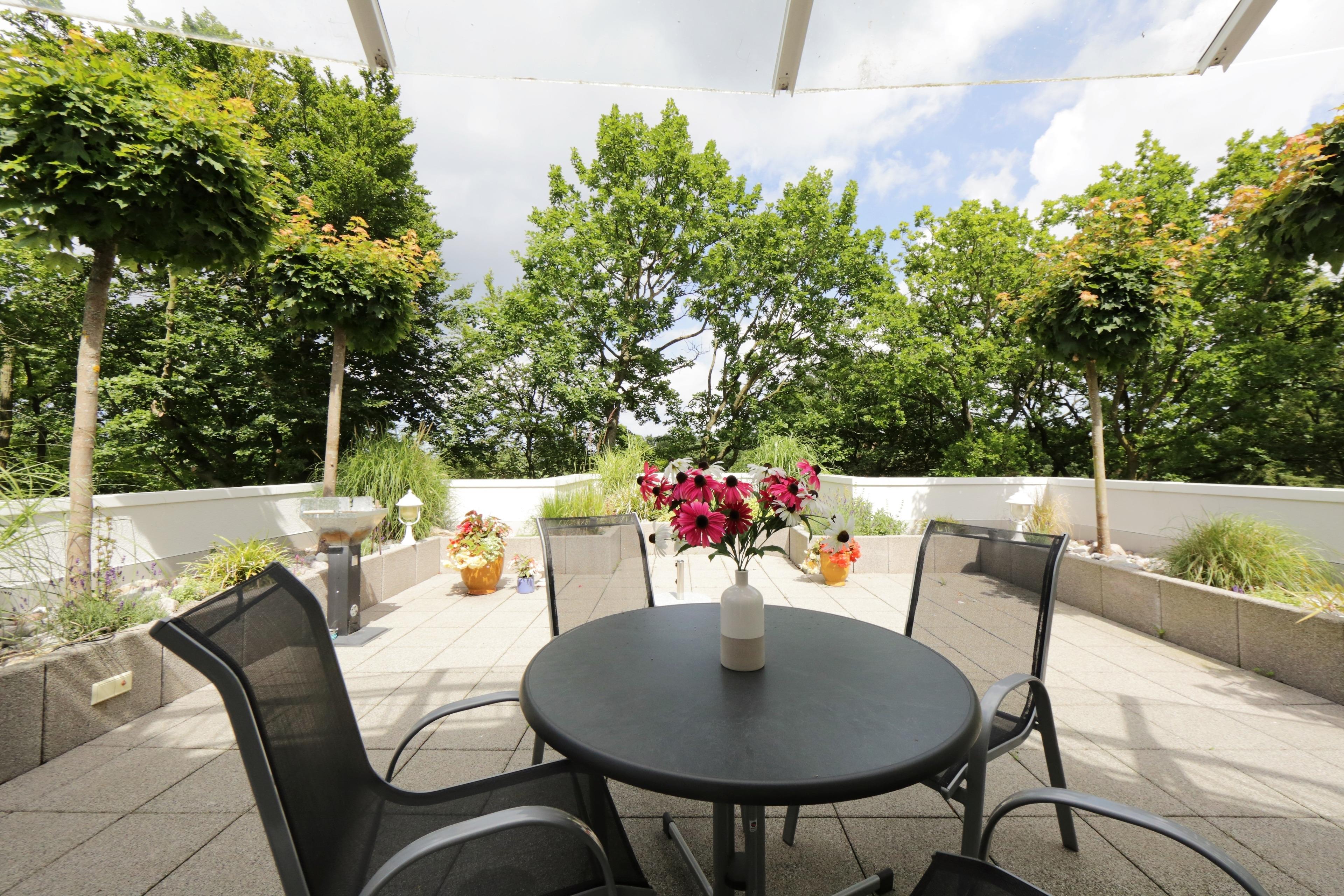 Dieses außergewöhnliche Appartement besticht nicht nur durch seine 1A Lage, sondern auch durch seine geschmackvolle und hochwertige Ausstattung. Erreichen können Sie dieses 111 qm große 3-Zimmer Appartement in der 3. Etage über einen Fahrstuhl. Sie betreten die Wohnung über einen kleinen Vorraum mit Garderobe und können durch die Glastür bereits den großzügigen Wohnbereich einsehen. Im Wohnraum erwartet Sie eine opulente Leder-Sitzgarnitur, Flat-TV und Radio/CD. Die große CD-Sammlung ist breit gefächert. Im Erker desselben Raumes steht ein Esstisch für 4 Personen, der zu Mahlzeiten in gemütlicher Atmosphäre einlädt. Zubereiten können Sie die Mahlzeiten in der vom Wohnraum abgehenden, separaten Küche mit einem Fenster. Die moderne Vollküche verfügt über alle Annehmlichkeiten wie Backofen mit Induktionsfeld, Geschirrspüler, Kühlschrank, Mikrowelle etc. Das Highlight dieser Wohnung ist die ca. 40 qm große Dachterrasse zur Seeseite von der aus Sie die Ostsee erahnen können. Mit ihrer ganzjährigen Bepflanzung stellt die Terrasse eine kleine Oase dar. Der Größe der Terrasse ist es zu verdanken, dass sie trotz ihrer Ausrichtung lange von der Sonne verwöhnt werden. Lassen auch Sie sich verwöhnen! Diese Wohnung verfügt darüber hinaus über zwei geräumige Schlafzimmer, ausgestattet mit jeweils einem Doppelbett mit getrennten Matratzen (100 x 200) und reichlich Stauraum. Den Schlafzimmern ist jeweils ein Bad zugeordnet, das mit Dusche und Waschtisch/WC ausgestattet ist. Das größere Bad bietet zusätzlich eine Badewanne. Der gesamte Wohn- und Schlafbereich ist mit Echtholzparkett ausgelegt. Ein Stellplatz für Ihr Fahrzeug befindet sich auf dem Grundstück und ist der Wohnung zugeordnet. Waschmaschine, Trockner und Fahrradabstellraum finden Sie im Keller.