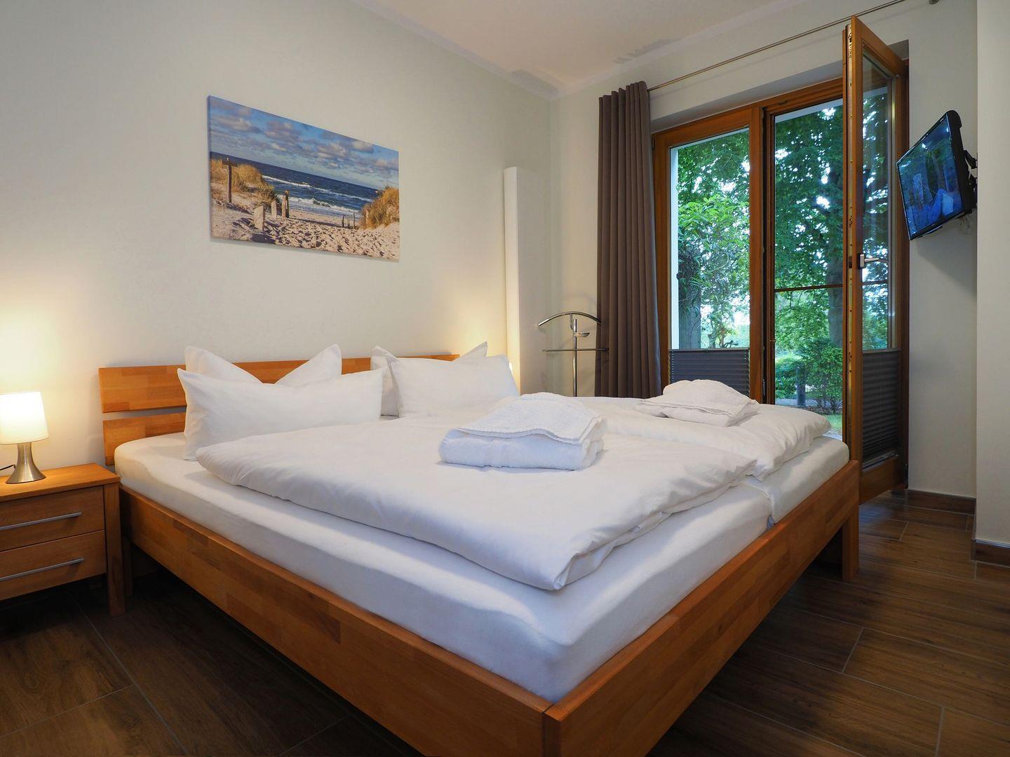Dieses komfortabel eingerichtete Appartement überzeugt mit hochwertigen Möbeln und einer privaten Terrasse. Die Küche ist voll ausgestattet und bietet neben einem Backofen mit Cerankochfeld, einen Geschirrspüler, eine Mikrowelle, einen Wasserkocher, eine Kaffeemaschine und einen Toaster. Im Wohnzimmer finden sich neben dem ausziehbaren Schlafsofa auch der LCD-TV, der DVD-Player und die Musikanlage. Das Schlafzimmer liegt separat und bietet ein Doppelbett. Das Badezimmer überzeugt mit einer geräumigen Dusche, einem Waschbecken, einem WC sowie einem großen Spiegel.