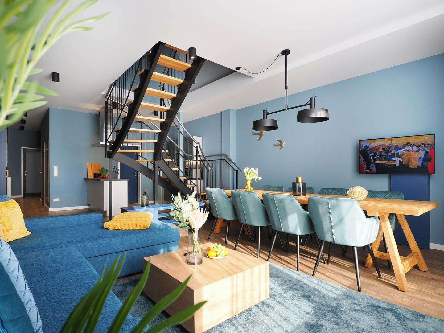 3-Raum Ferienwohnung mit 2 Schlafzimmern, Boxspringdoppelbetten, Eckschlafcouch im Wohnzimmer, Bad mit Dusche und Badewanne, Küche mit Cerankochfeld, Backofen, Küche mit Cerankochfeld, Kühlschrank mit Gefrierfach, Geschirrspüler und Mikrowelle, Smart-TV, Nichtraucher, Haustiere gestattet