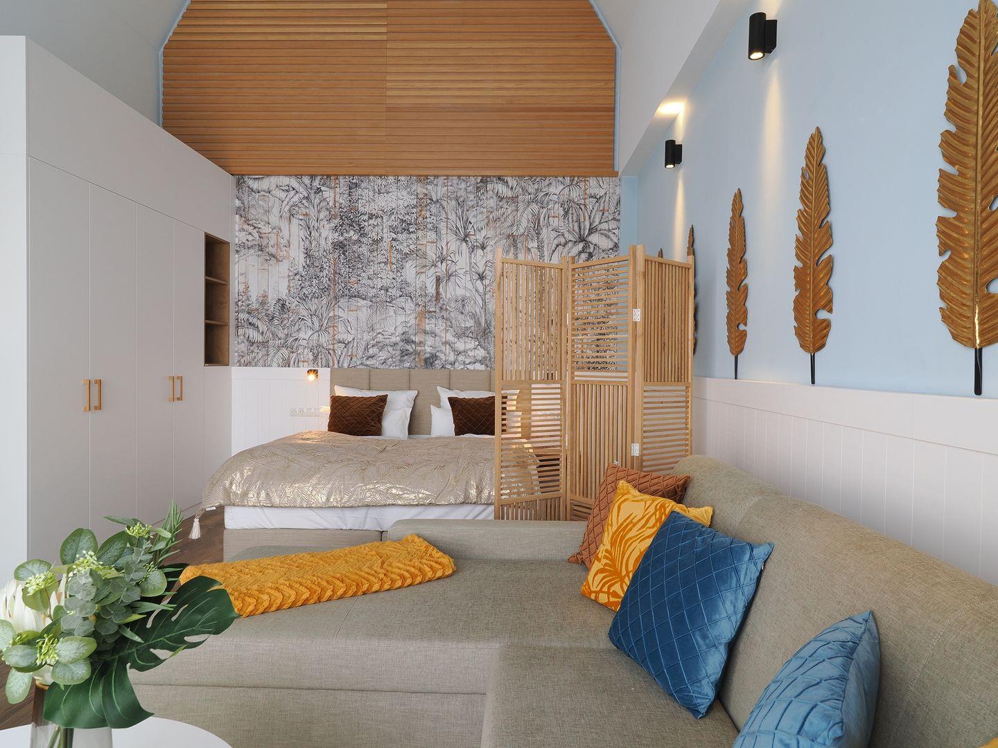 1-Raum Ferienwohnung mit Balkon, Bad mit Dusche, Küche mit Cerankochfeld, Backofen, Kühl-Gefrierkombination, Geschirrspüler und Mikrowelle, Smart-TV, Eckschlafsofa und Boxspringdoppelbett, Nichtraucher, Haustiere gestattet